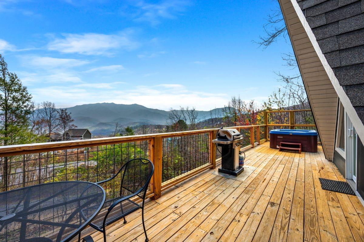 This one delivers what it promises: an unobstructed, 180-degree panorama of Mt. LeConte and the foothills of the Smoky Mountains, all from a spacious deck that guests never seem to want to leave. Guests who've visited Gatlinburg for 25 years tell us this one has the best view they've ever seen.