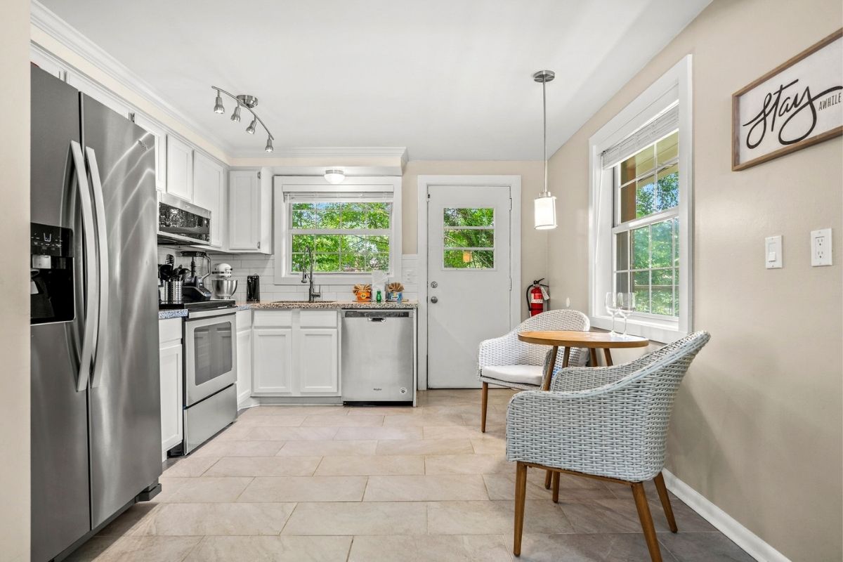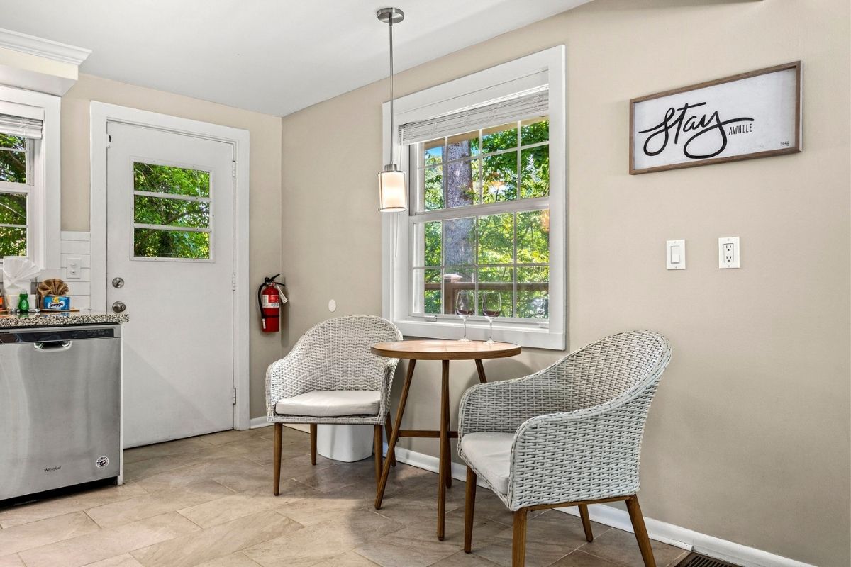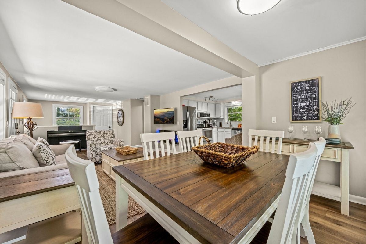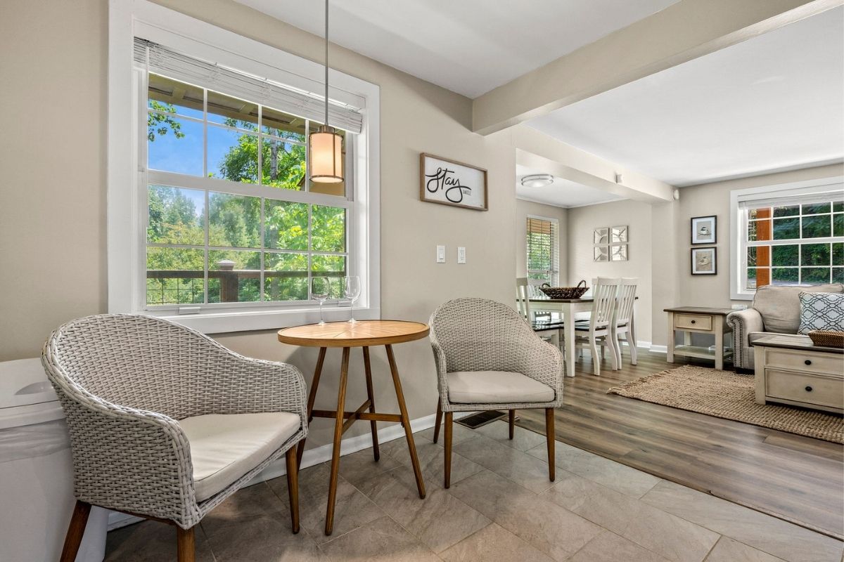 The dining area comfortably seats six, and the nearby kitchen nook is perfect for casual meals. The fully equipped kitchen has everything you need to whip up delicious meals—just bring your groceries! It even has a few specialty kitchen gadgets, including a Ninja blender and a KitchenAid mixer.