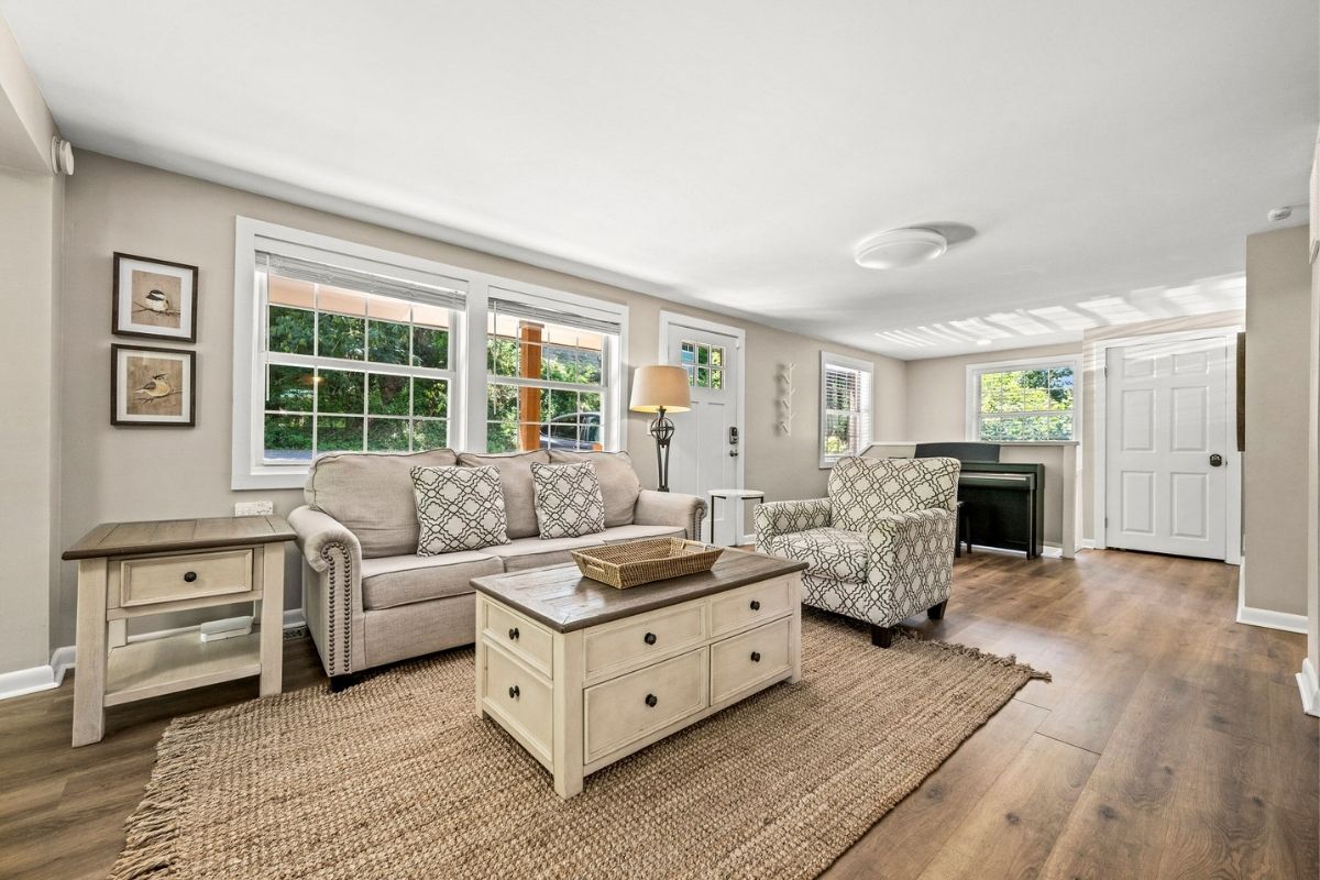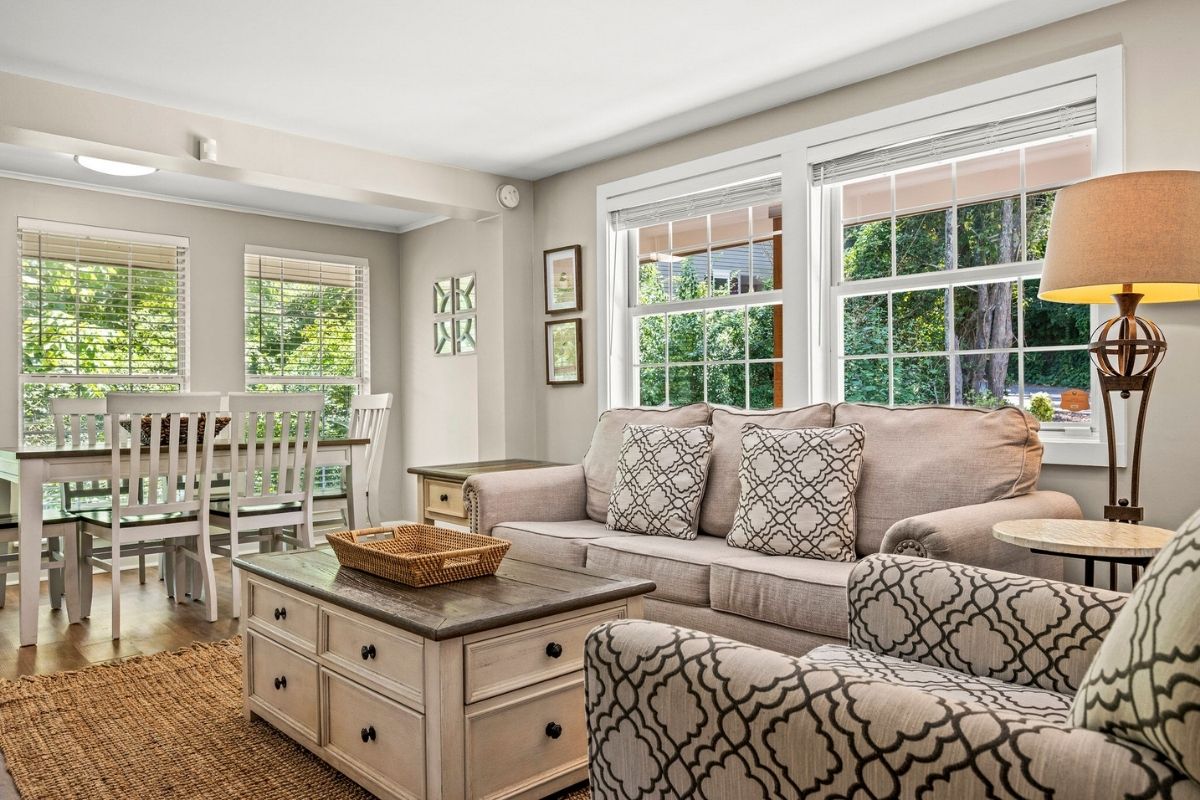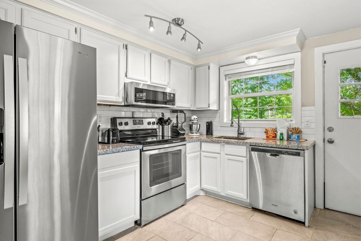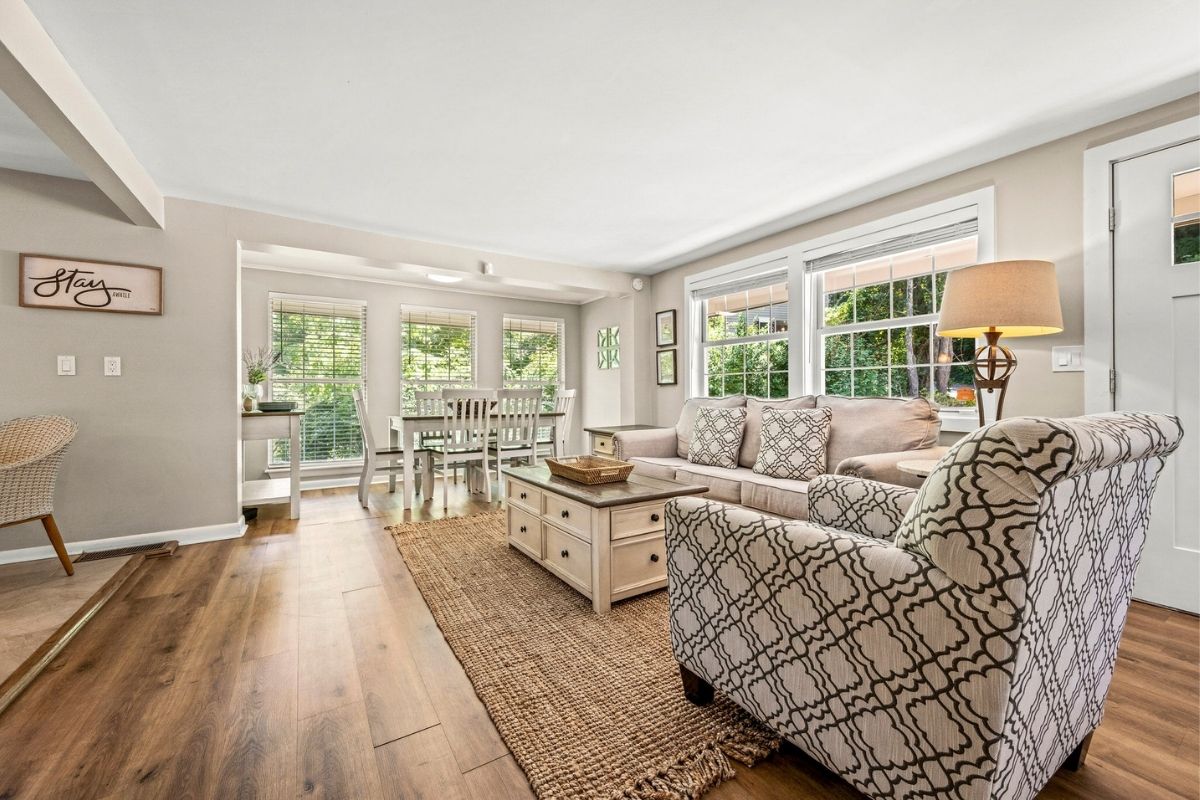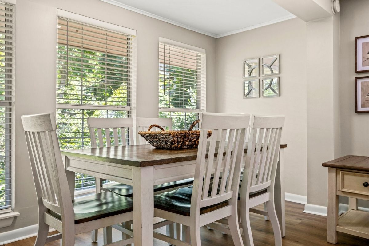 The dining area comfortably seats six, and the nearby kitchen nook is perfect for casual meals. The fully equipped kitchen has everything you need to whip up delicious meals—just bring your groceries! It even has a few specialty kitchen gadgets, including a Ninja blender and a KitchenAid mixer.