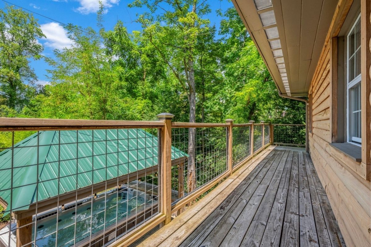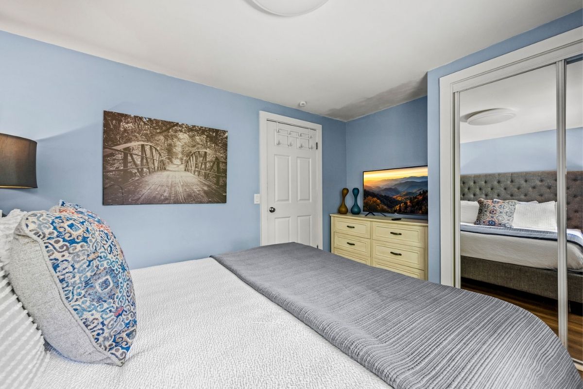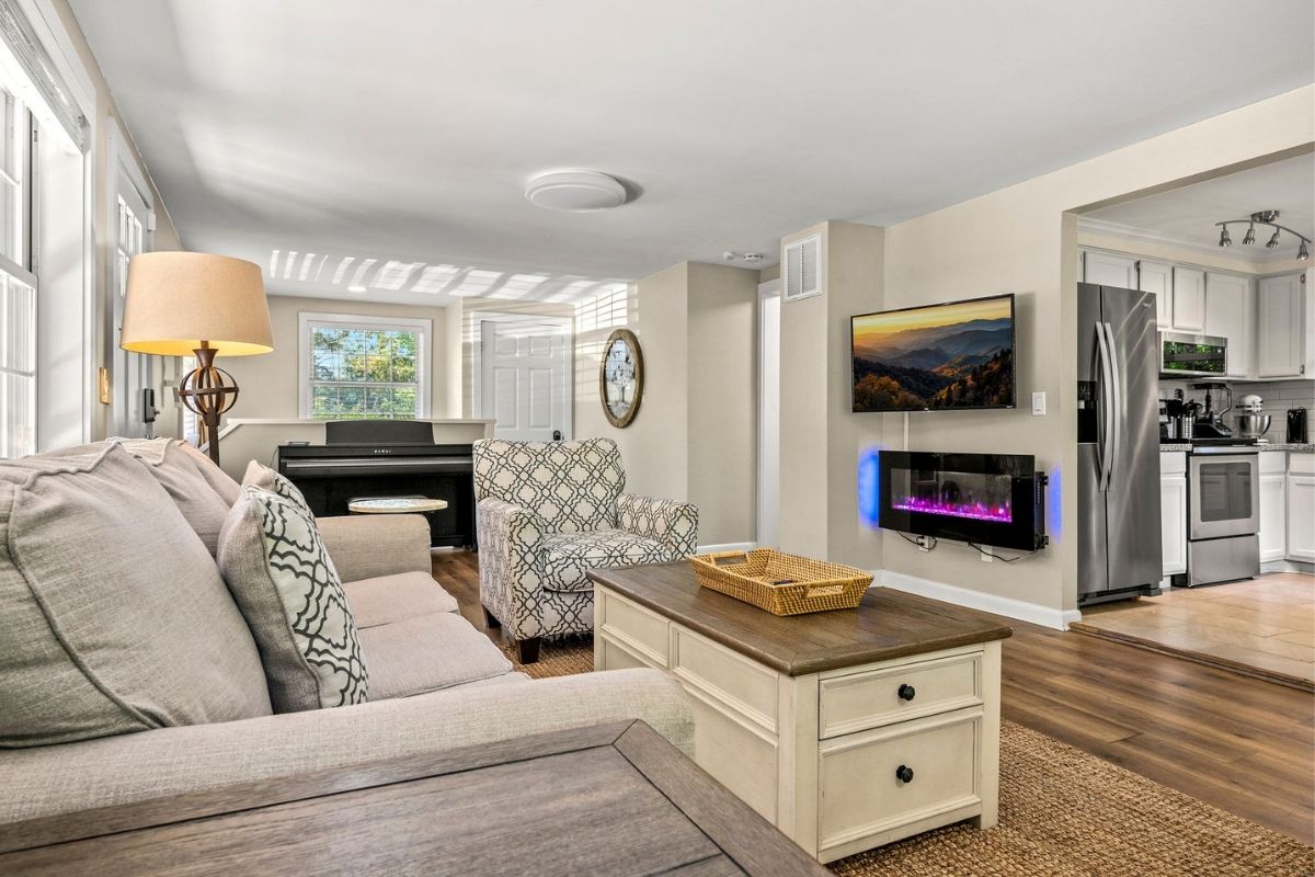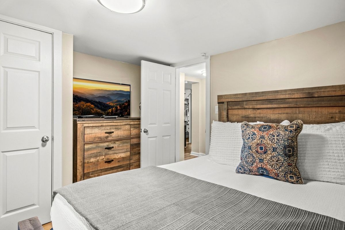 On the main level, there's also a full bathroom with a shower/tub combo, along with a queen bedroom with a memory foam mattress, luxury linens, and a large SmartTV. Outside, a main-level wrap-around porch allows you to soak in the serene Smoky Mountain surroundings.