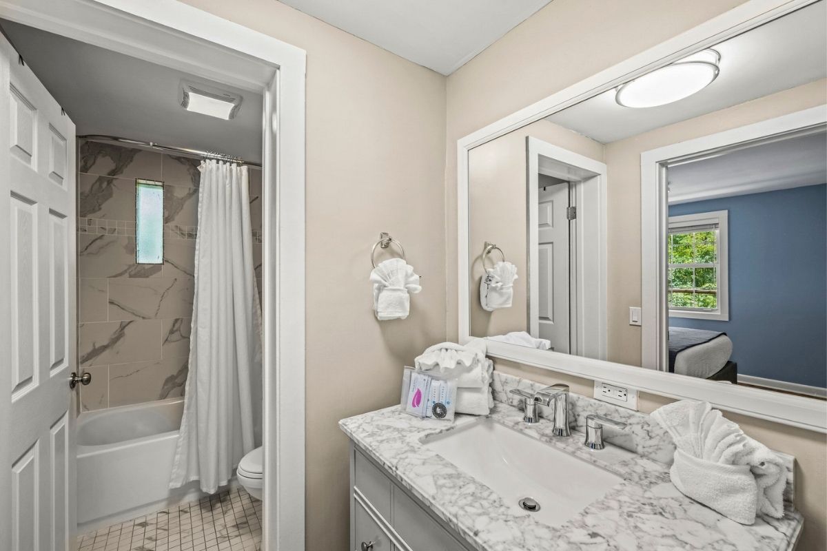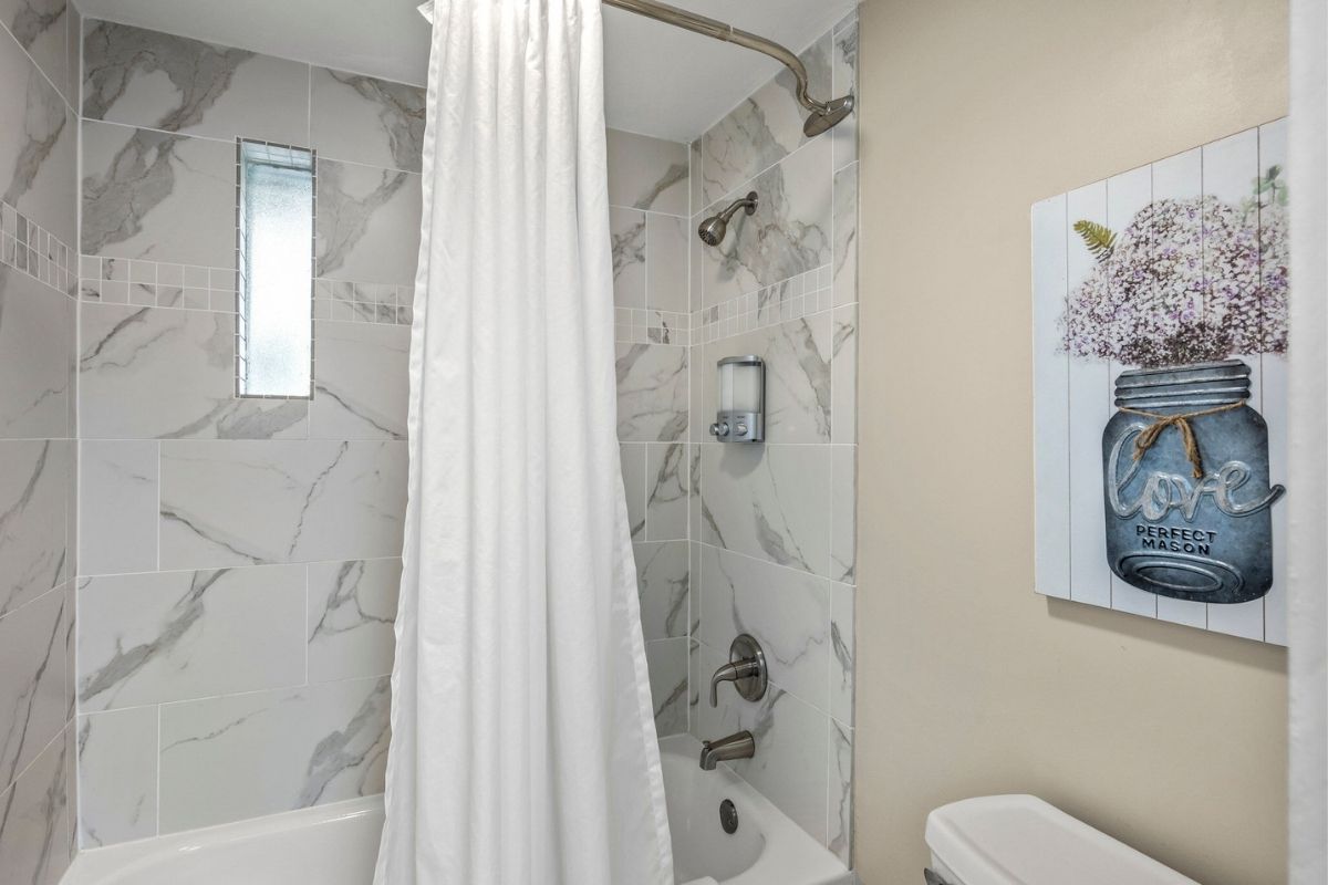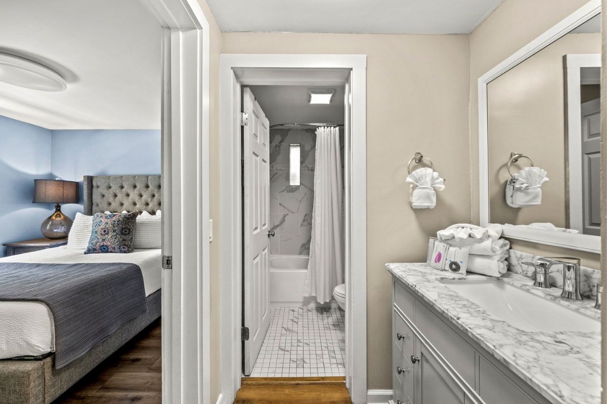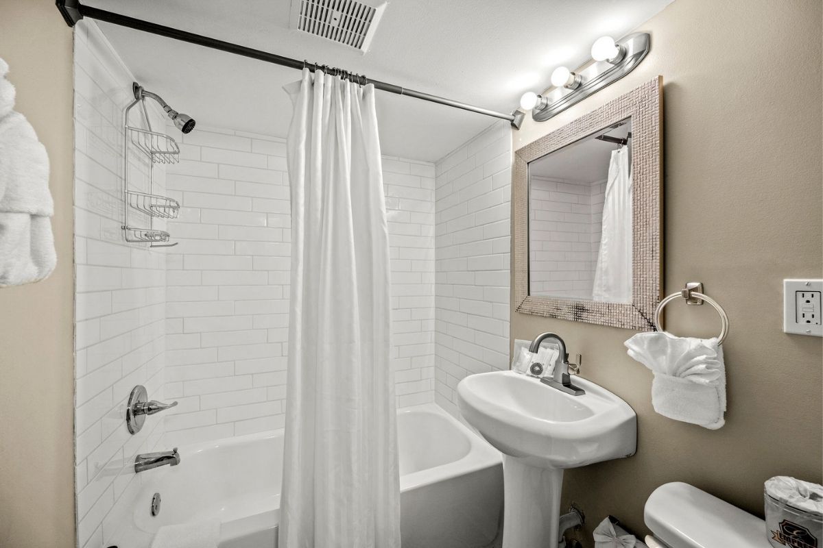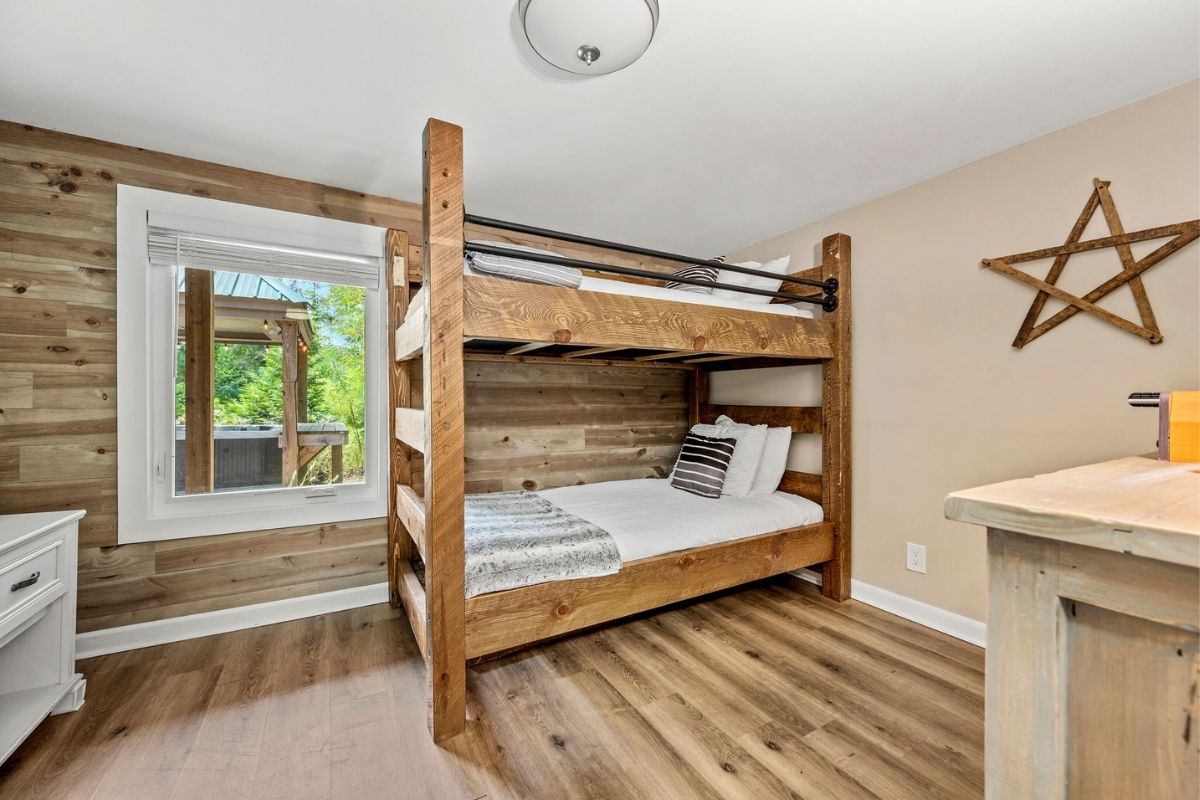 Down a short hallway, you'll find another full bathroom with a shower/tub combo and two additional bedrooms: a fun twin-over-twin bunk room with a large SmartTV and a queen bedroom with its own large SmartTV.