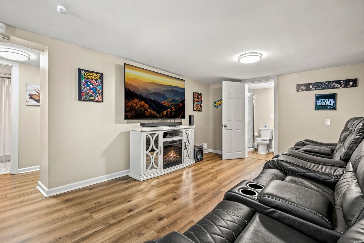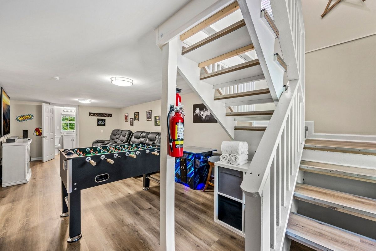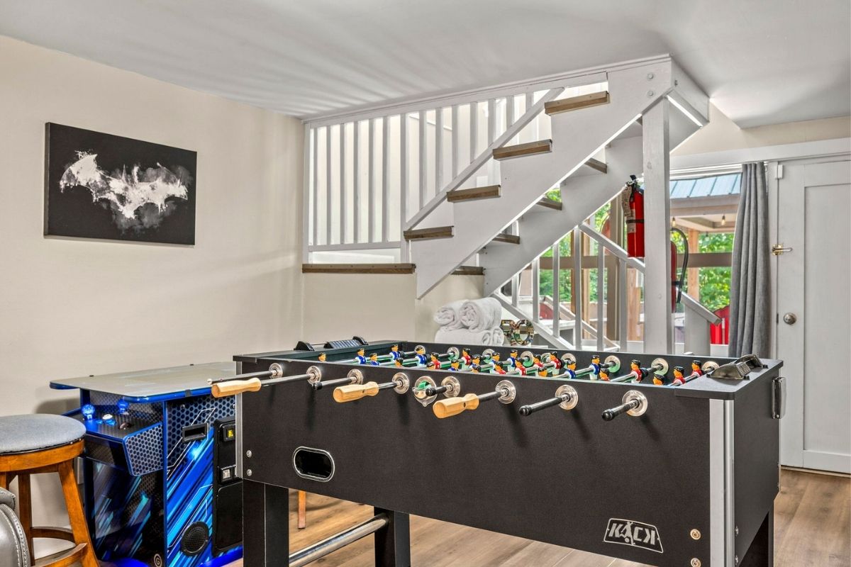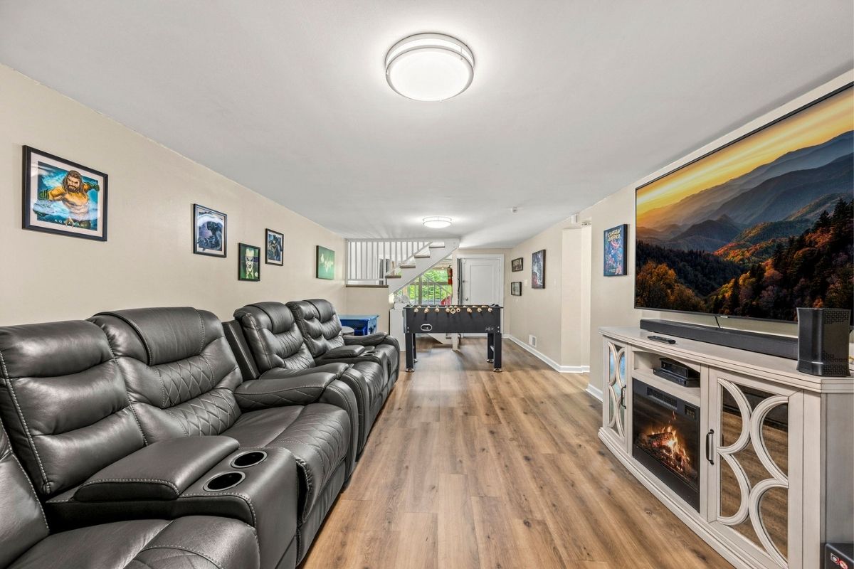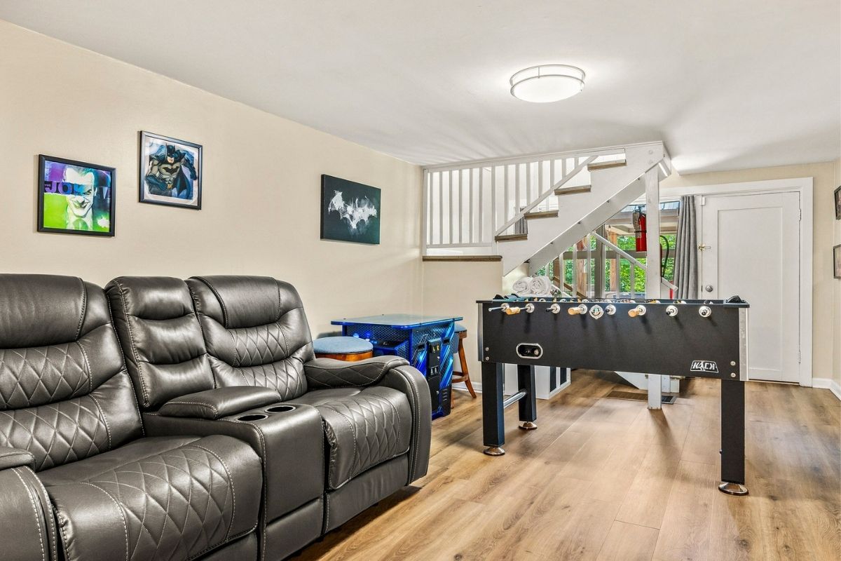 * Theater/game room in the basement w/reclining theater seats, a massive SmartTV, an arcade game, and a foosball table