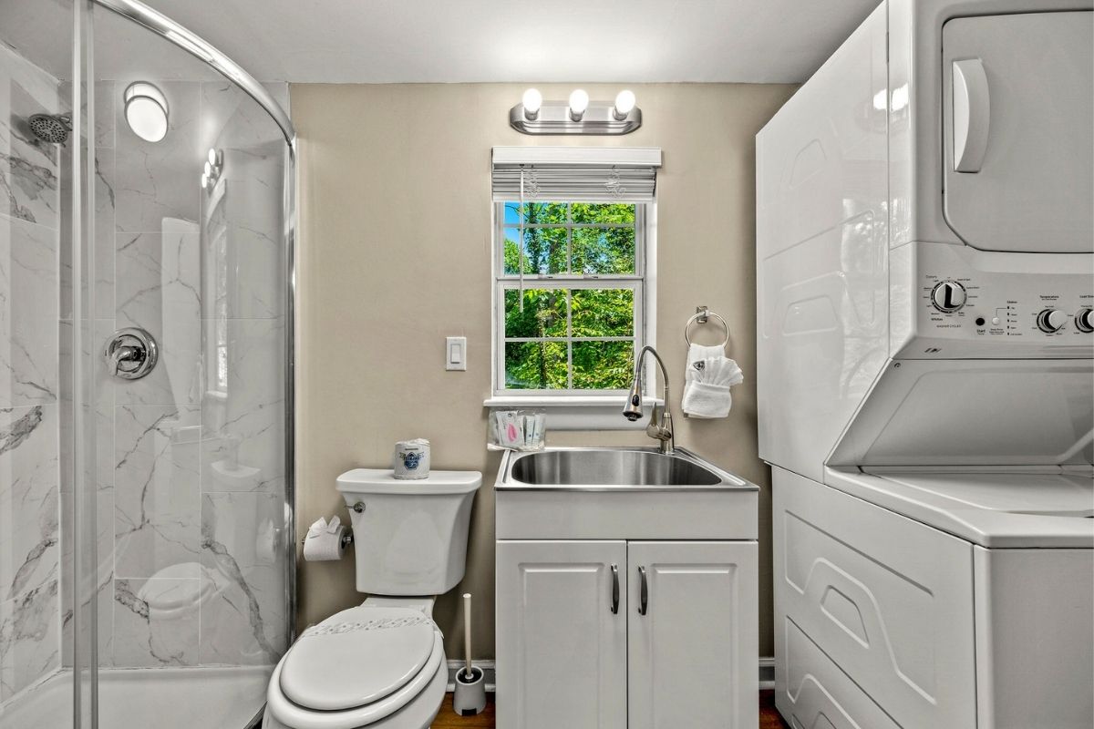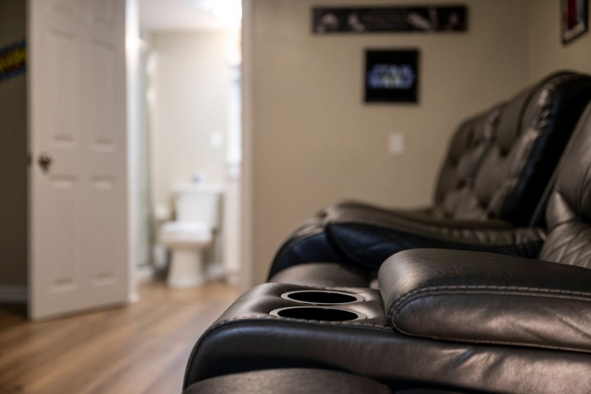Head downstairs to discover a fantastic movie and game room. Enjoy a movie night on the massive SmartTV from the comfort of plush theater-style recliners, or challenge your friends to a game of foosball or some digital competition on the multicade arcade table. This area is conveniently served by a full bathroom with a shower and a stackable washer/dryer.