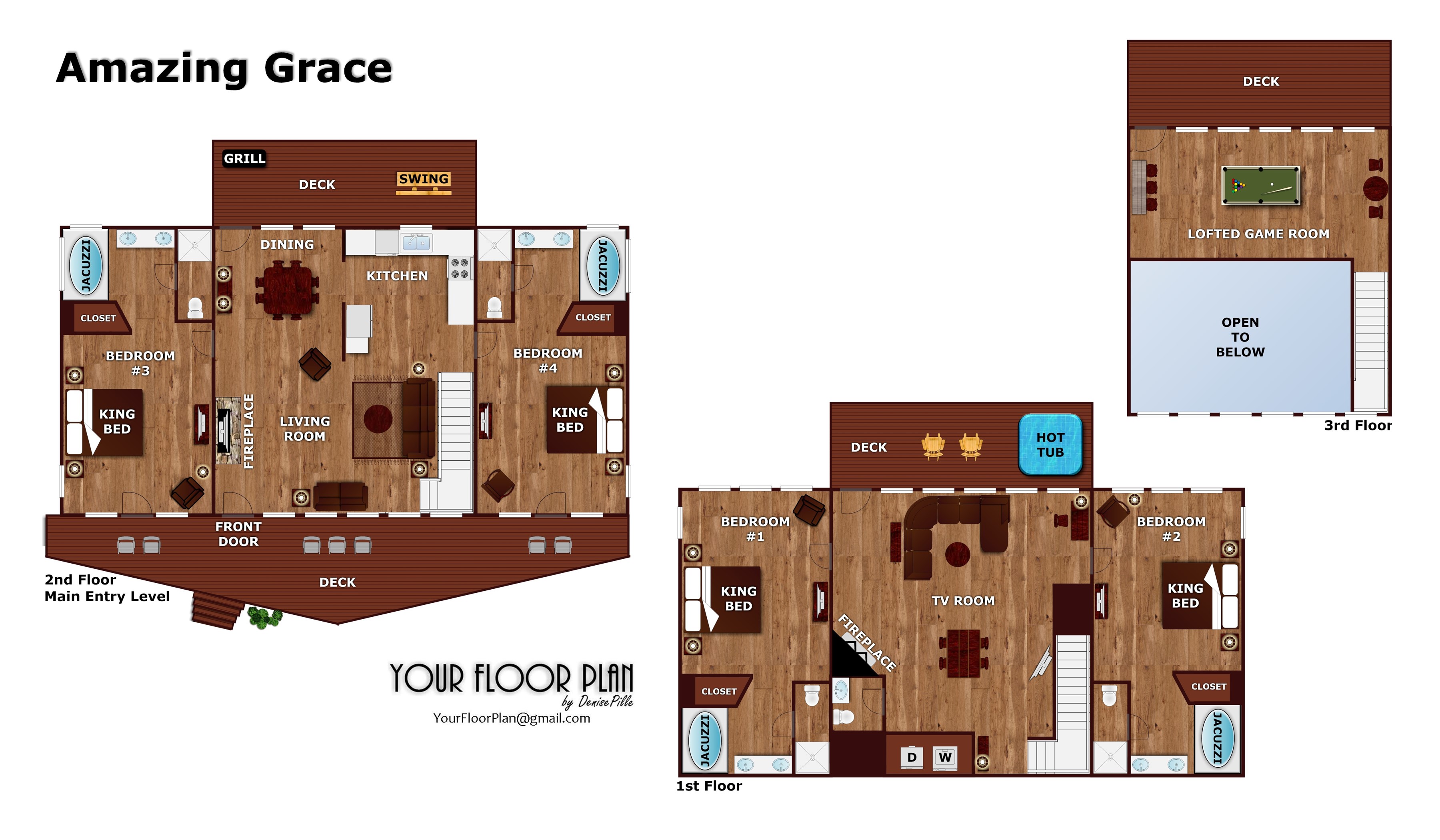 My group of friends and I have been traveling to Gatlinburg, TN annually for over 20 years. Mountain Laurel Chalets is are go to rental company; we try a new chalet each year. This year we stayed in Amazing Grace and had several discussions about returning to the chalet for future visits. There was plenty of room for everyone to gather together or to find peace and quiet on their own. Each bedroom is like a master suite and there are three balconies and a large(uncovered)front porch.