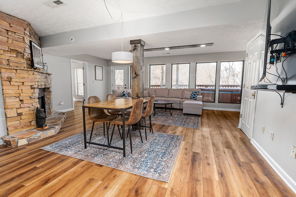 Inside, the main level features a bright living room with large windows, plush furnishings, a gas fireplace, and a SmartTV with cable. The open-concept dining and renovated kitchen areas offer plenty of space, and the kitchen is fully equipped for the chef in your group. The deck features a gas grill and provides a peaceful and private wooded view, perfect for enjoying your morning coffee. Also on the main level are two king bedrooms with ensuite bathrooms and whirlpool tubs. Upstairs, a loft with a pool table and a small deck provides additional entertainment and outdoor seating.