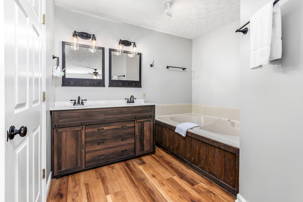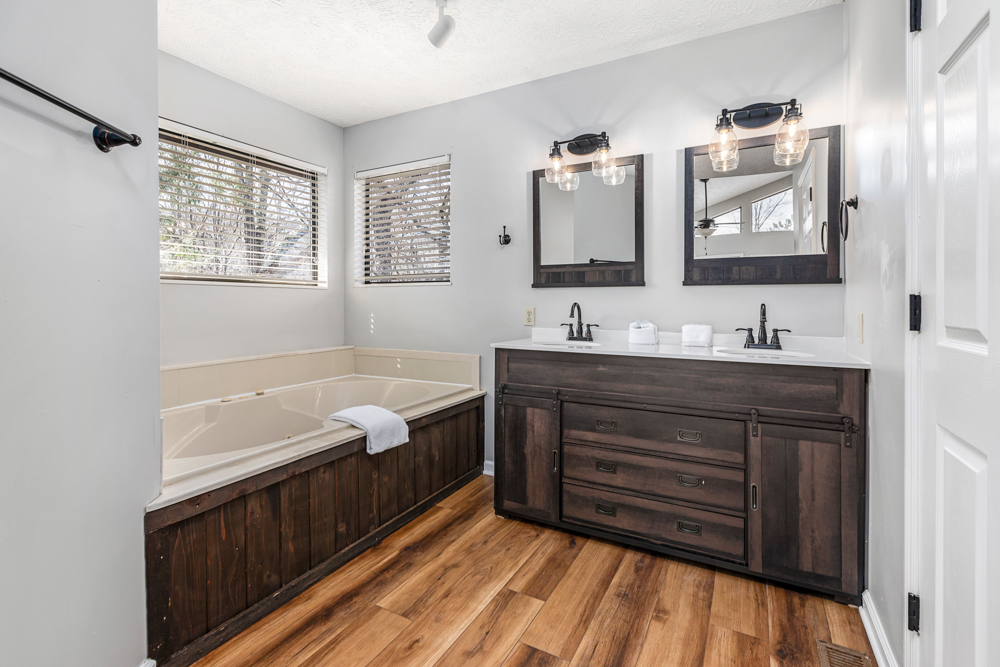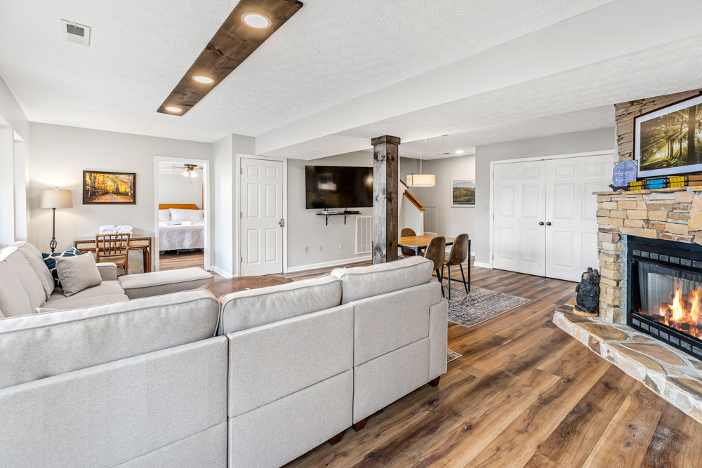 The lower level surprises with a second living area, perfect for kids (or kids at heart). It offers a sectional sofa, gas fireplace, TV, and game table. A half bath is available to those enjoying the gathering space. Two more king bedrooms with ensuite bathrooms and whirlpool tubs are located on either side. A laundry closet with a washer and dryer is also available for your convenience (just bring detergent). Outside, the lower level deck features a large hot tub, ideal for unwinding after a day of exploration.
