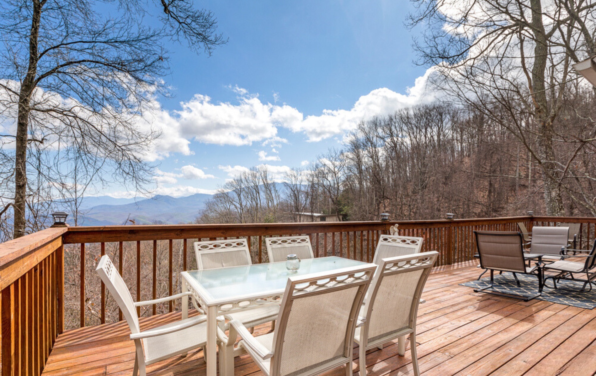 Thanks for the review. The view is awesome from the deck, but you are correct the motion recliners do somewhat block the view out the living room windows. Next time, check out the view from the hot tub. It's beautiful! We look forward to see you again.Mountain Laurel Chalets staff