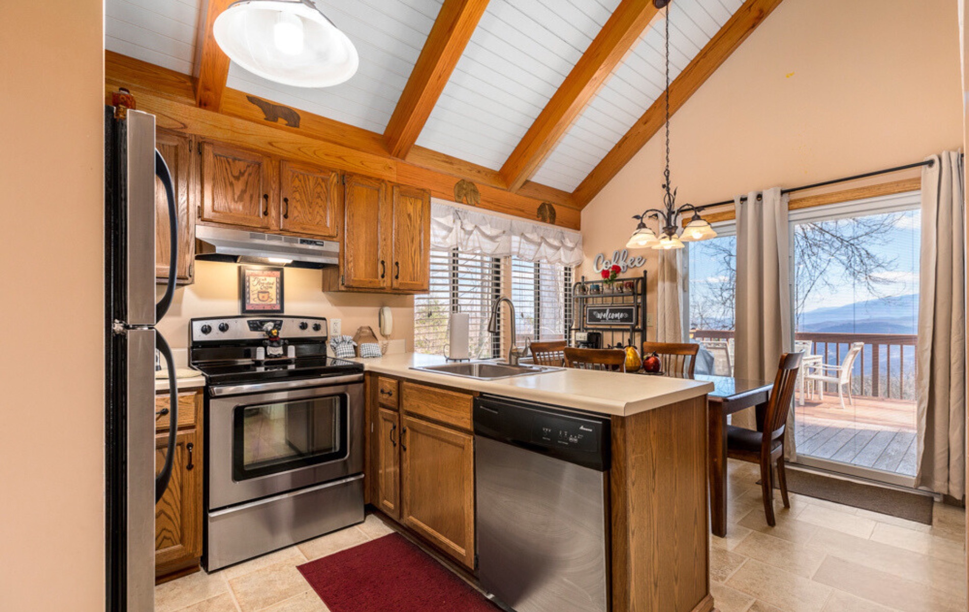 The view of the Great Smoky Mountains and Gatlinburg from the deck was amazing. Very peaceful and relaxing. The chalet was clean, comfortable and nicely decorated. We saw bears every day. Mommas with twins, triplets and even a momma with quadruplets. And yes, the bears can climb on to the deck. Keep the grill clean and your food inside! It is their world so respect them and you'll be fine. Loved seeing them. The road to the chalet is a bit steep and winding but it is the mountains and the view and peace is worth it. We will be back.Gretchen B. - Posted: 5/15/2016
