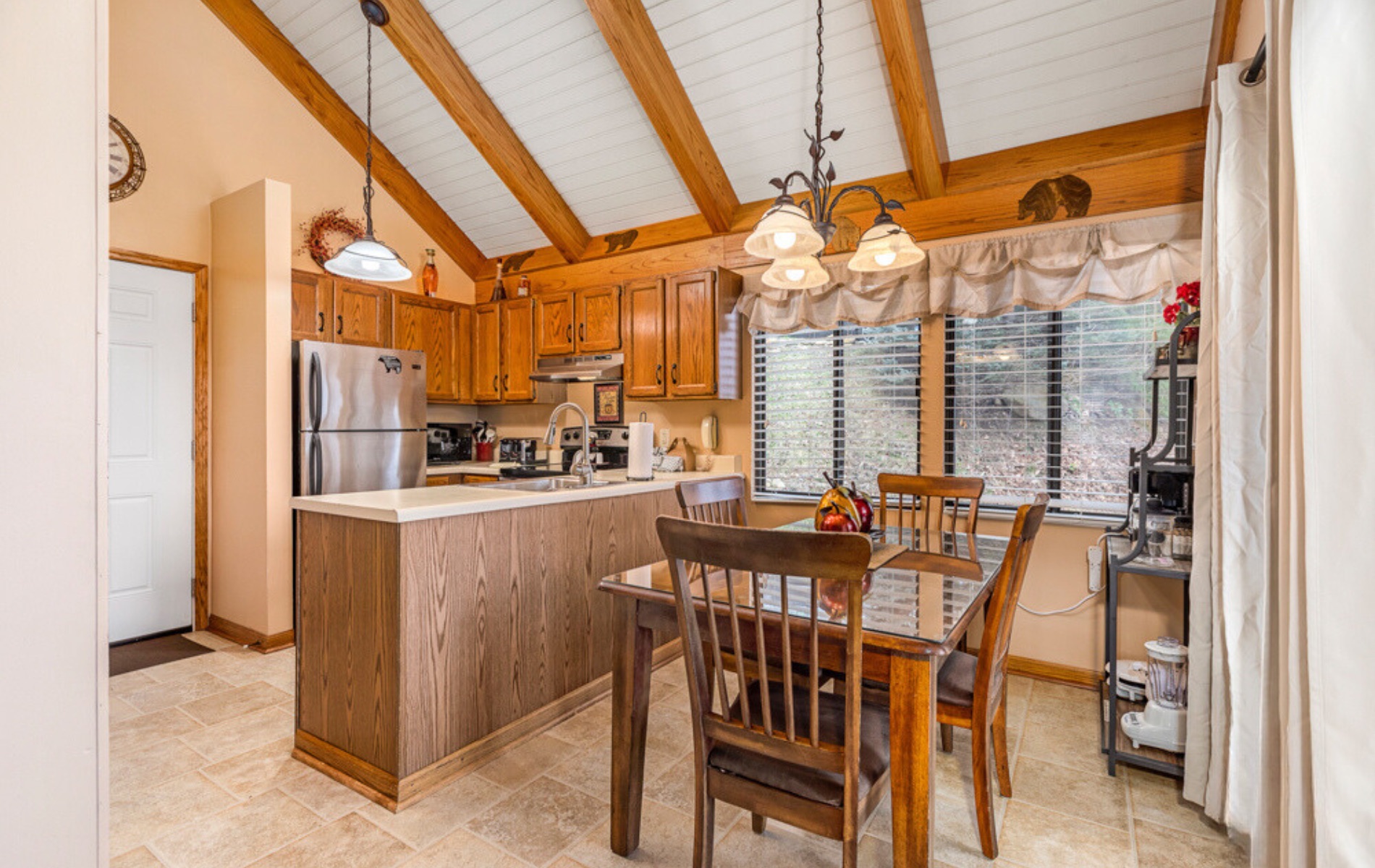 Step inside the home and you'll be greeted by a spacious and well-lit living area adorned with inviting furnishings, including two La-Z-Boy reclining sofas. Curl up in front of the wood-burning fireplace or enjoy your favorite shows on the large TV with a DVD player. The extra-large windows add a touch of luxury to the ambiance.