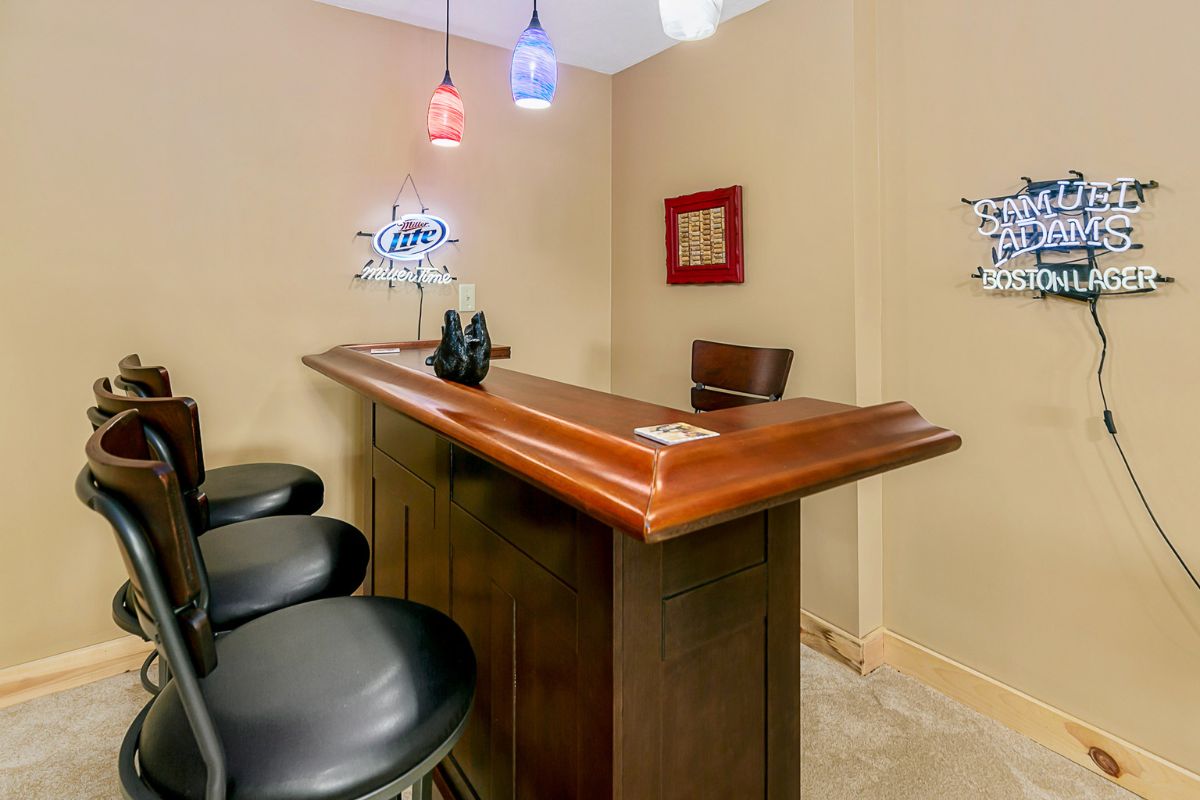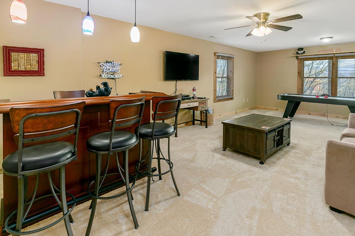 The lower level is where the real fun begins! A full bathroom awaits bath lovers with an antique claw foot tub, complete with an elegant crystal chandelier overhead. Next door is a large game room featuring a walk-up bar, an air hockey table, and a large screen SmartTV. You can access movie apps using your own login credentials.