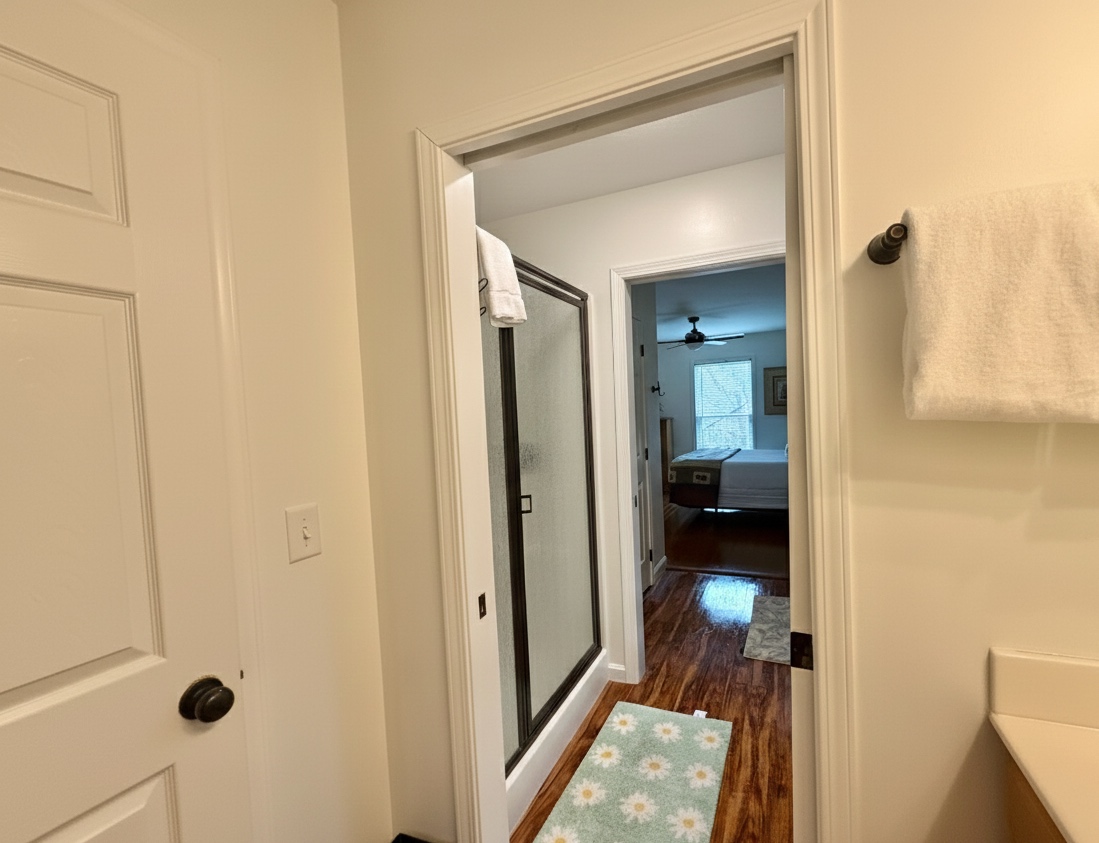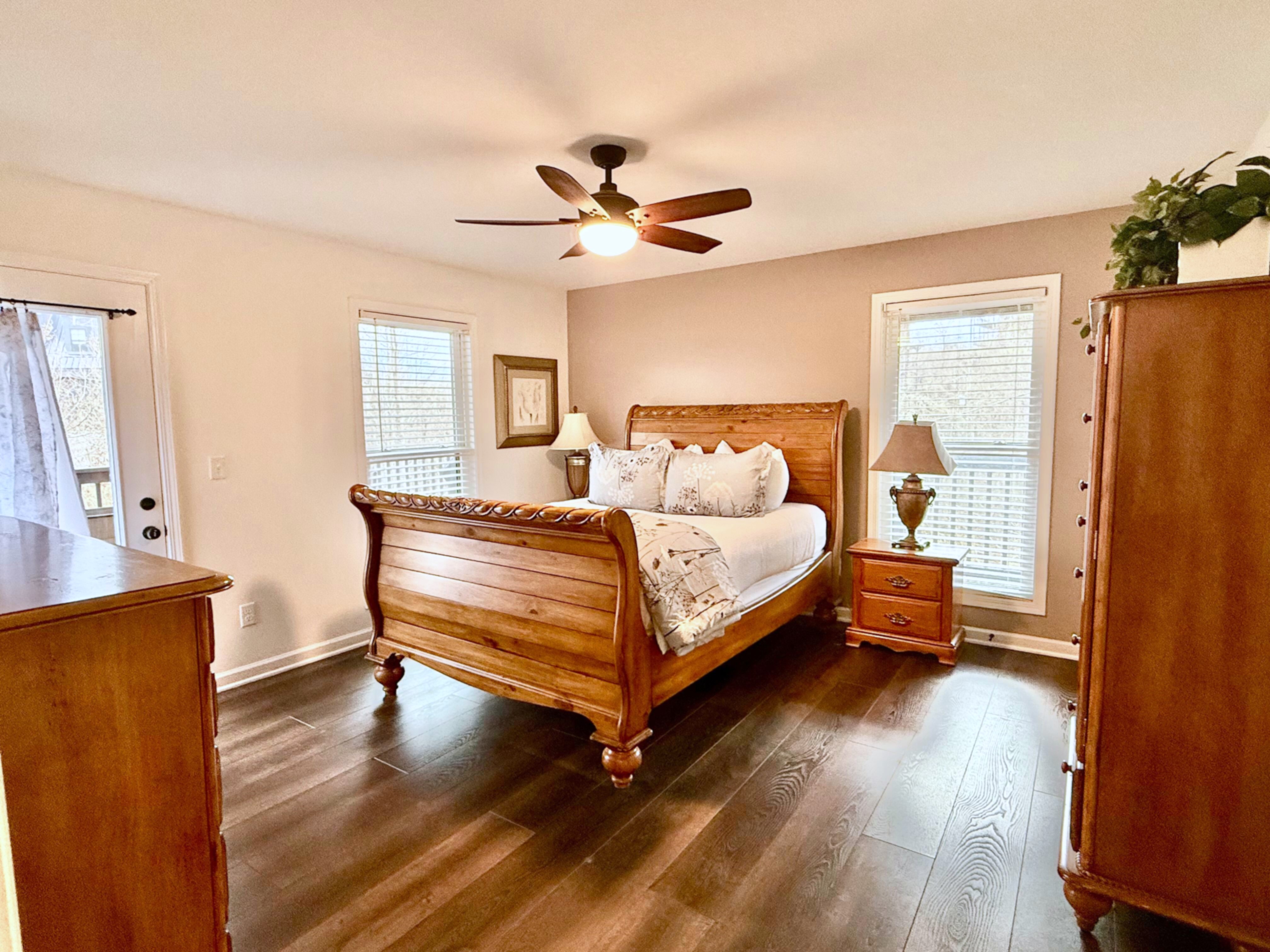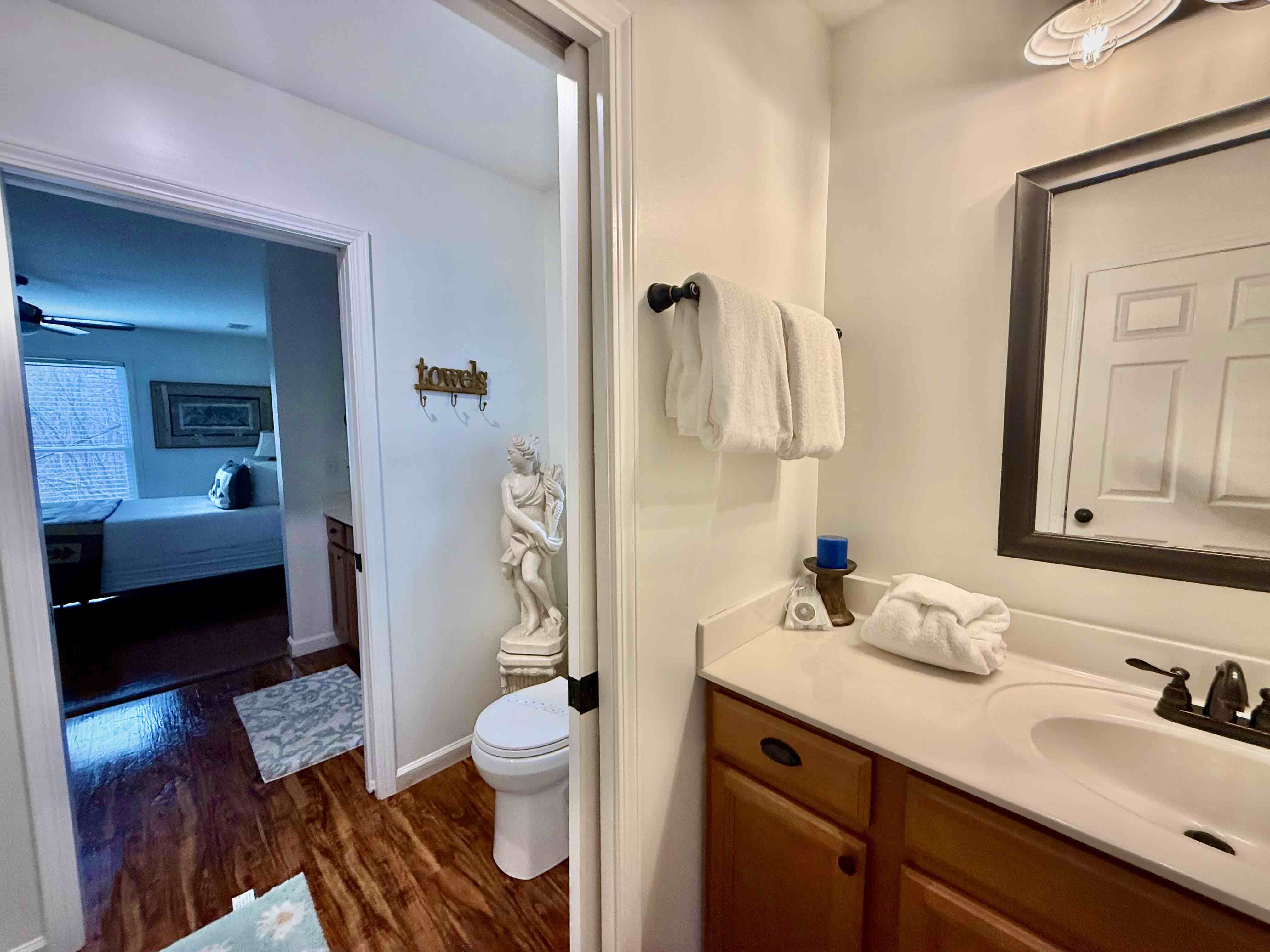 Upstairs, you'll discover a cozy gathering spot on the landing with a comfy sofa for lounging, along with three comfortable bedrooms. One of the bedrooms boasts a king bed, a TV, a private ensuite bath, and access to a private deck. The other two bedrooms feature queen beds, and each have a TV. They share a Jack and Jill style bathroom with separate sinks and a shared toilet and shower area.