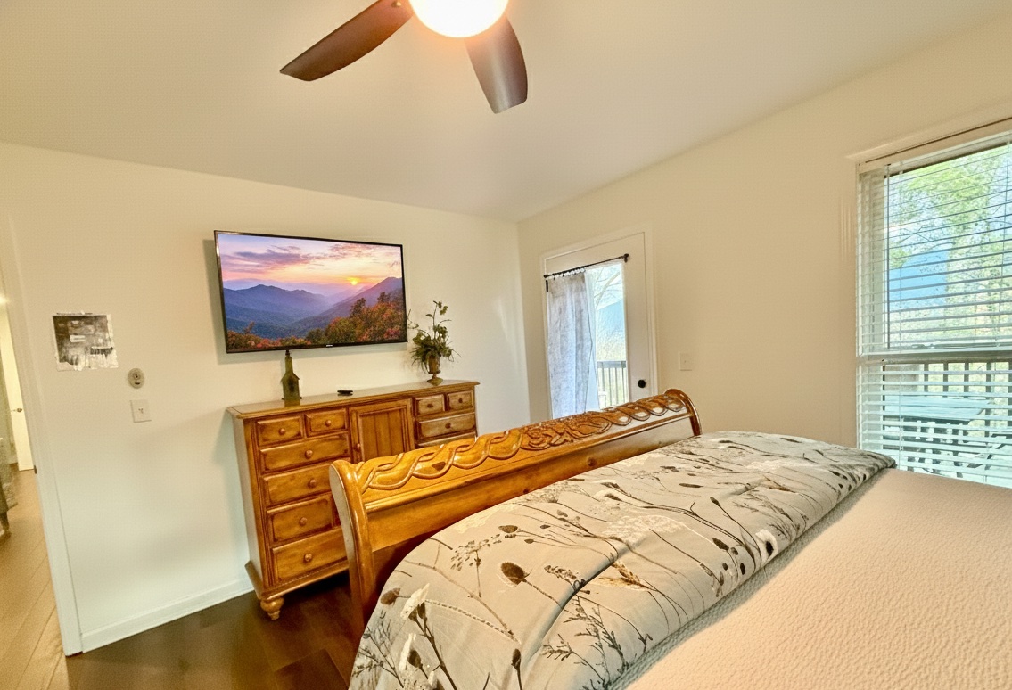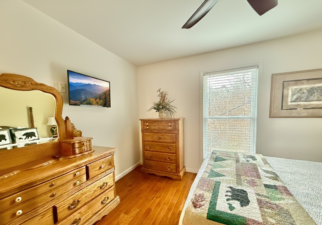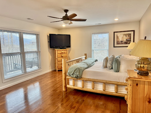 Welcome to Bear Necessities, a spacious Gatlinburg vacation rental cabin with breathtaking views. This five-bedroom retreat offers a warm and inviting atmosphere for your stay. Step inside to discover a spacious main level with wood floors and an open layout that's perfect for relaxing. The large windows throughout the home showcase the stunning view of Mount LeConte, creating a truly picturesque setting.