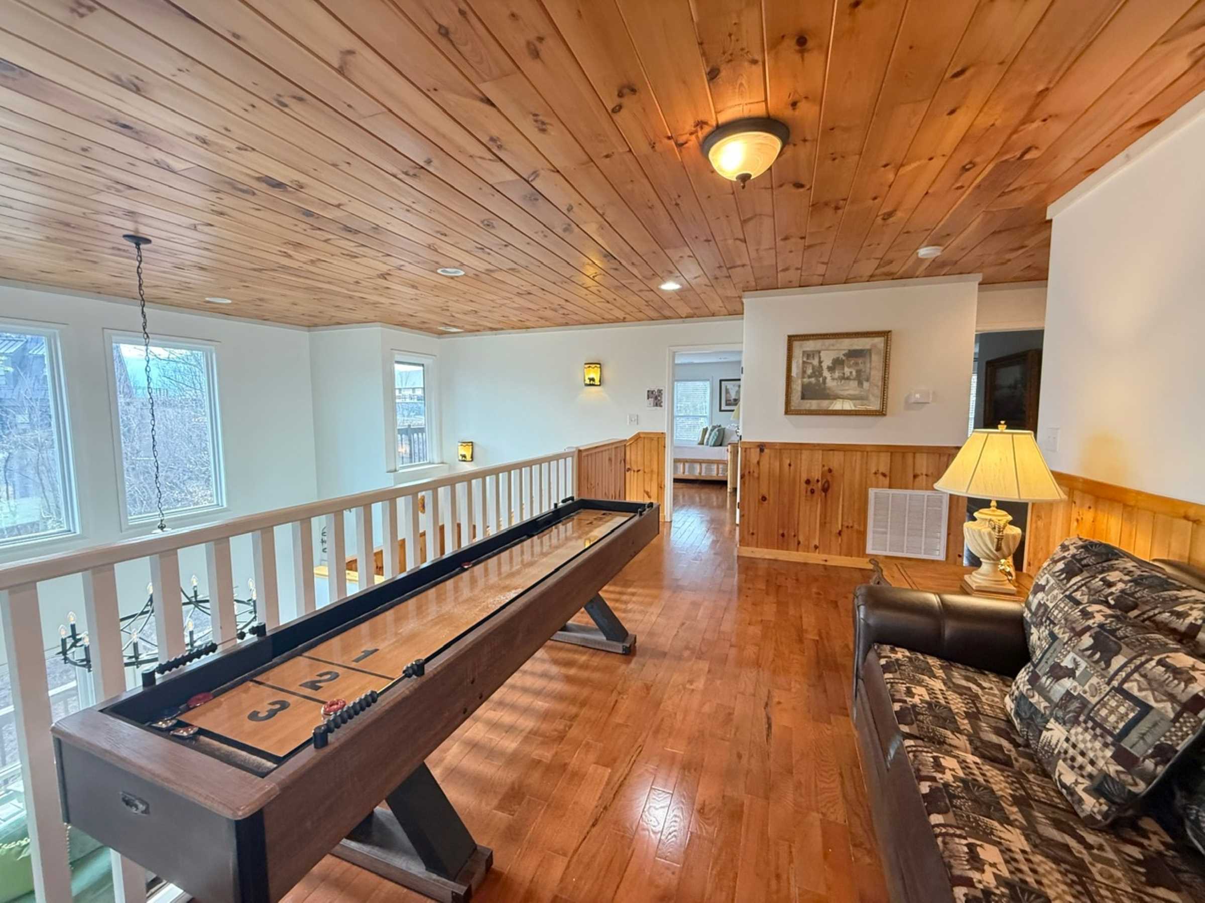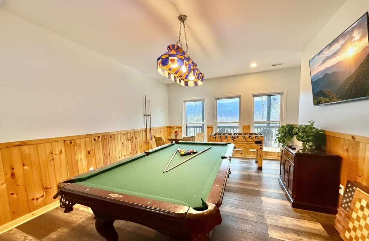 The bottom floor is home to the fifth bedroom, which offers a queen bed, TV, and access to a lower deck. This bedroom also has an ensuite bath that connects to the game room. In the game room, you'll find a foosball table and a pool table, providing endless fun for kids and those young at heart. Step outside onto the covered lower level deck, where you can enjoy the fresh air regardless of the weather.
