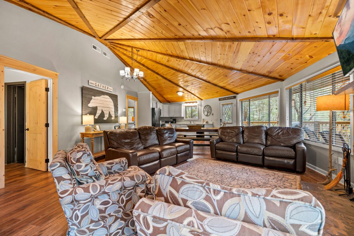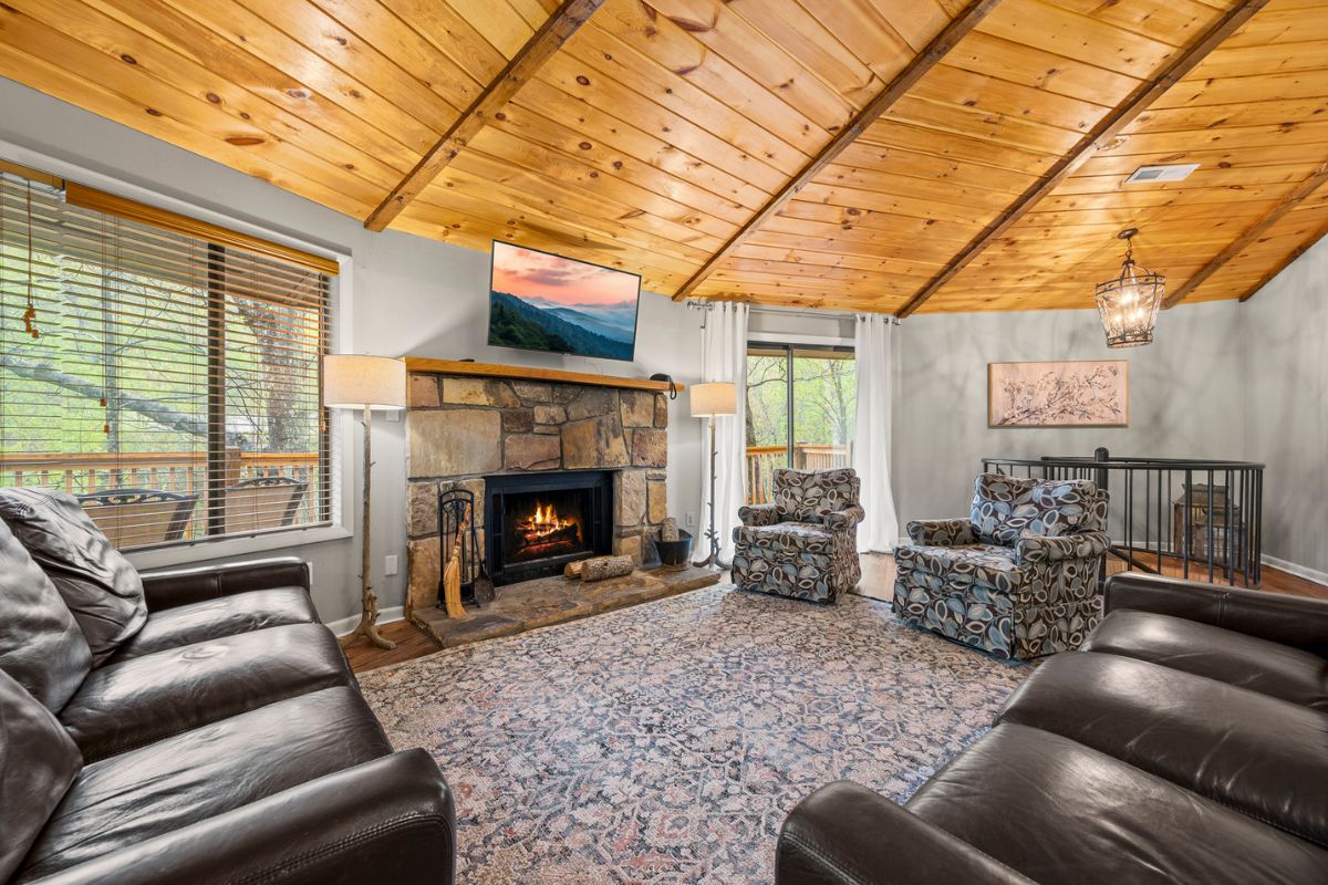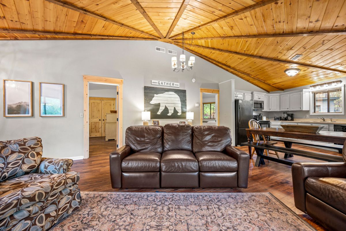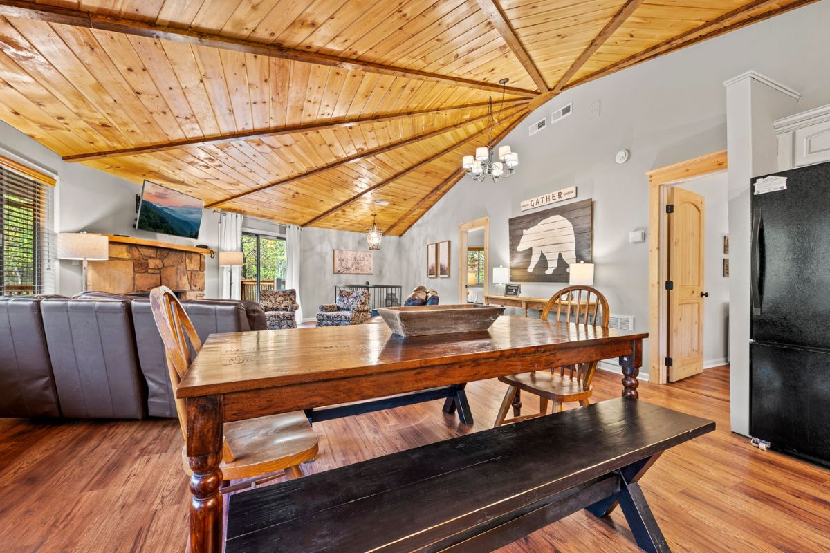 As you step inside, you’re greeted by a spacious and inviting open concept living space. The kitchen is fully equipped, perfect for the culinary enthusiasts in your group, and the adjacent dining area offers ample room for meals and game nights. The living room is a cozy haven, with plush furniture arranged around a wood-burning fireplace and a large TV for your entertainment.