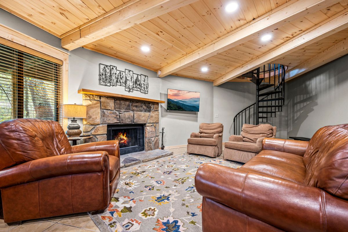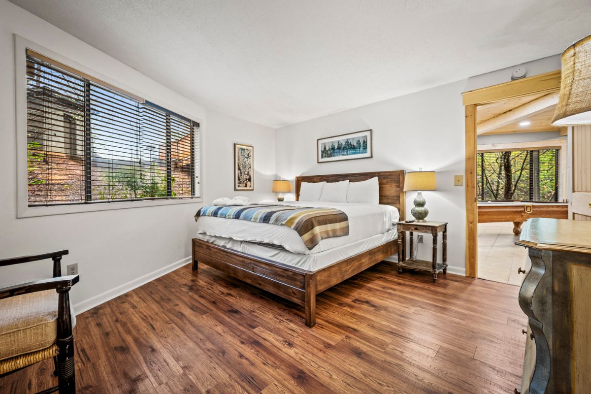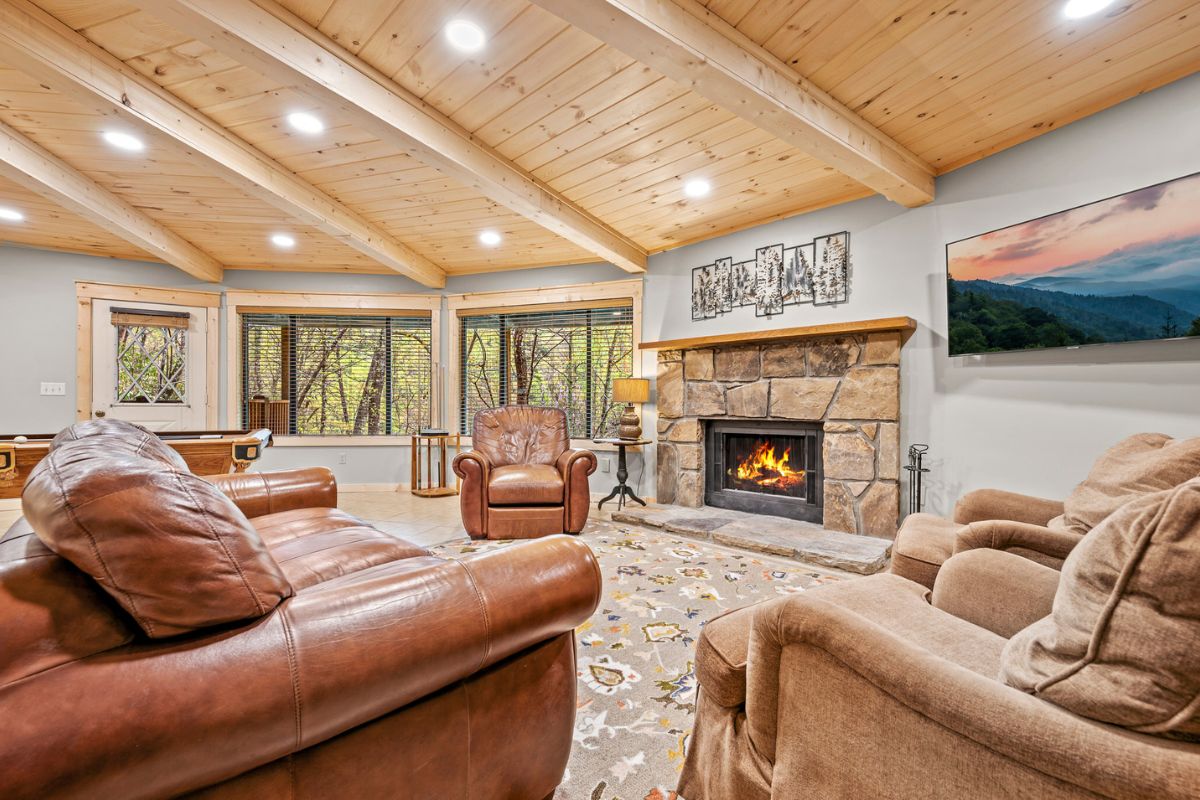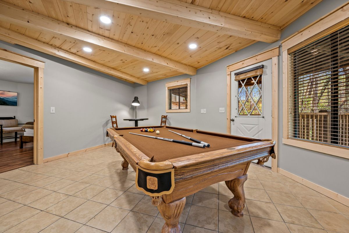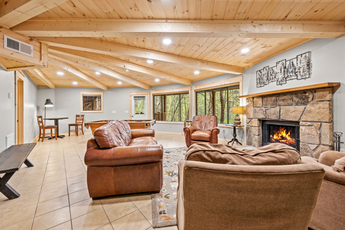 For more fun and relaxation, head down the spiral staircase (this is the only access to the lower level so know that these stairs, though regulation, are narrow and steep) to the lower level, where a game room awaits. Challenge your pals to a friendly game of pool, catch up on your favorite shows on the TV, or cozy up by the second fireplace. Additionally, you'll find two more king bedrooms on this level, each with its own ensuite bathroom and private TV.