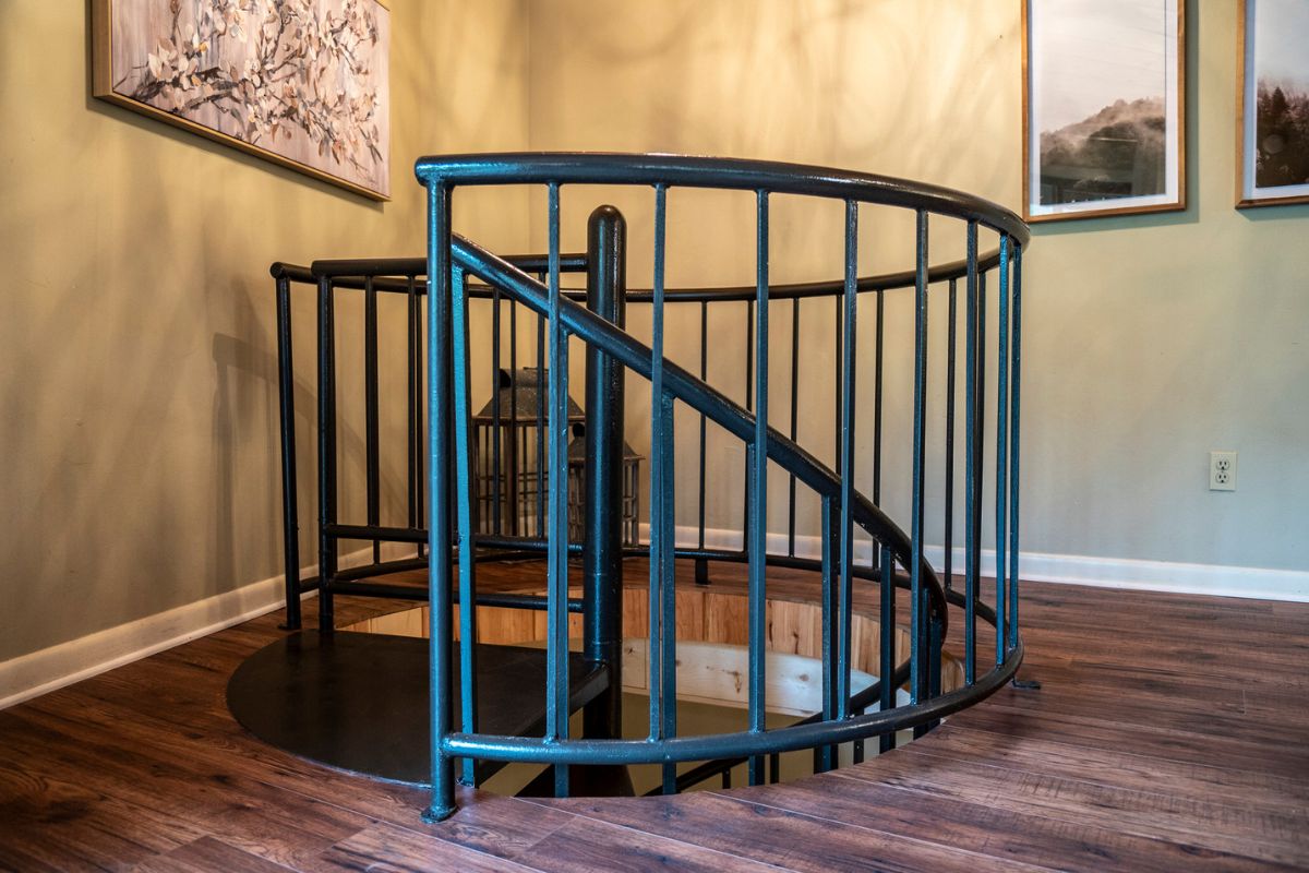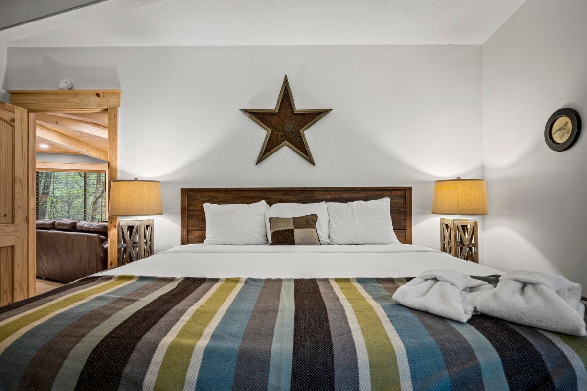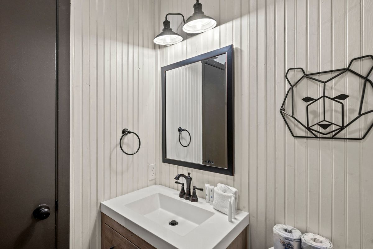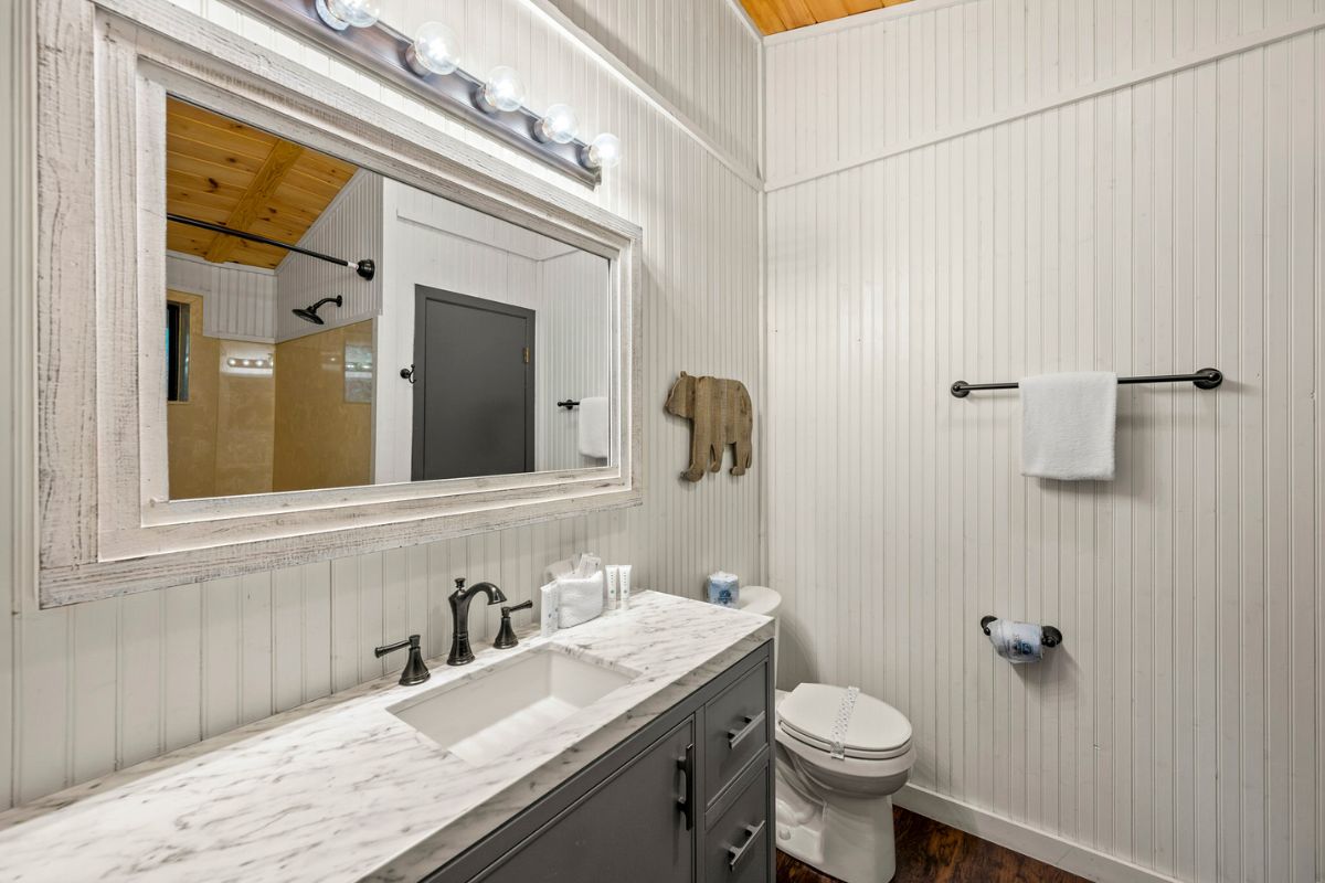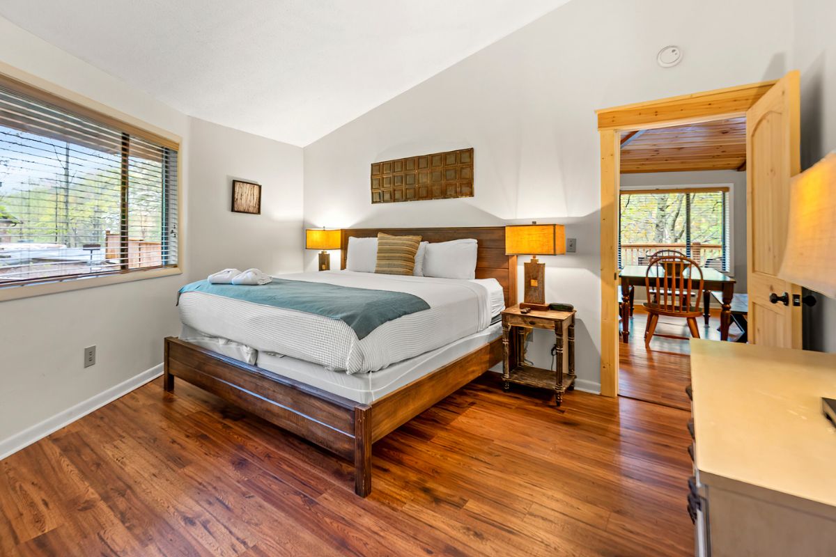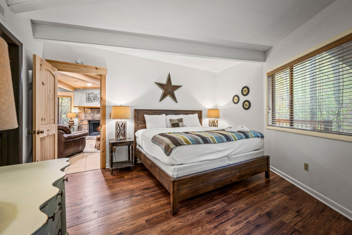 For more fun and relaxation, head down the spiral staircase (this is the only access to the lower level so know that these stairs, though regulation, are narrow and steep) to the lower level, where a game room awaits. Challenge your pals to a friendly game of pool, catch up on your favorite shows on the TV, or cozy up by the second fireplace. Additionally, you'll find two more king bedrooms on this level, each with its own ensuite bathroom and private TV.