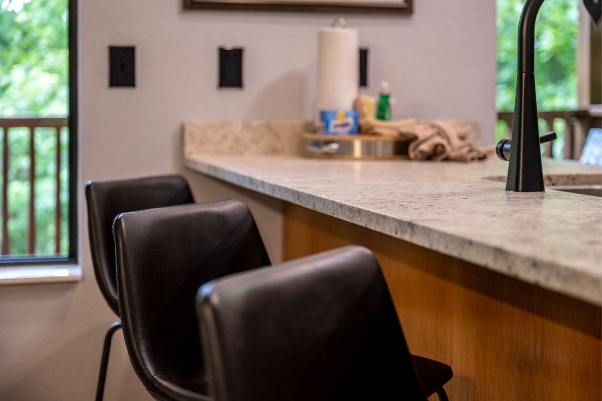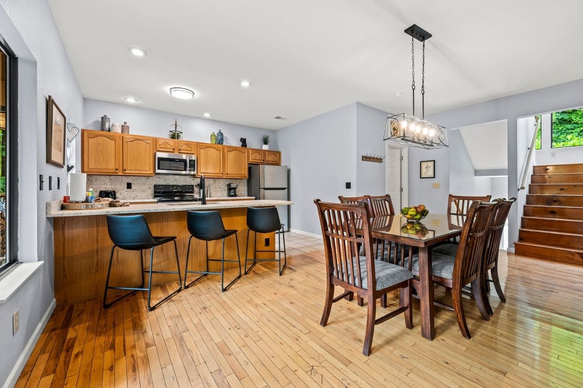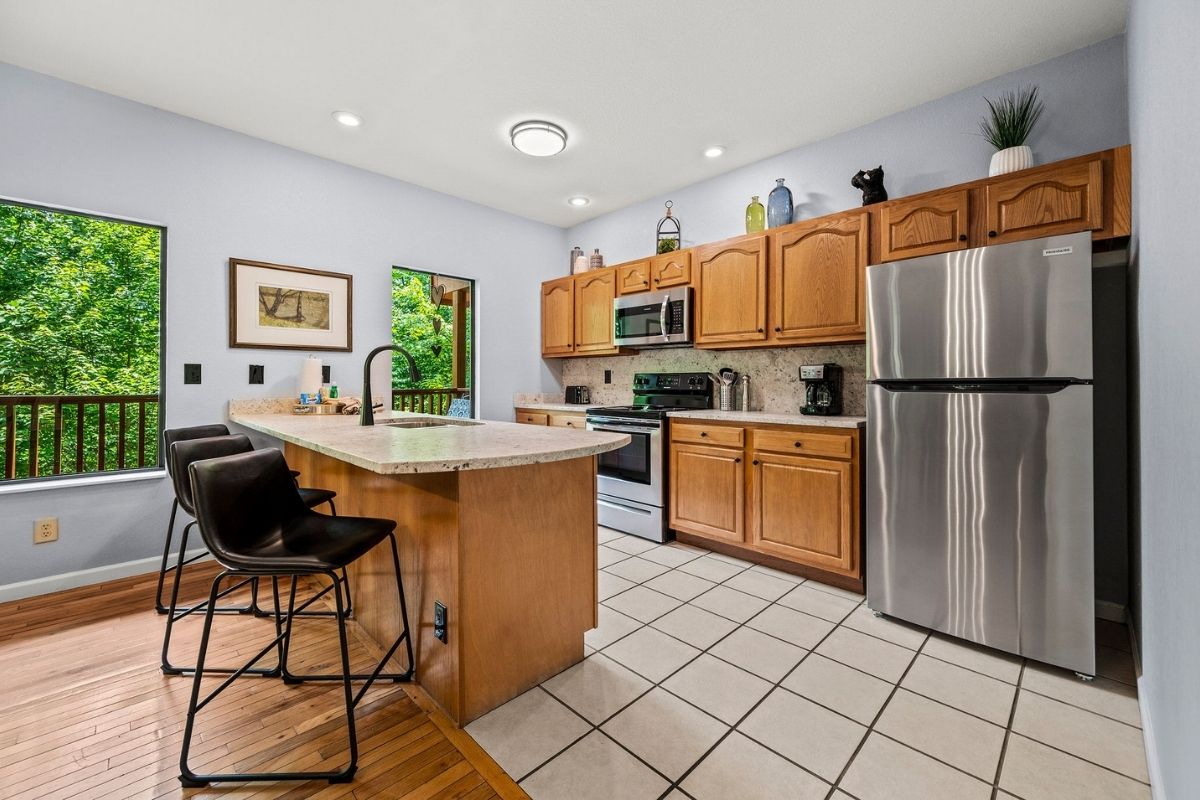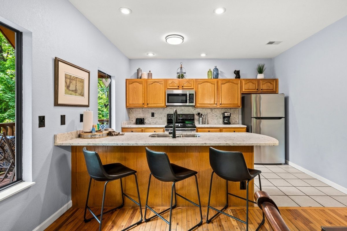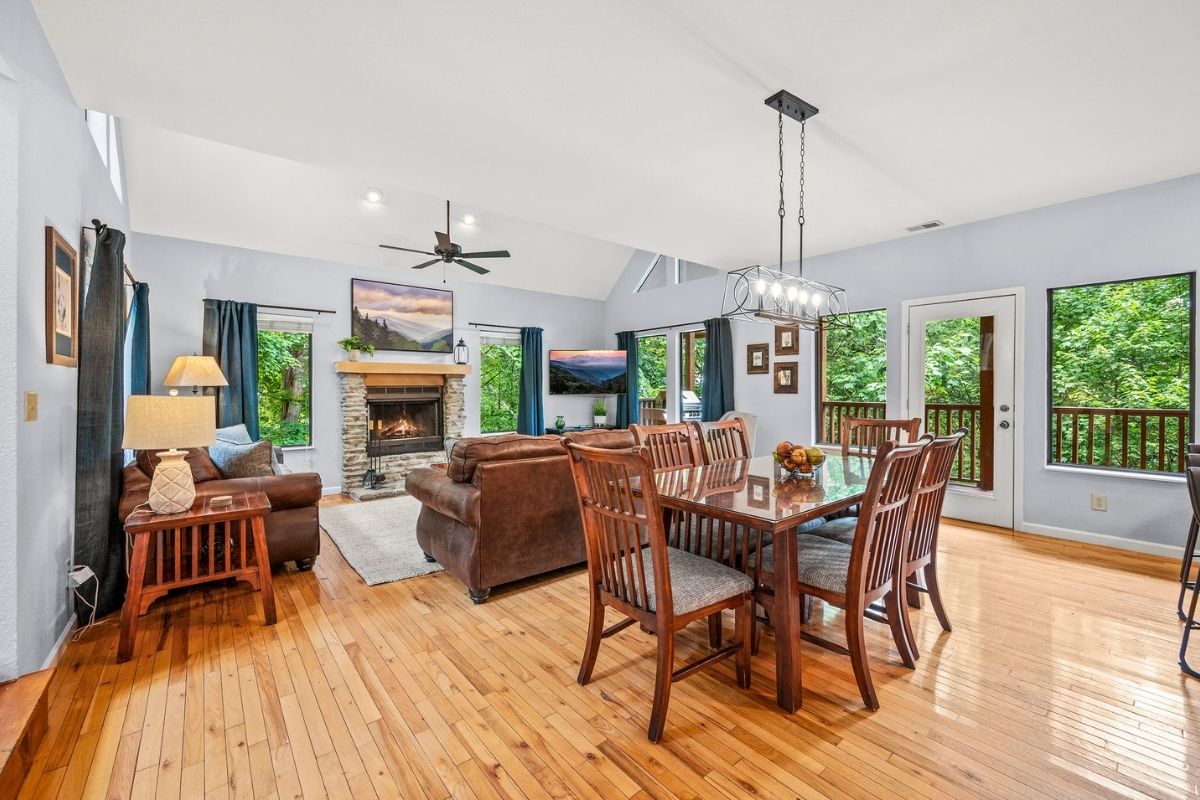 The main level offers an open-concept layout with lofty ceilings, providing ample space for relaxation and connection. The living area boasts large windows that invite in natural light, along with plush furnishings, a wood-burning fireplace, and a generously sized TV. Adjacent to this cozy space, you'll discover a kitchen equipped for preparing meals at home. It features a dining table perfect for shared meals and friendly game nights. The open design of the kitchen allows for easy conversation while preparing delicious dishes. You'll find everything you need to whip up your favorite meals; just bring your groceries. Step outside onto the main level deck, where a private oasis awaits. It's the ideal spot to unwind, surrounded by the beauty of nature.