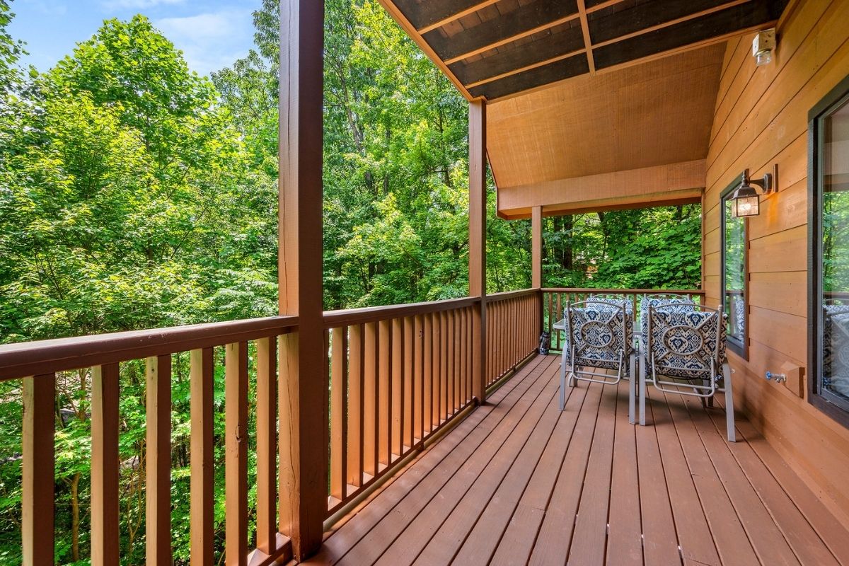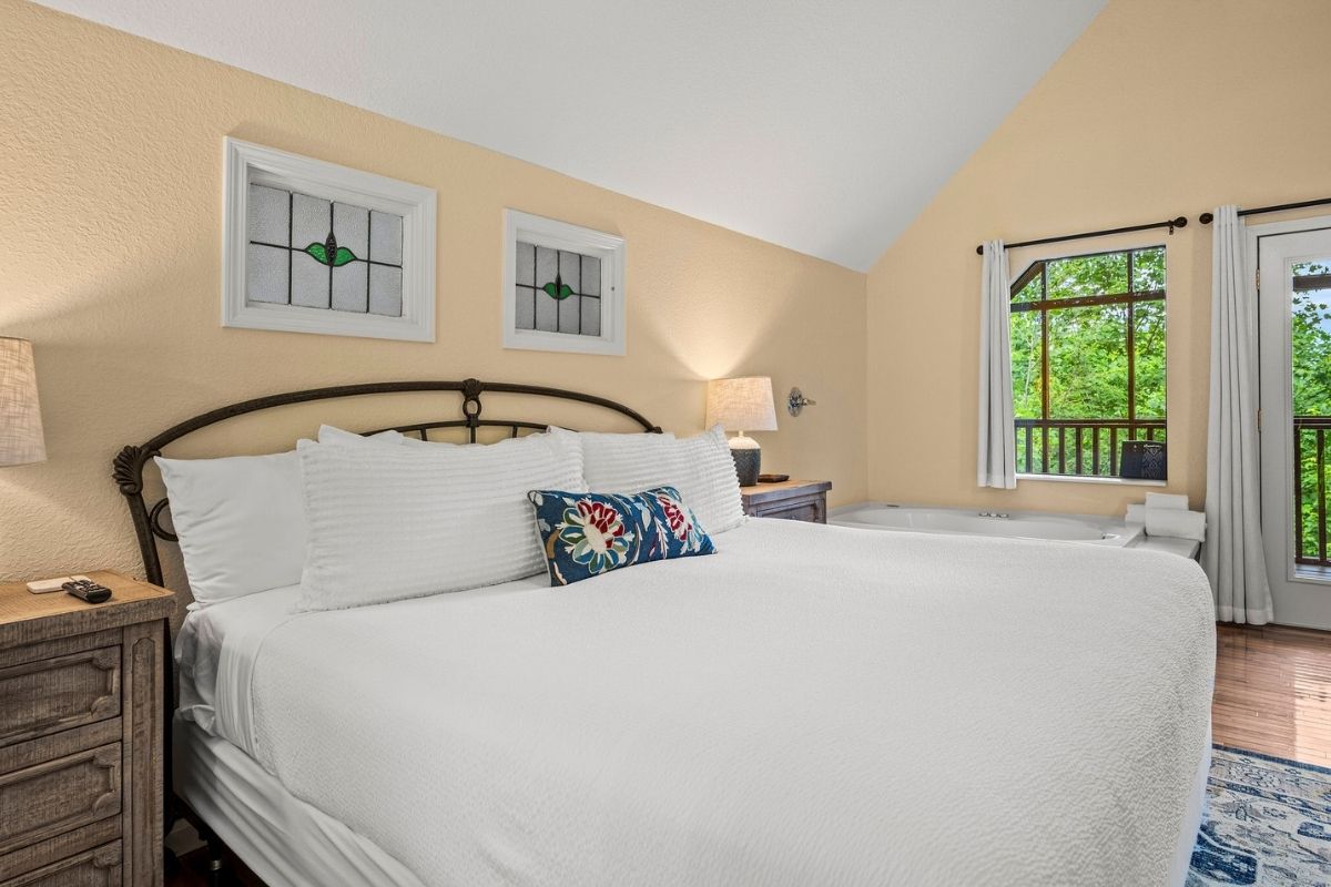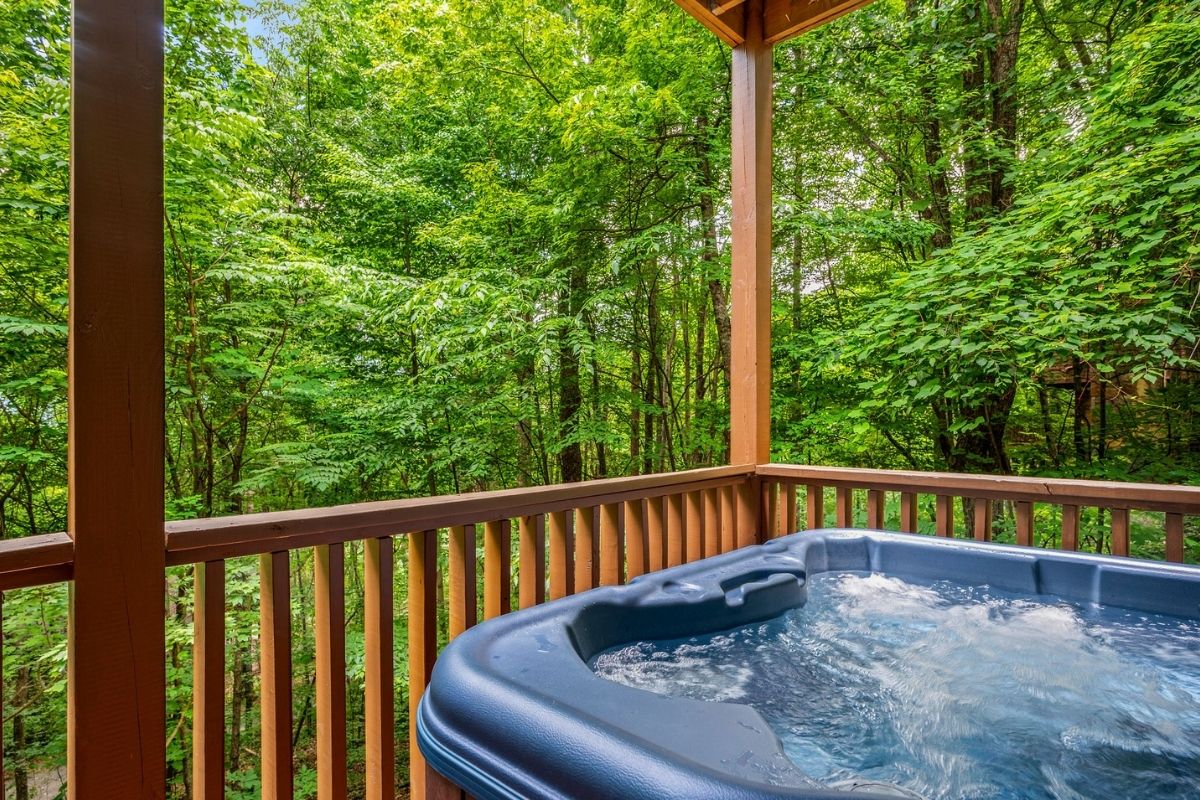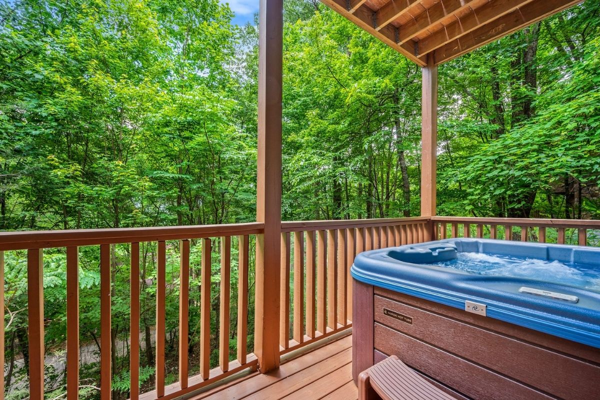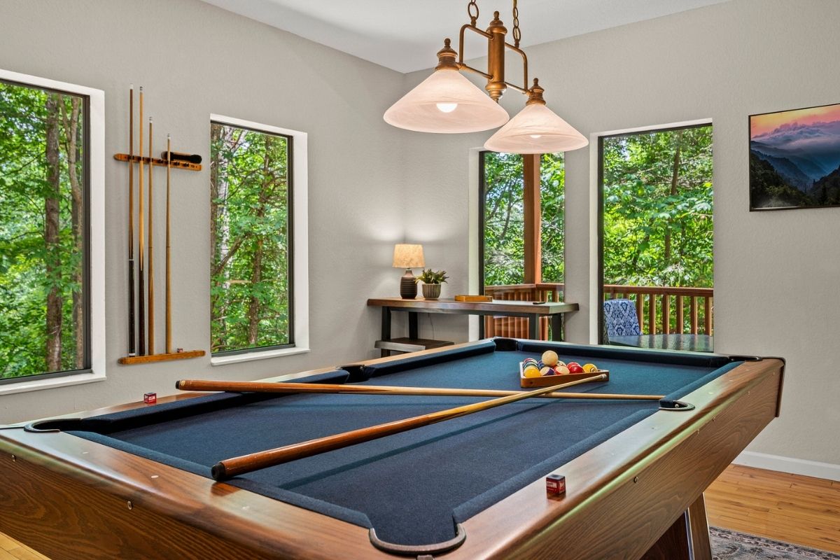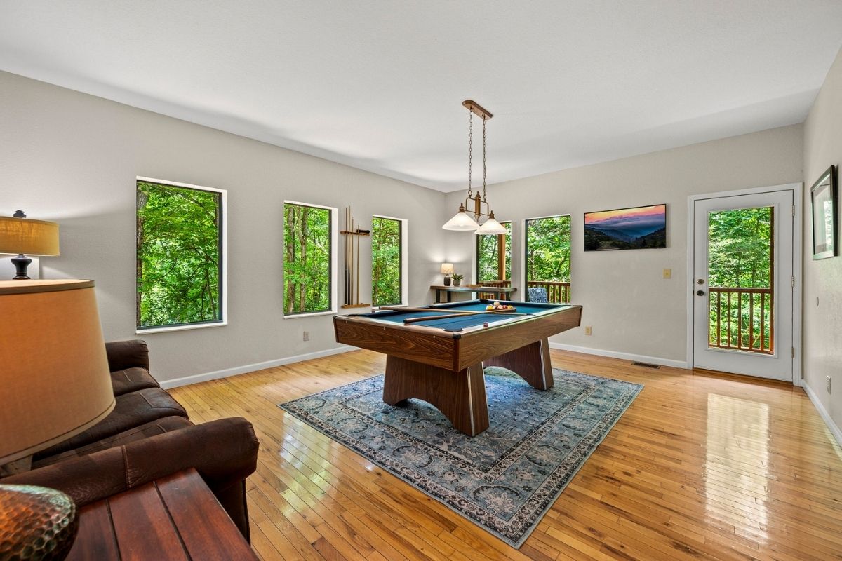 The lower level of Early Dawn features a second king bedroom with its own TV, inviting whirlpool tub, and private bath. A game room with yet another TV and a pool table promises hours of entertainment and friendly competition (loser does the dinner dishes!). Step out onto the lower level deck, where a large hot tub invites you to soak away the cares of the day after your adventures in the Smokies.