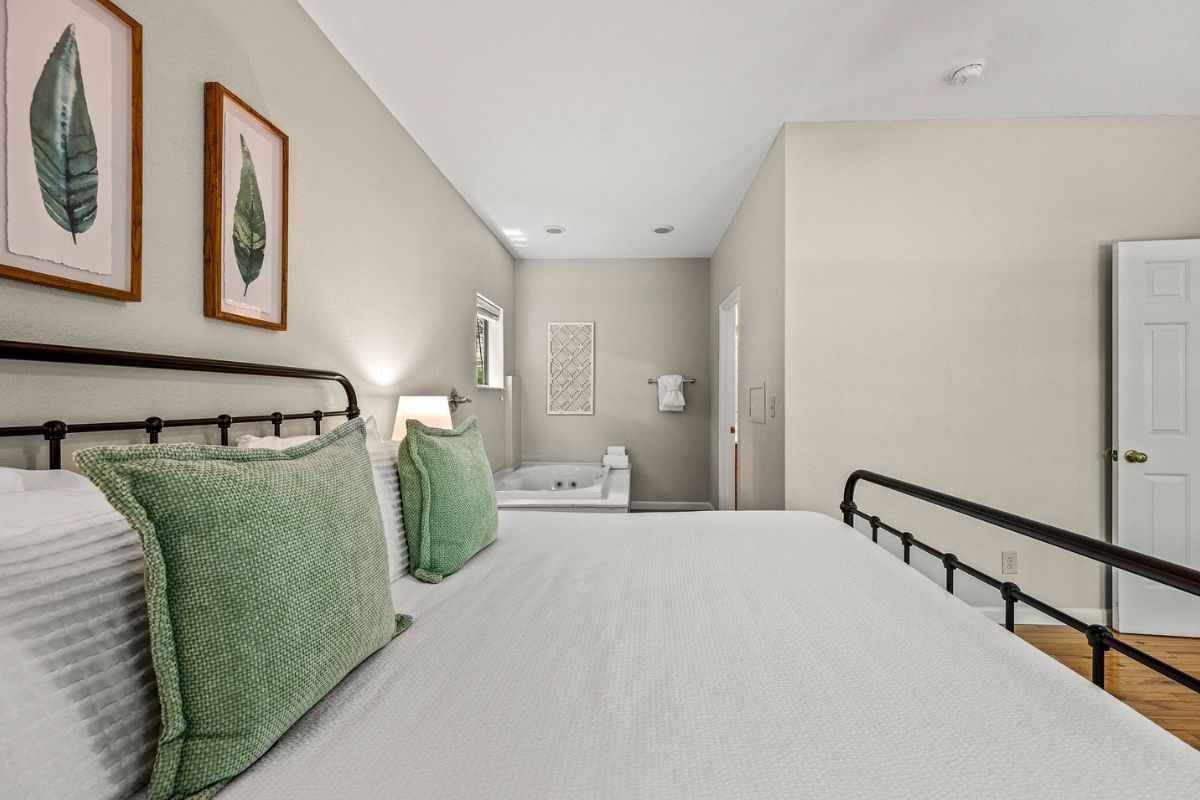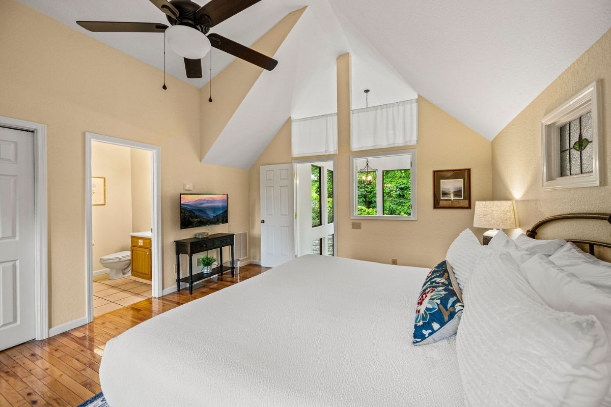 Venture upstairs to the top floor, where a spacious primary suite beckons with a king-sized bed, a relaxing whirlpool jacuzzi, and a private TV. An ensuite bathroom adds to your comfort. Additionally, there's a private, screened-in porch off the bedroom, offering a secluded spot to enjoy more time outdoors.