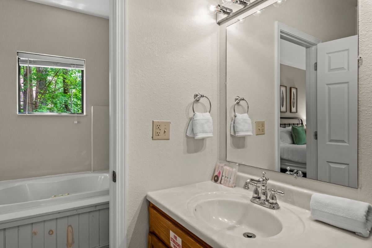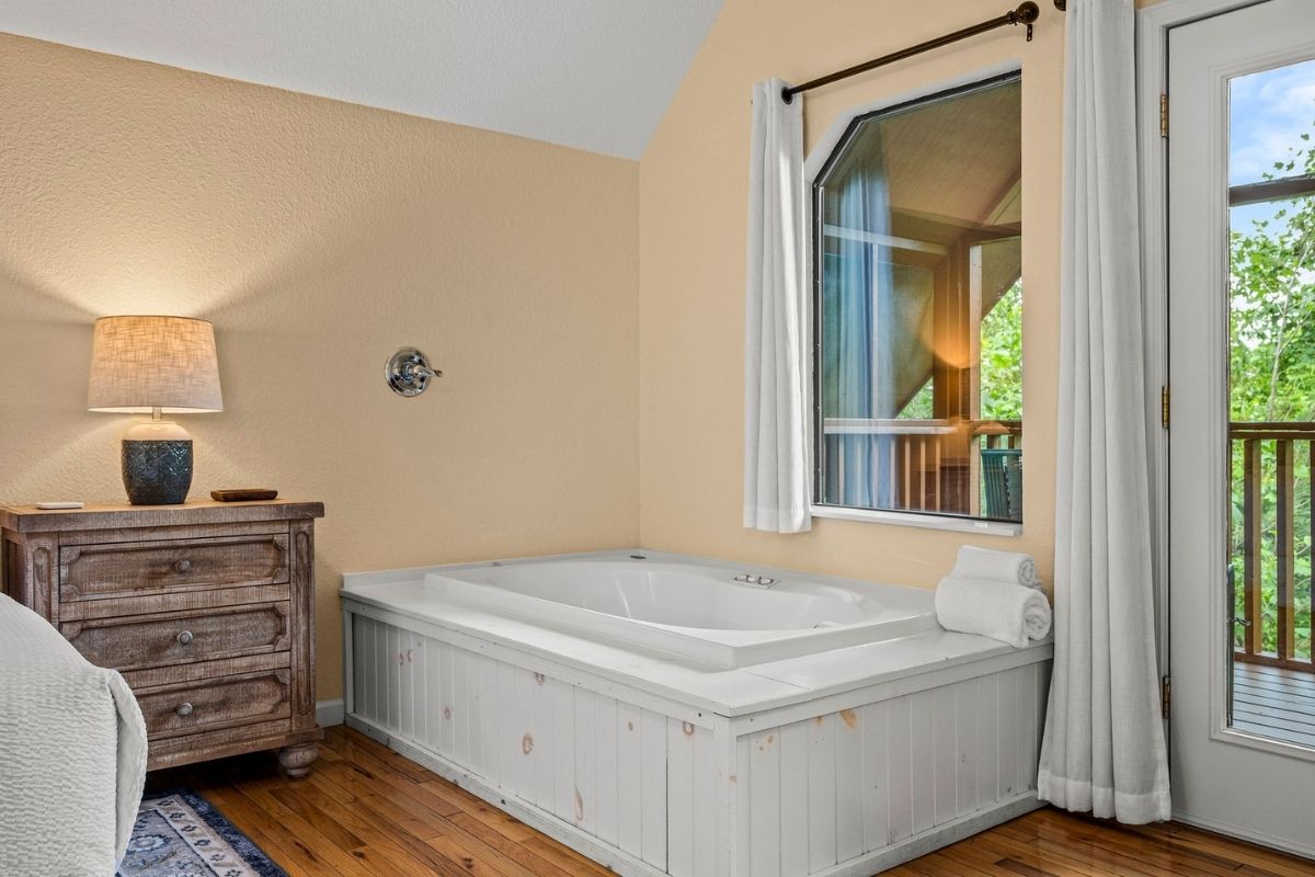 They recently cut down two pine trees across the street and as a result when you get in and out of the soaker tub in the upstairs bedroom, you and the cabin across the way (the third-floor balcony) will be getting 'intimately' acquainted. Perhaps some drapes or some type of screen that you could set in front of the tub would be most helpful for those of us who are modest.