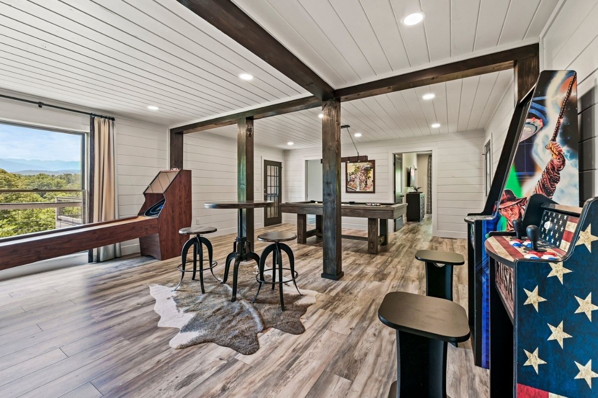 Next to the living area, a delightful game room awaits, housing a full-size skee ball machine, arcade games, and a pool table for hours of fun and laughter. The main level is also home to two generously sized king bedrooms with private ensuite bathrooms. Step out onto the main level deck and discover the pièce de résistance—a spacious hot tub that offers a mesmerizing view that will leave you in awe.