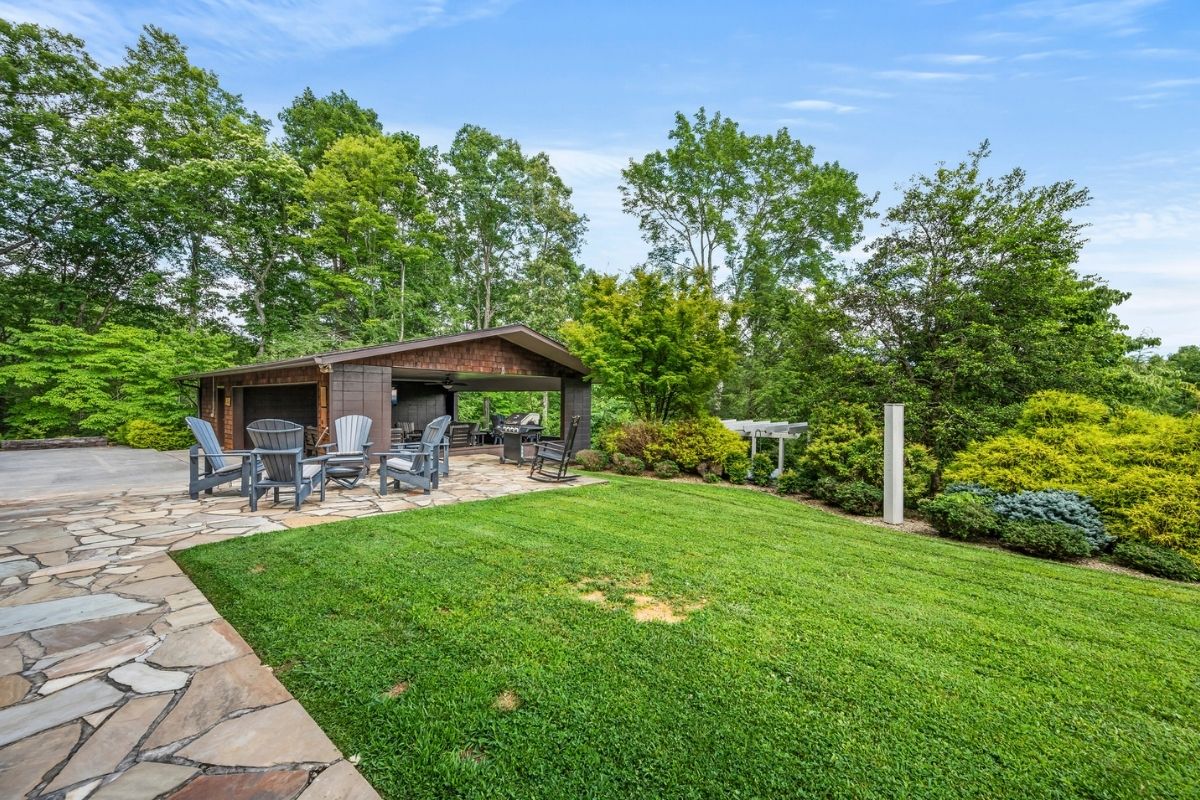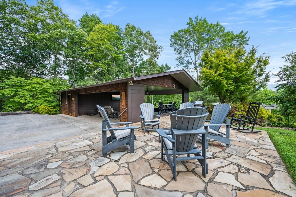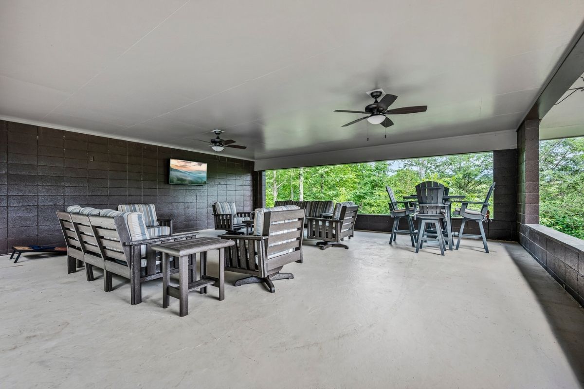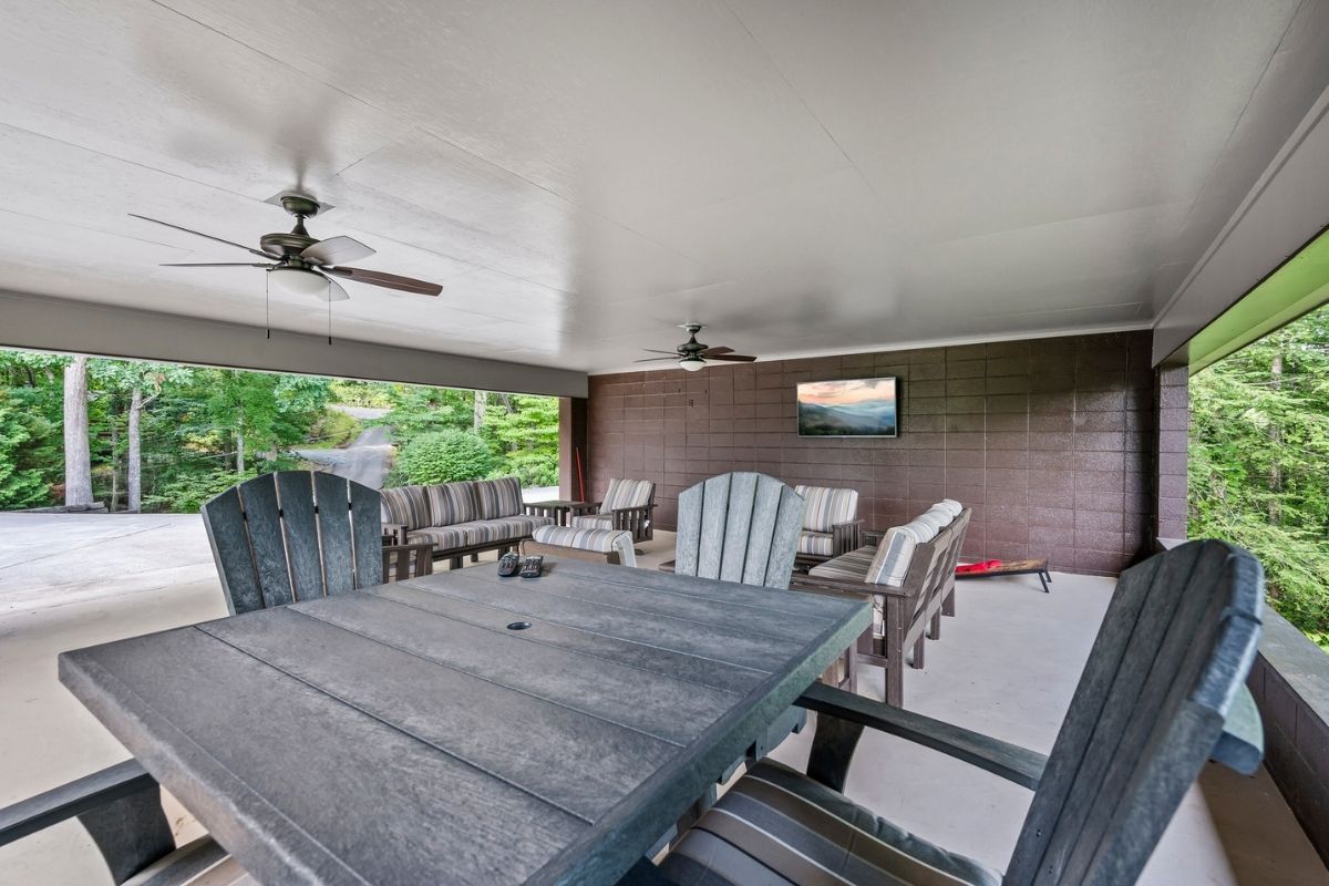 * Large outdoor gathering space with a TV and plush furniture