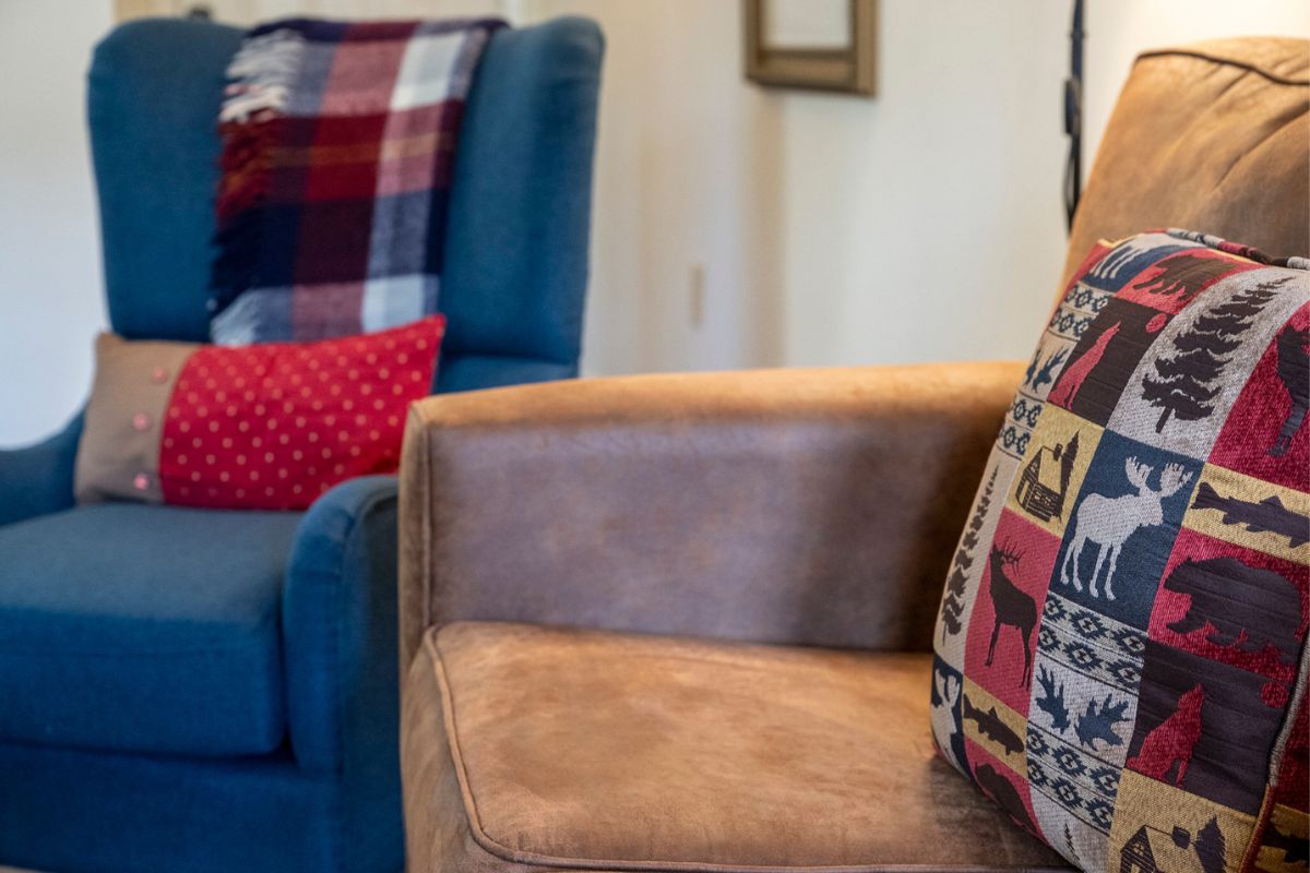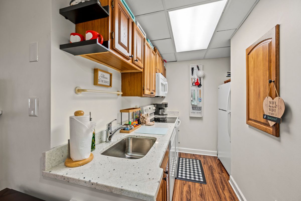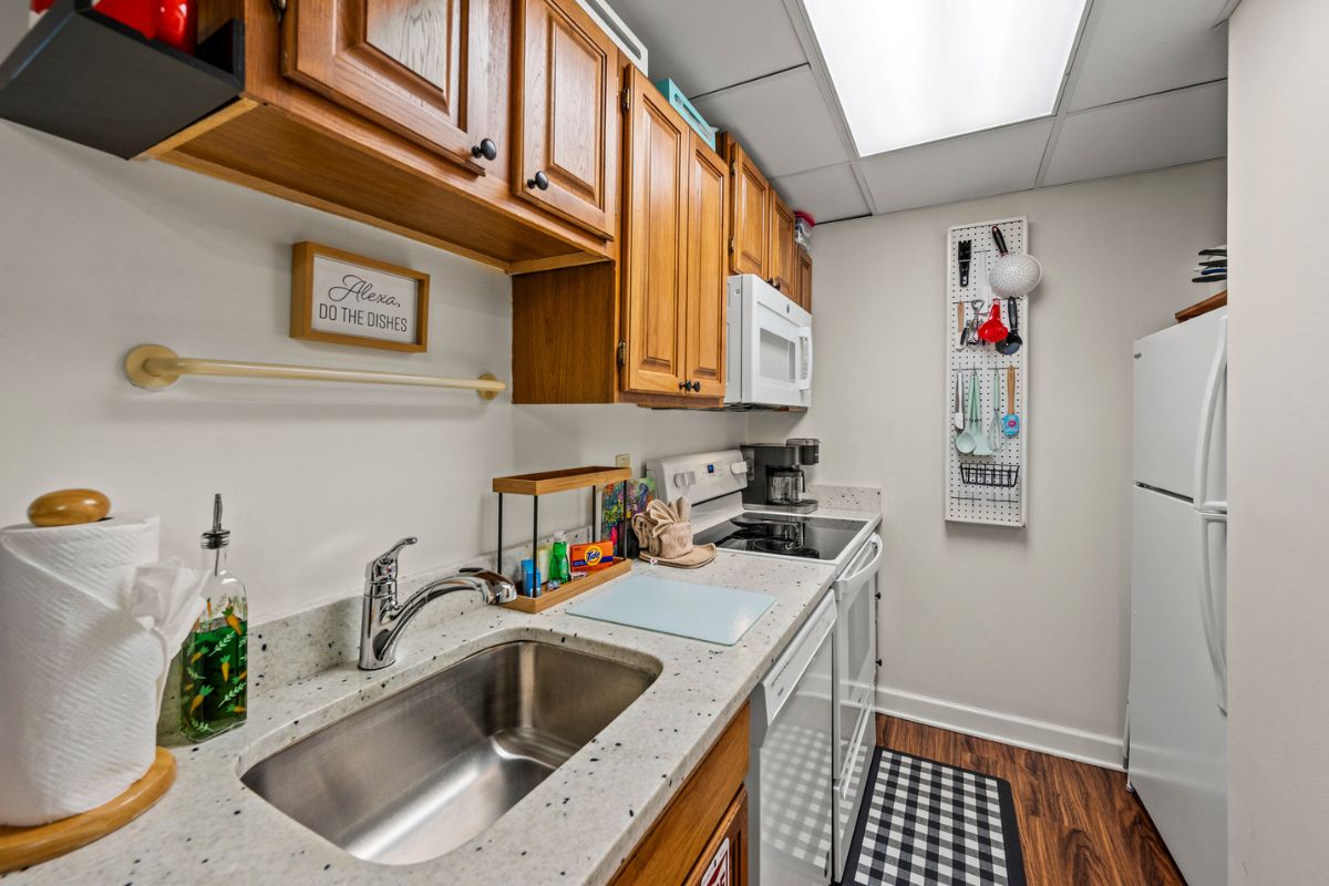 Beyond the foyer, the open-concept living/dining area welcomes you with a cozy gas fireplace, a generously sized TV, a plush sofa, and two recliners. Adjacent to this gathering space, a dining area awaits, accommodating up to four guests and conveniently positioned near the fully-appointed kitchen. Here, aspiring chefs will find everything they need to whip up delightful meals; just bring your favorite groceries. The kitchen, featuring granite countertops, is equipped with all essential appliances, including handy tools like a George Foreman grill and a crock pot. Additionally, coffee lovers will appreciate the dual coffee machine that brews both pots (bring your grounds and filters) and cups (bring k-cups).