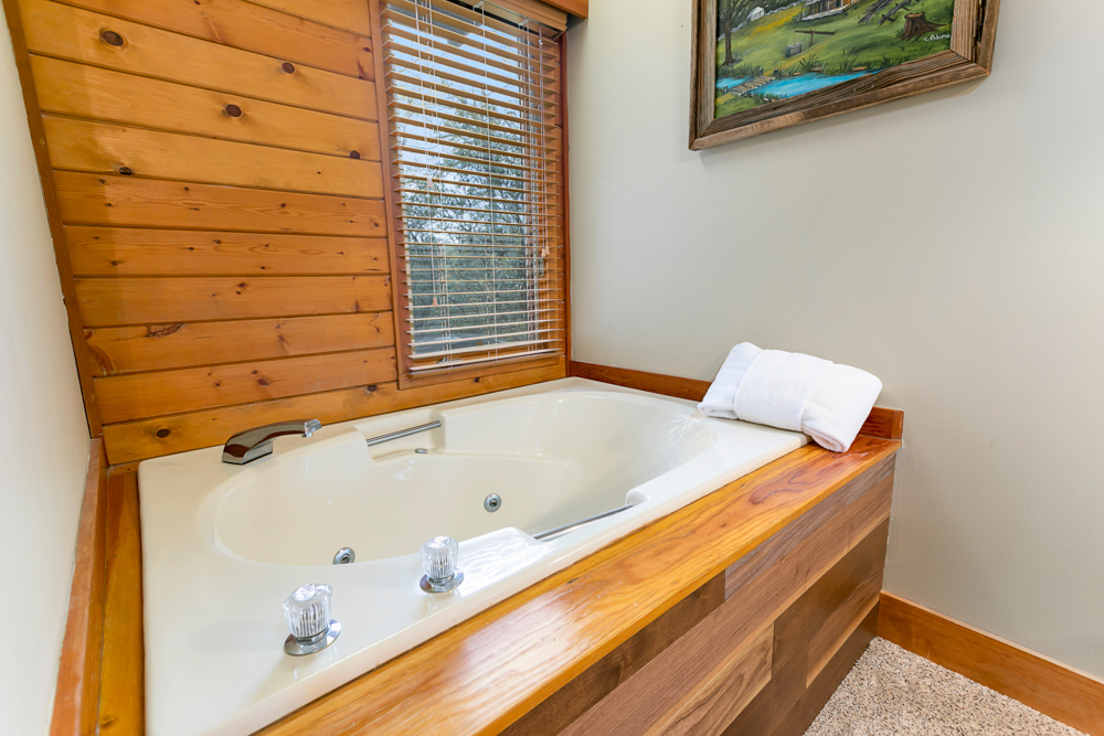 The primary king bedroom offers an ensuite half bath and another one-person whirlpool jacuzzi. Plus, there's a TV and DVD player for your entertainment. The secondary king bedroom is equally inviting with its own TV and DVD player. Stay connected with high-speed Wi-Fi throughout the entire cabin, in case you need to squeeze in a bit of work amidst the relaxation.