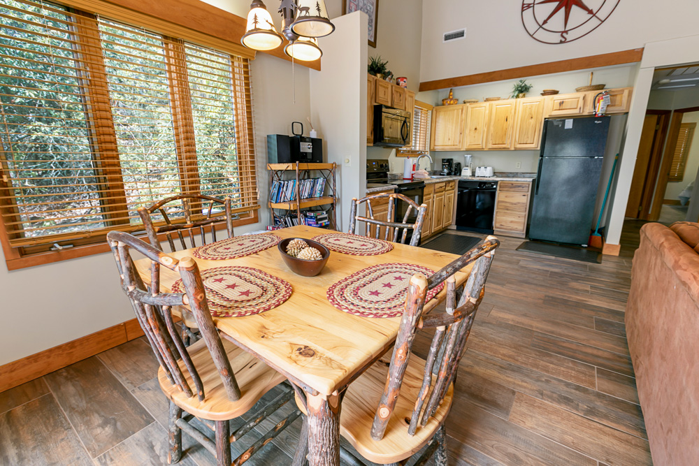 The adjacent kitchen and dining area seamlessly blend with the living space. The kitchen is fully equipped, ready for the chef in your group—just bring your favorite groceries. Gather around the dining table to share hearty meals and indulge in board games with your loved ones.
