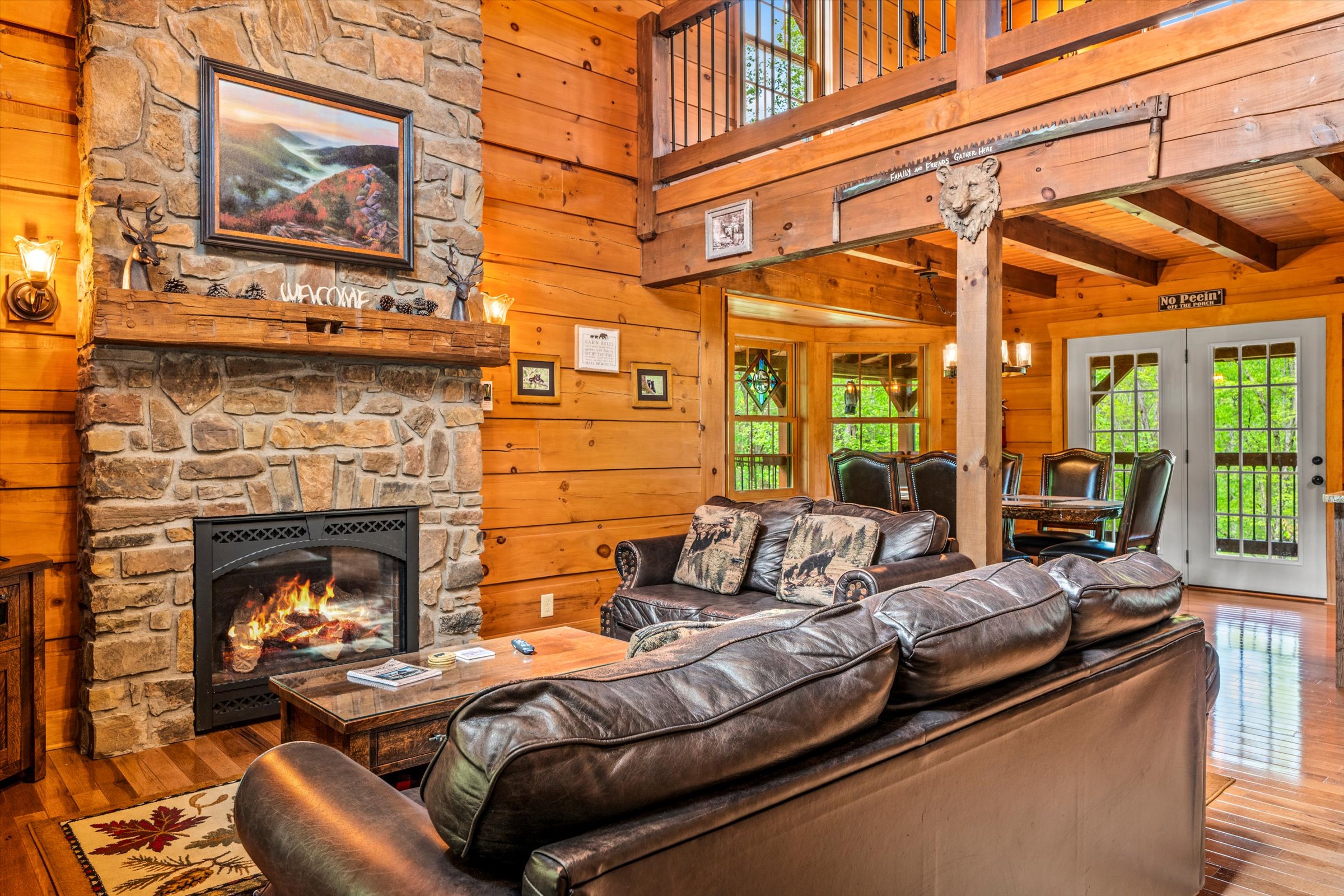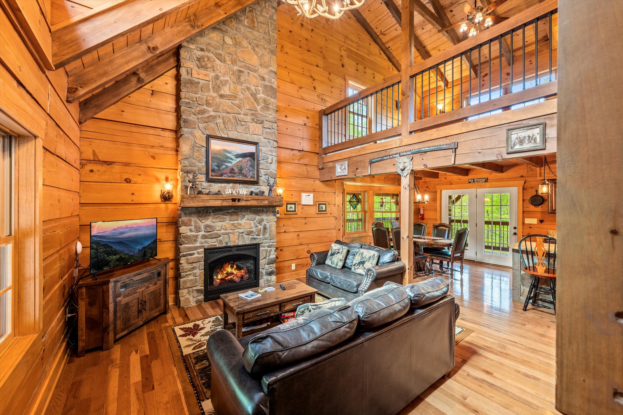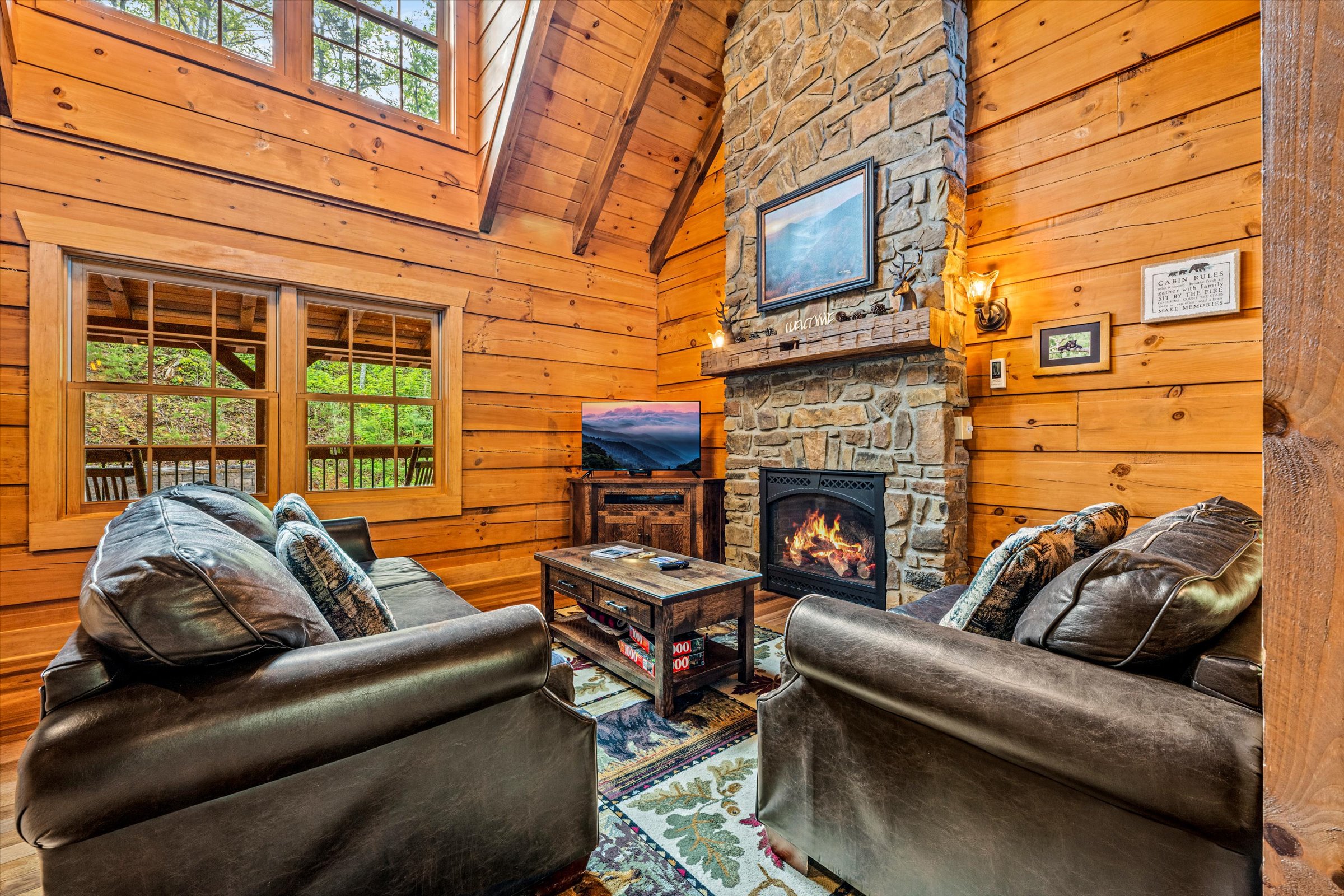 Inside, a spacious open-concept living area awaits, featuring soaring ceilings and rich wood accents. Comfortable seating surrounds a striking stone gas fireplace (operational from Oct. 1 through Feb. 28) and a flatscreen TV. Whether you’re curling up with a novel, hosting a movie night, or catching the big game, you’ll find comfort and style at every turn.