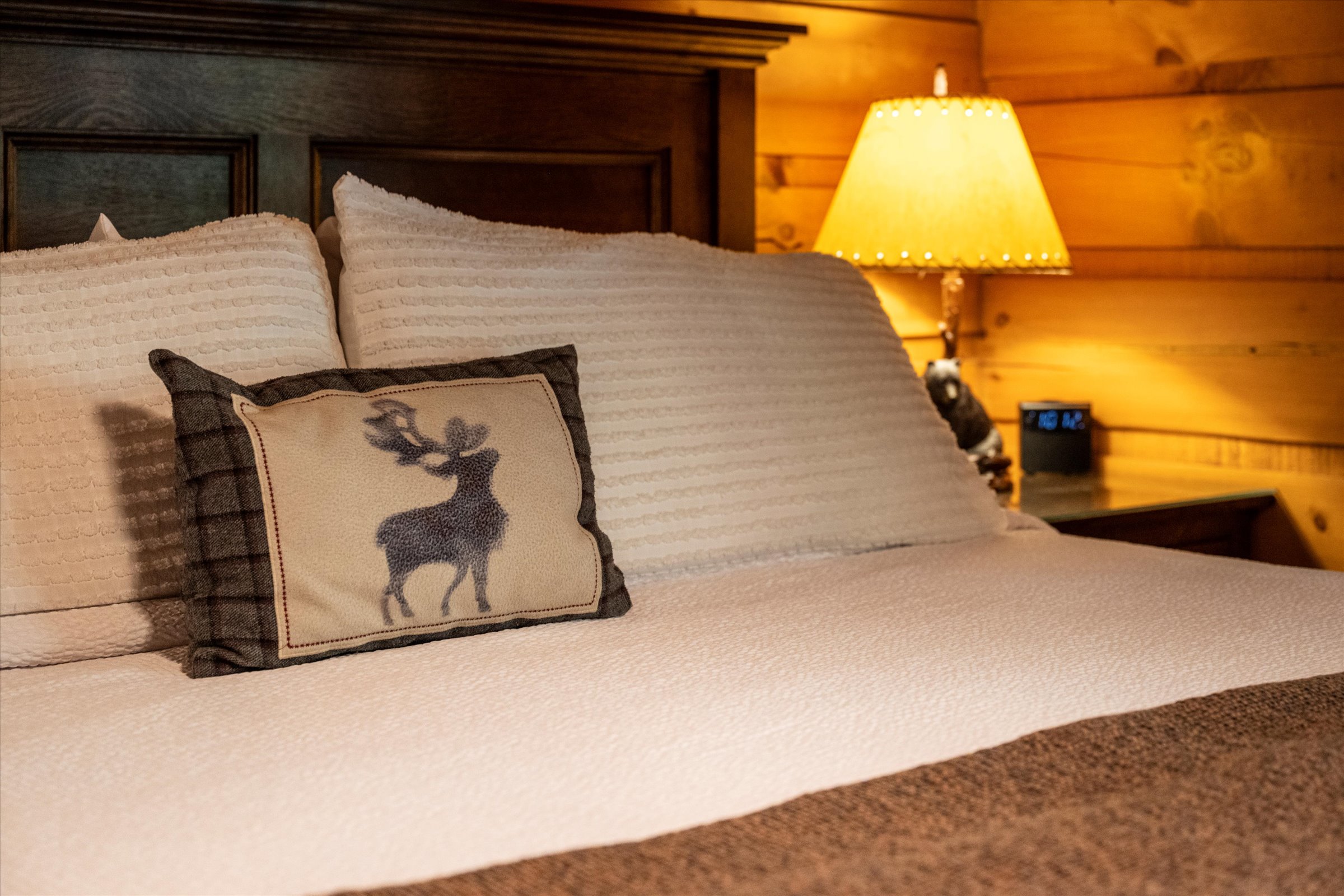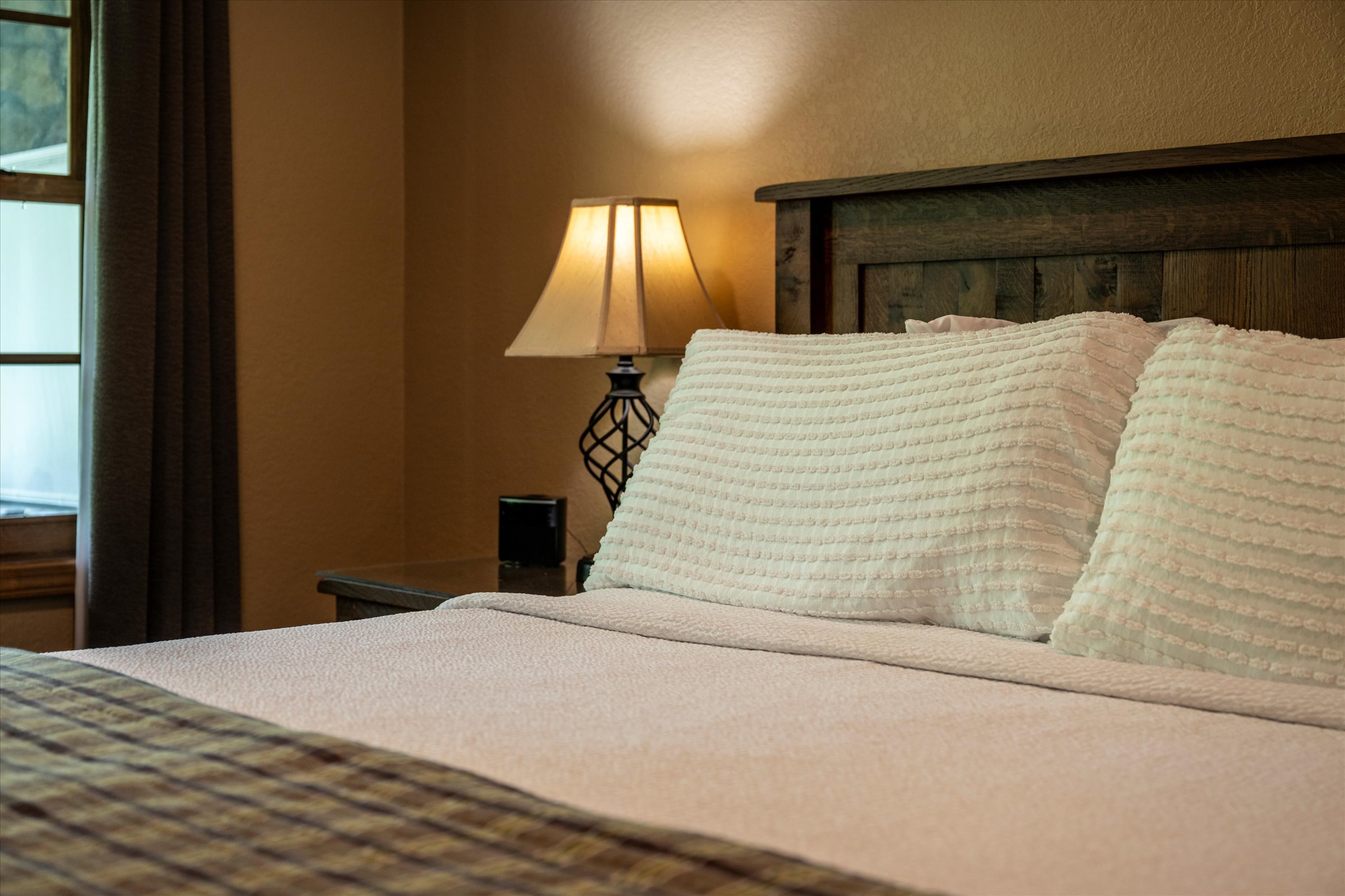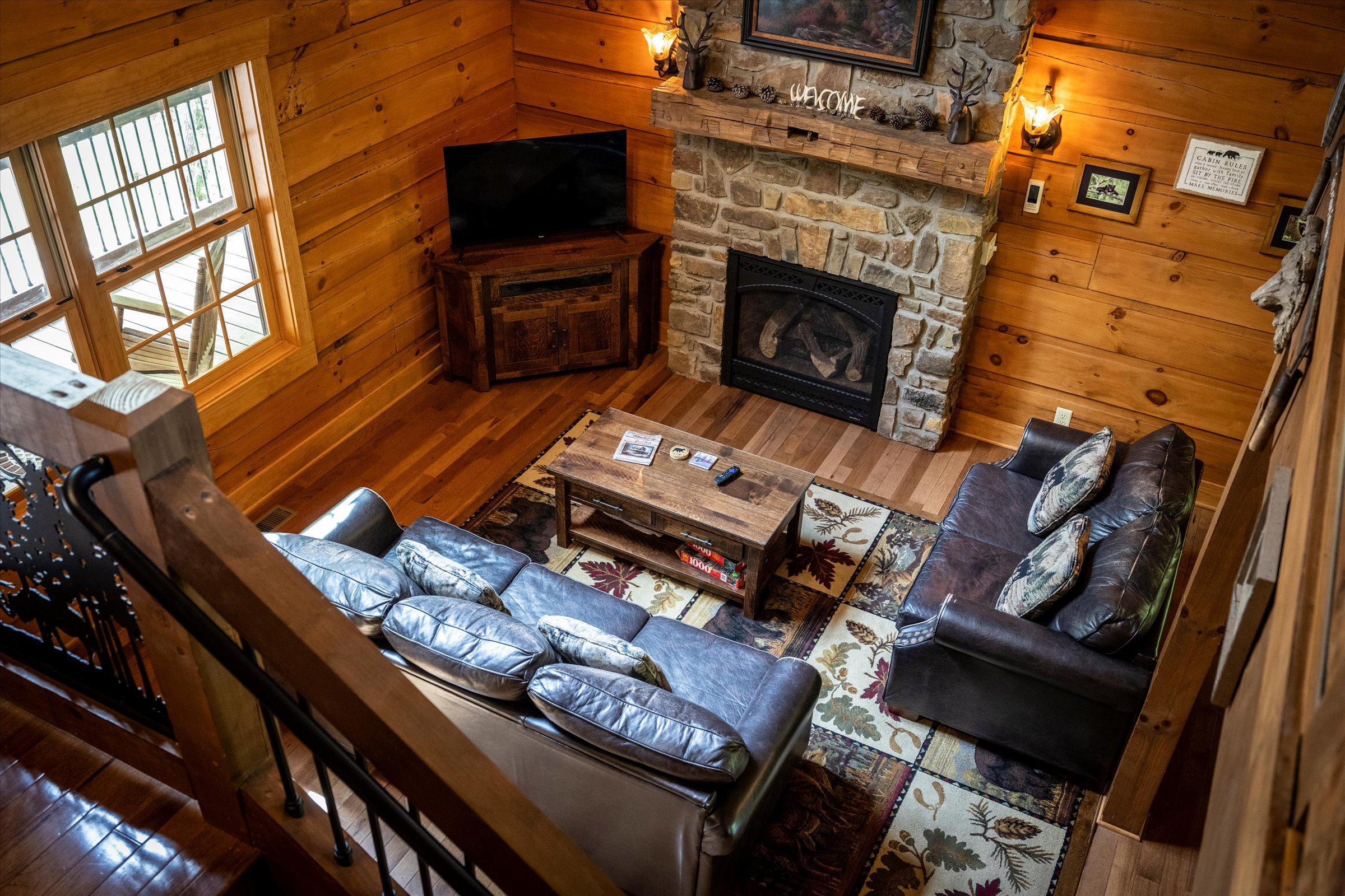 Inside, a spacious open-concept living area awaits, featuring soaring ceilings and rich wood accents. Comfortable seating surrounds a striking stone gas fireplace (operational from Oct. 1 through Feb. 28) and a flatscreen TV. Whether you’re curling up with a novel, hosting a movie night, or catching the big game, you’ll find comfort and style at every turn.