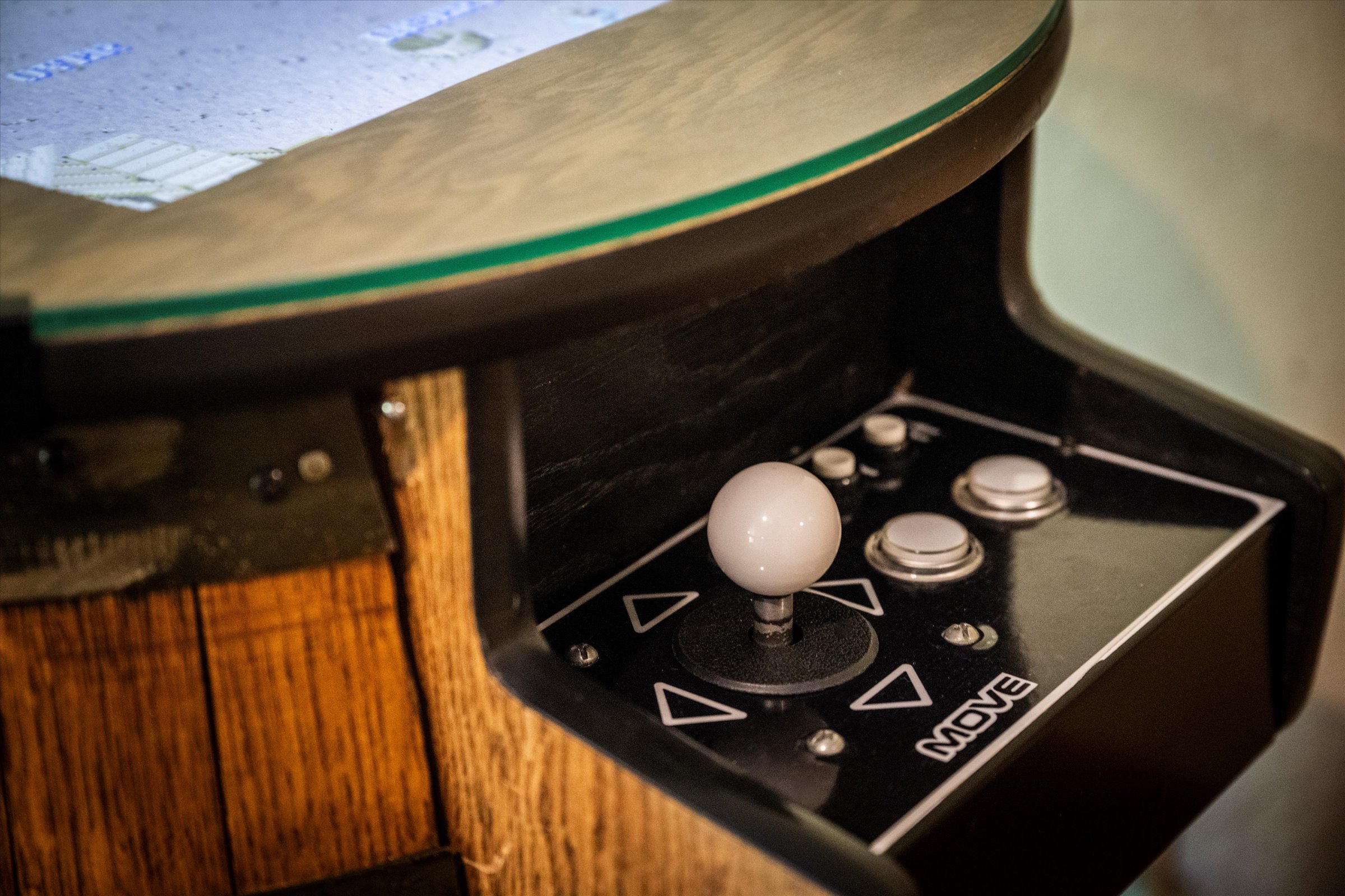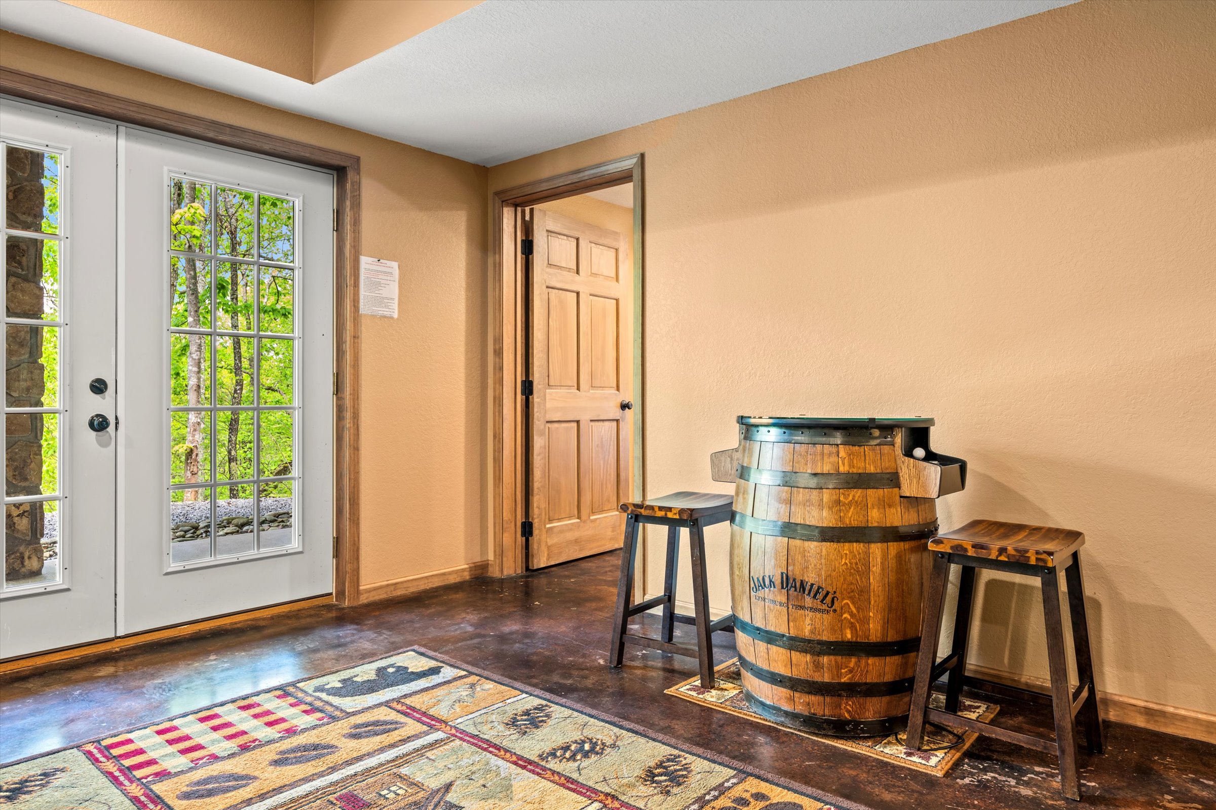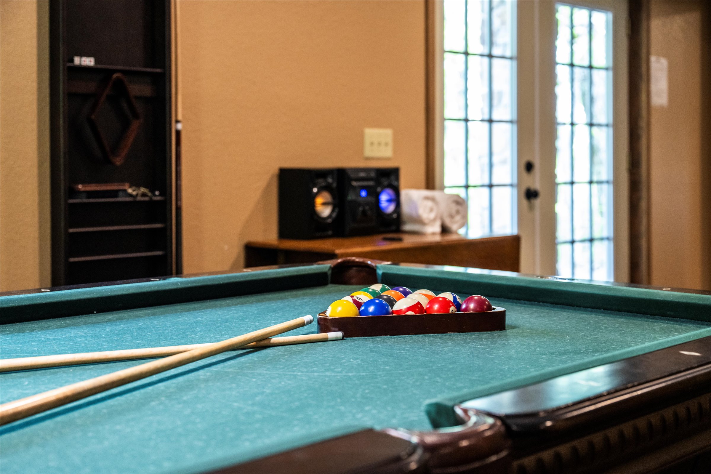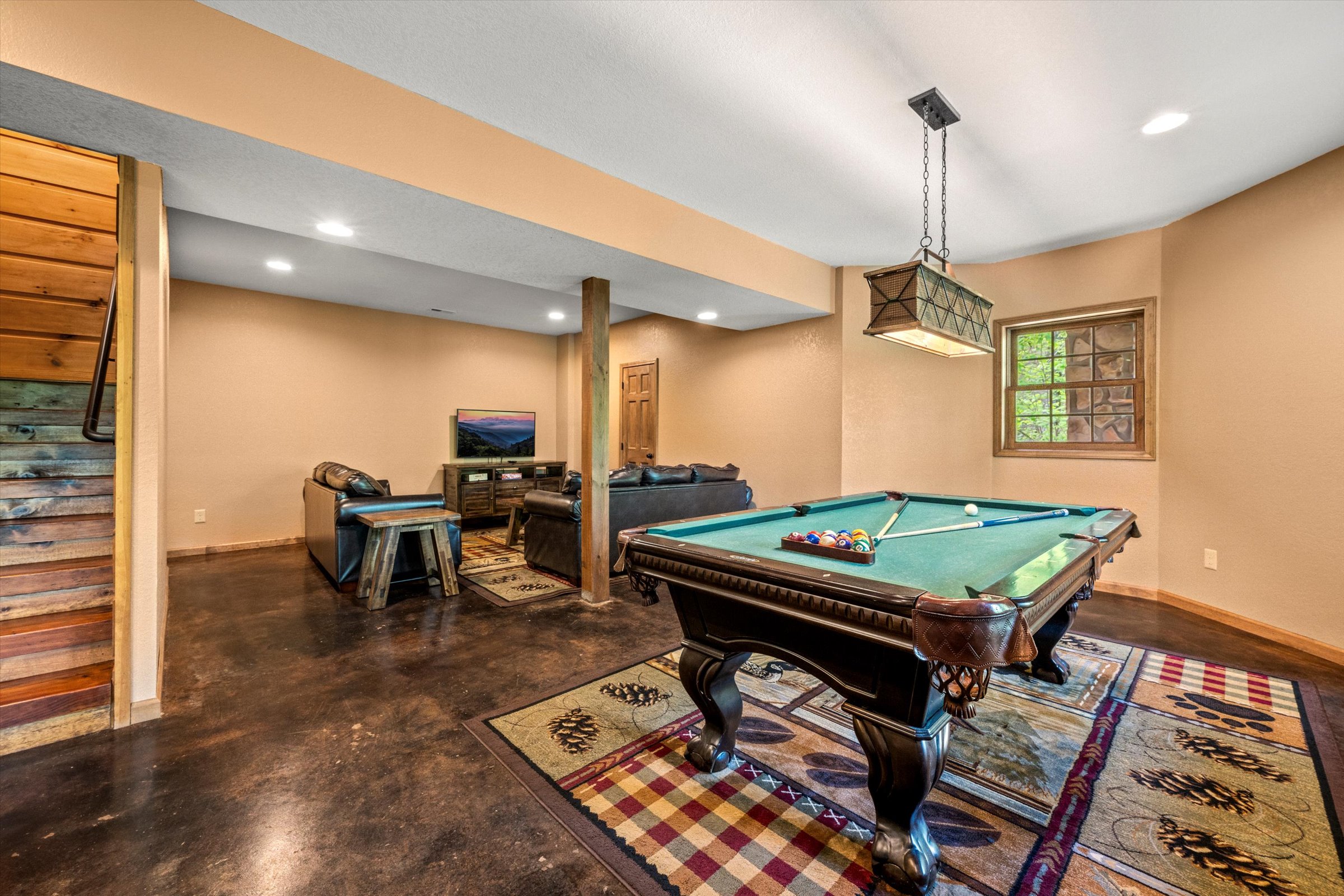 * Rec room with a large flat-screen TV, pool table, and barrel-style arcade game