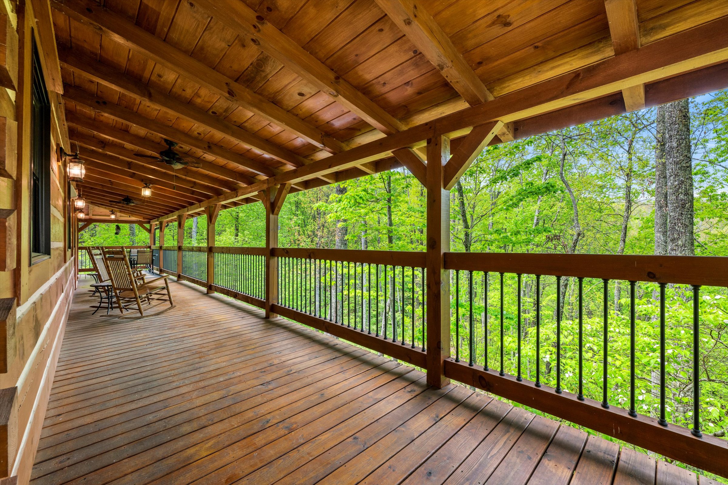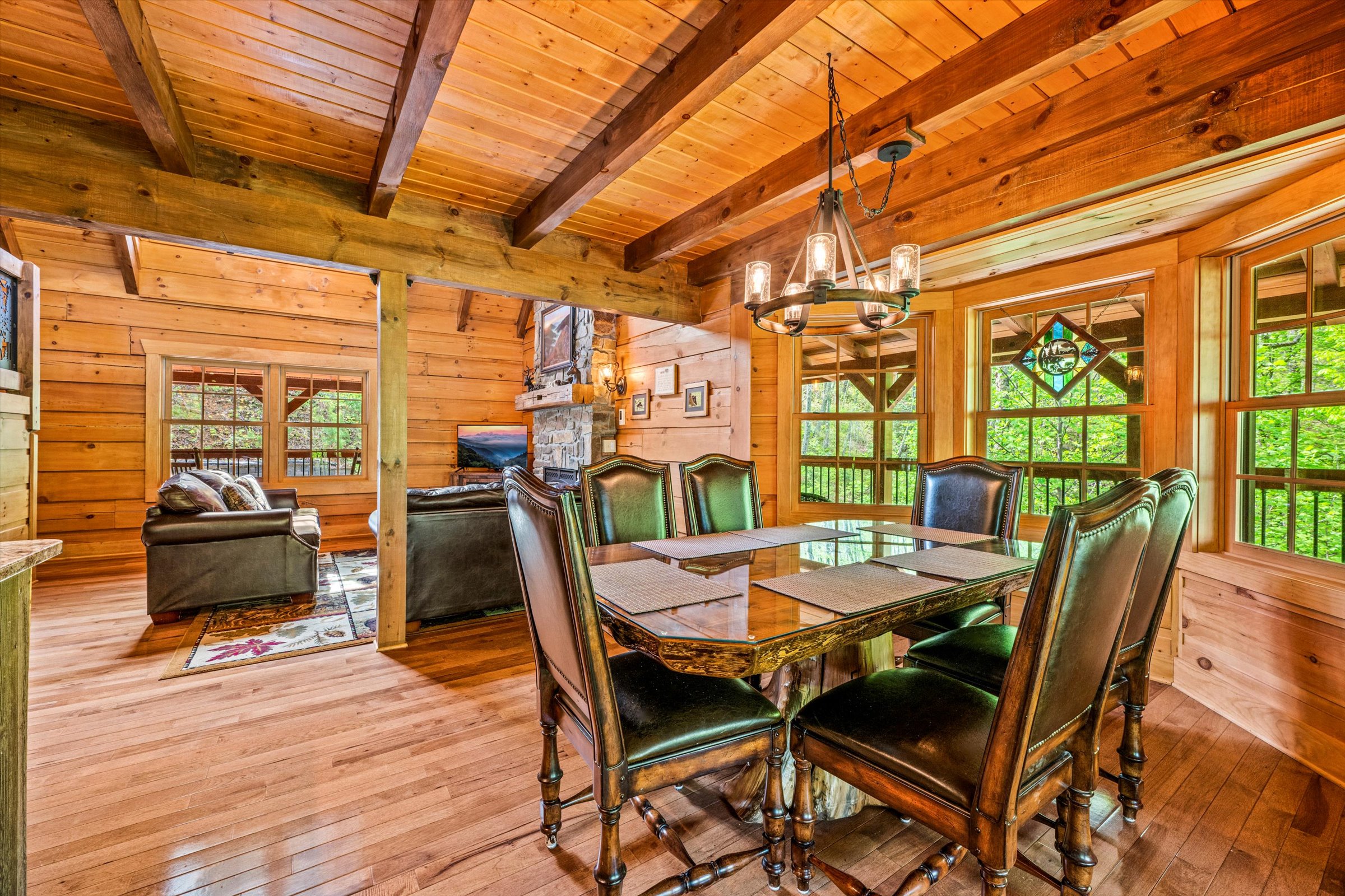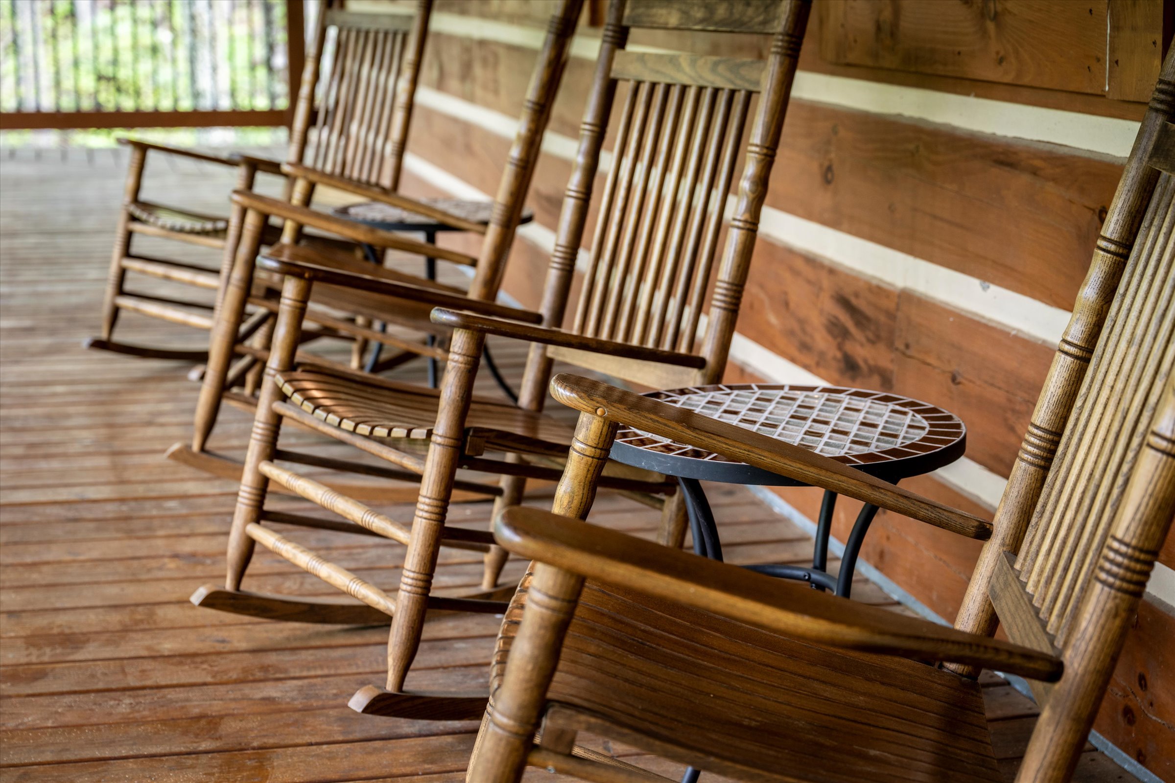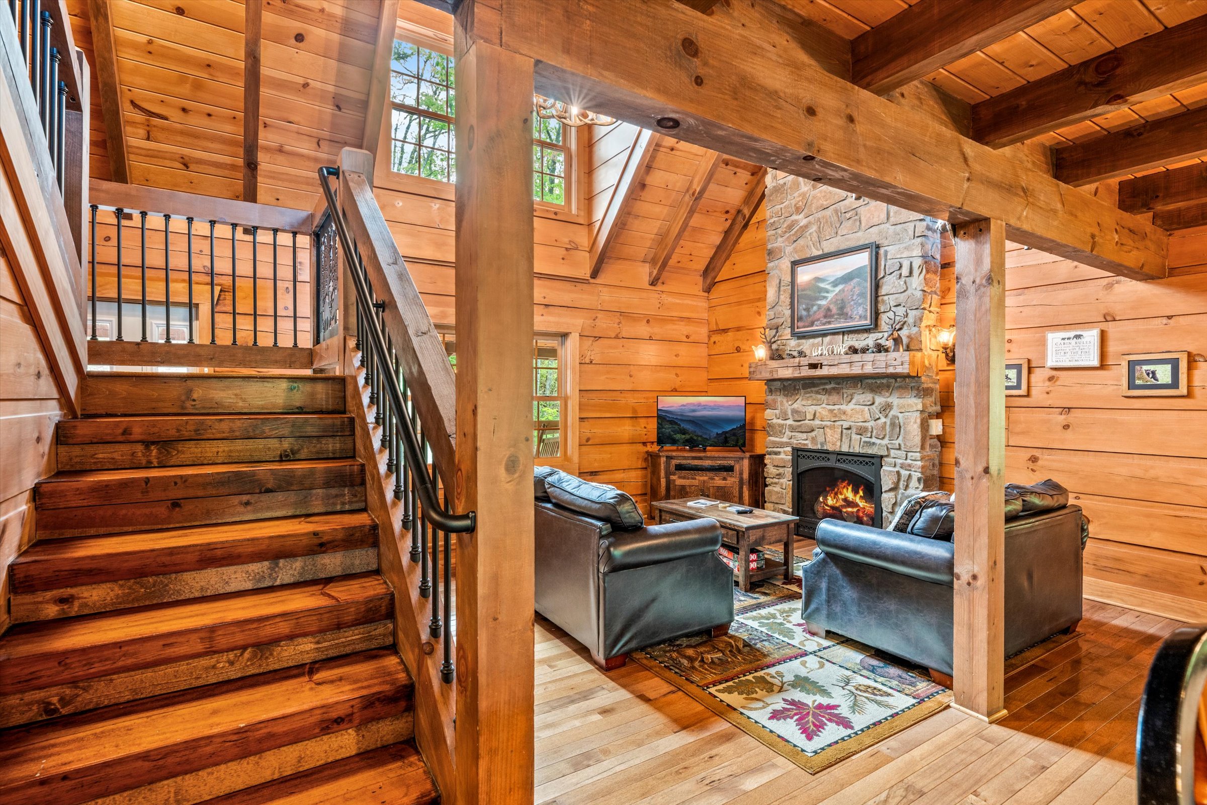Step outside onto the main level’s wraparound deck, where you’ll find outdoor seating, a dining table, and classic rocking chairs—the ideal spot to unwind and soak in the serene mountain landscape.