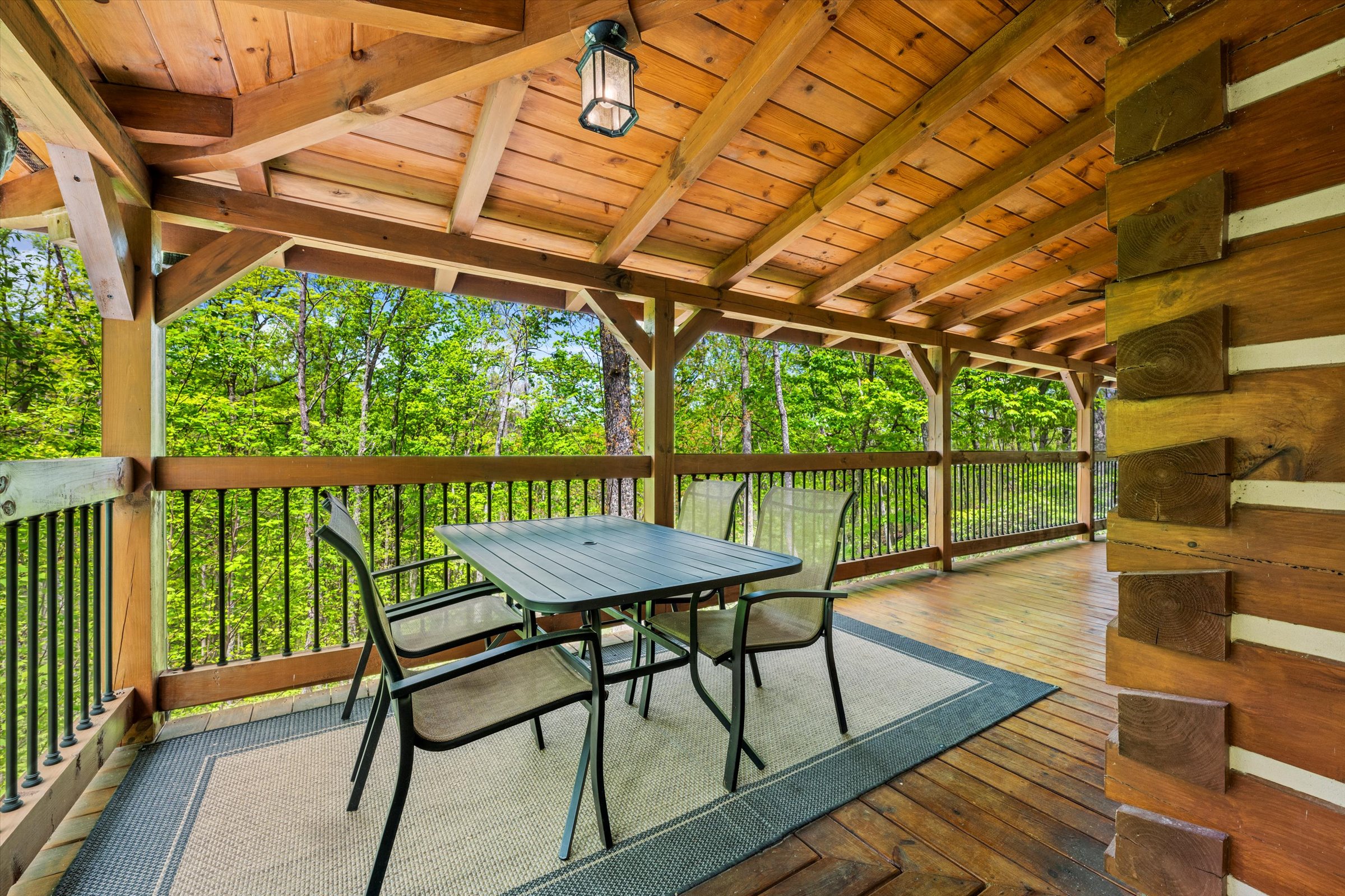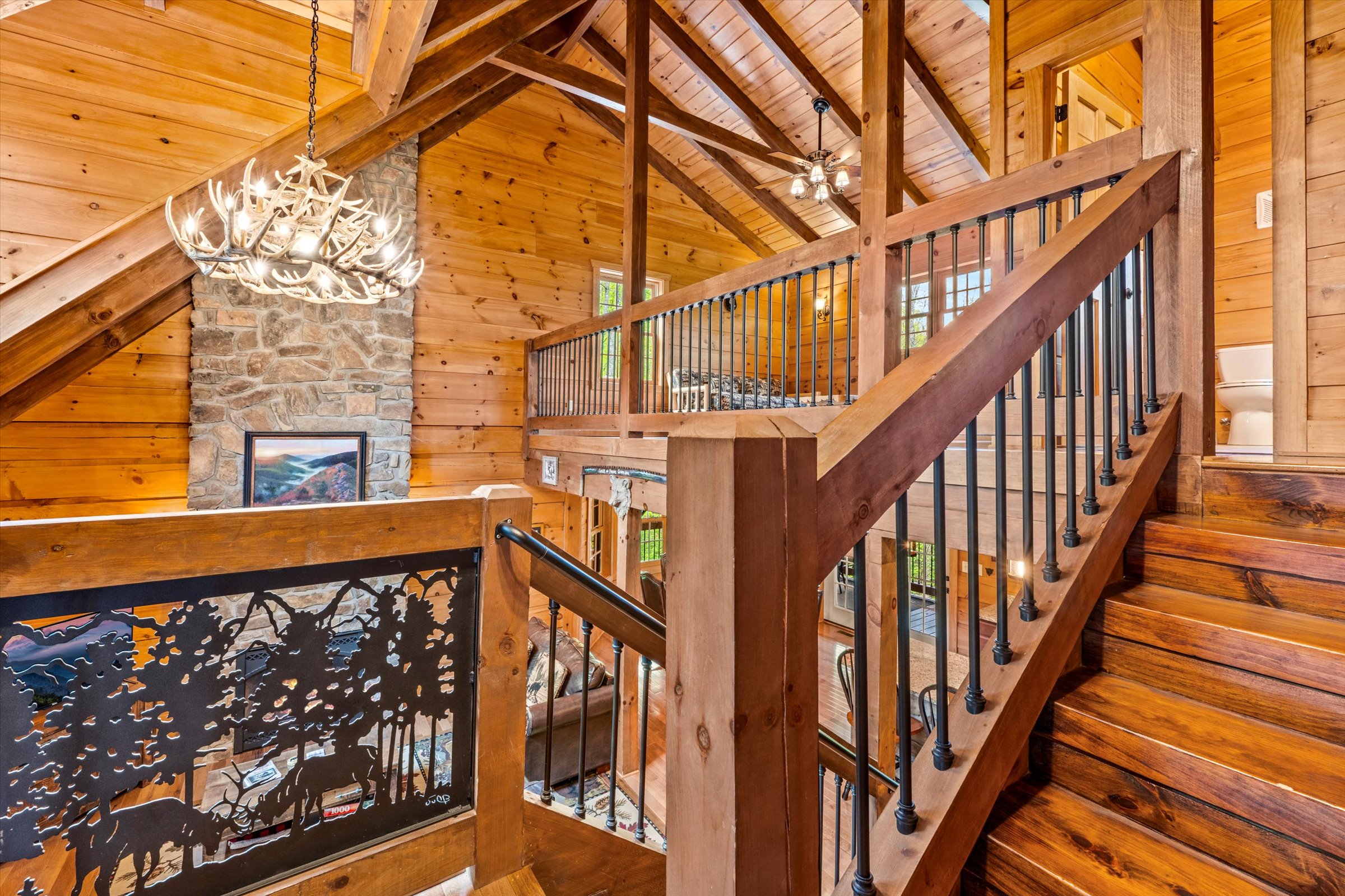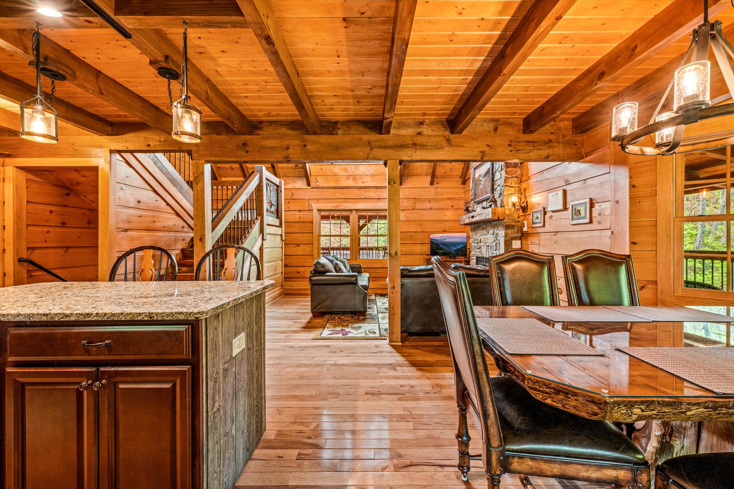 Step outside onto the main level’s wraparound deck, where you’ll find outdoor seating, a dining table, and classic rocking chairs—the ideal spot to unwind and soak in the serene mountain landscape.