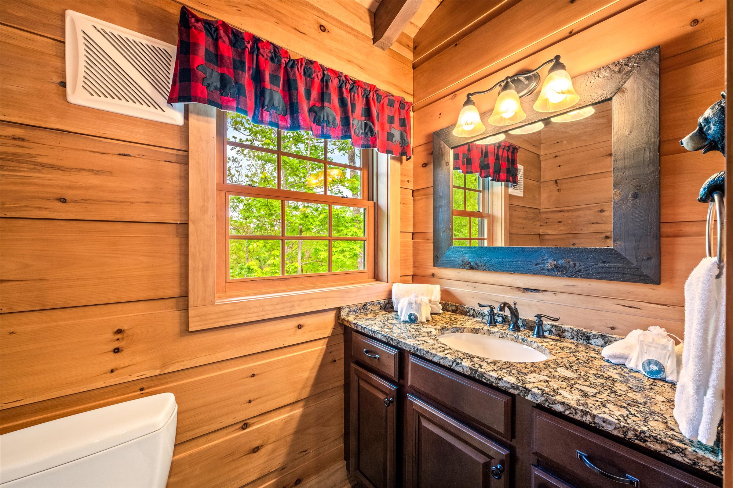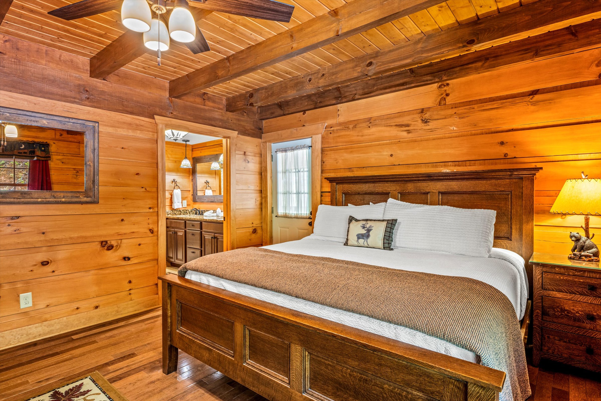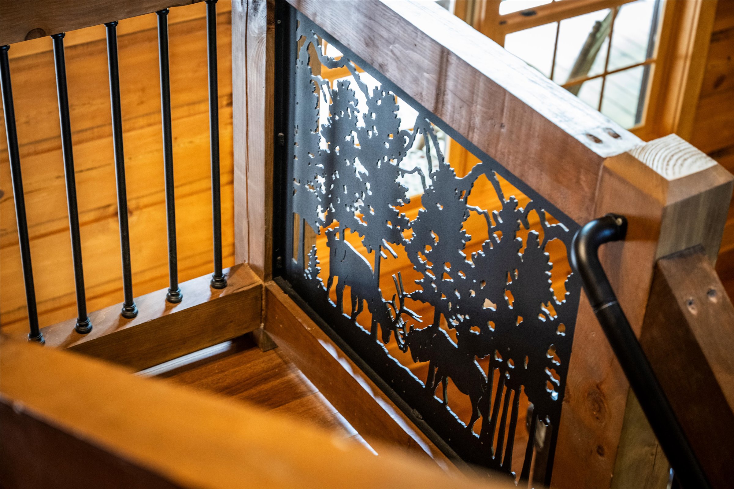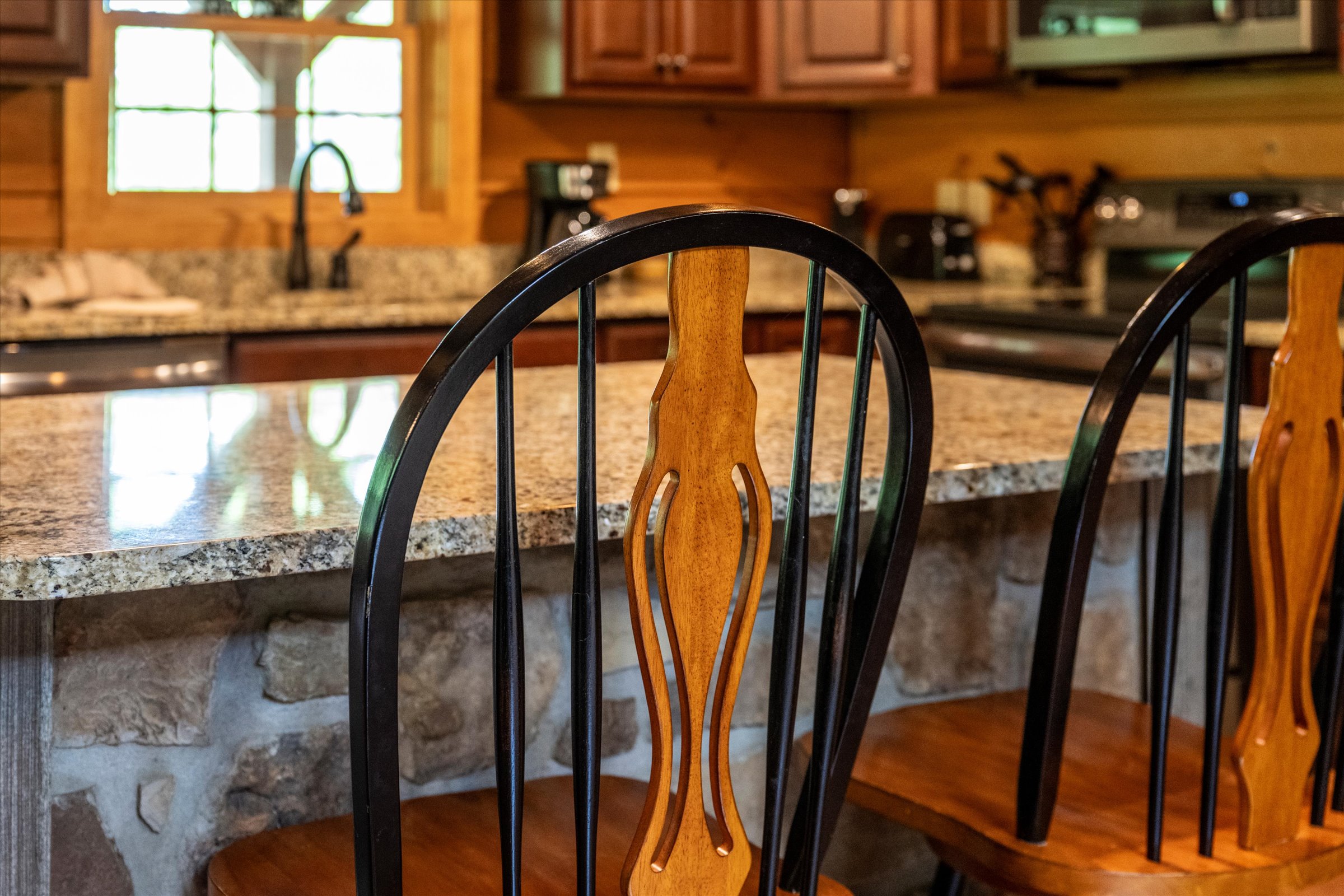 Step outside onto the main level’s wraparound deck, where you’ll find outdoor seating, a dining table, and classic rocking chairs—the ideal spot to unwind and soak in the serene mountain landscape.