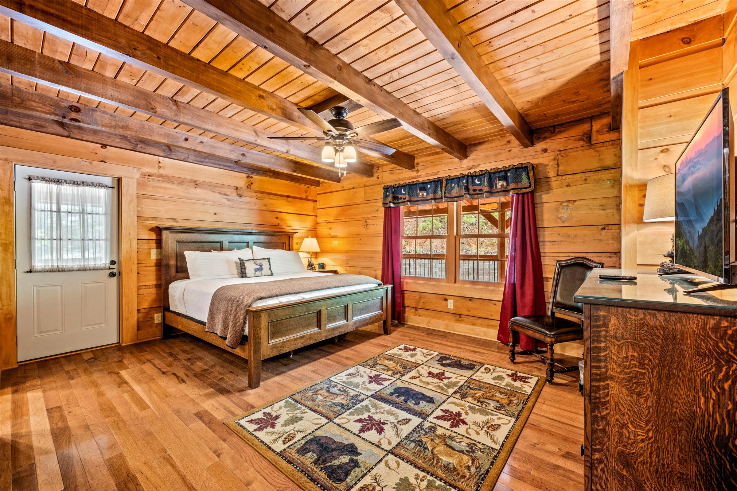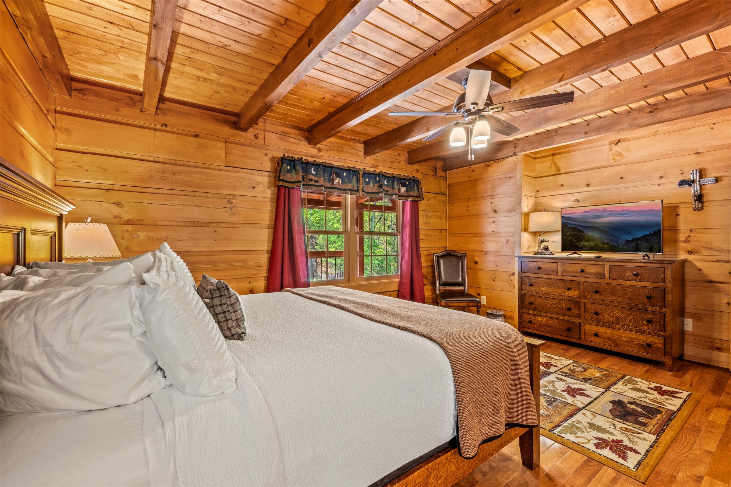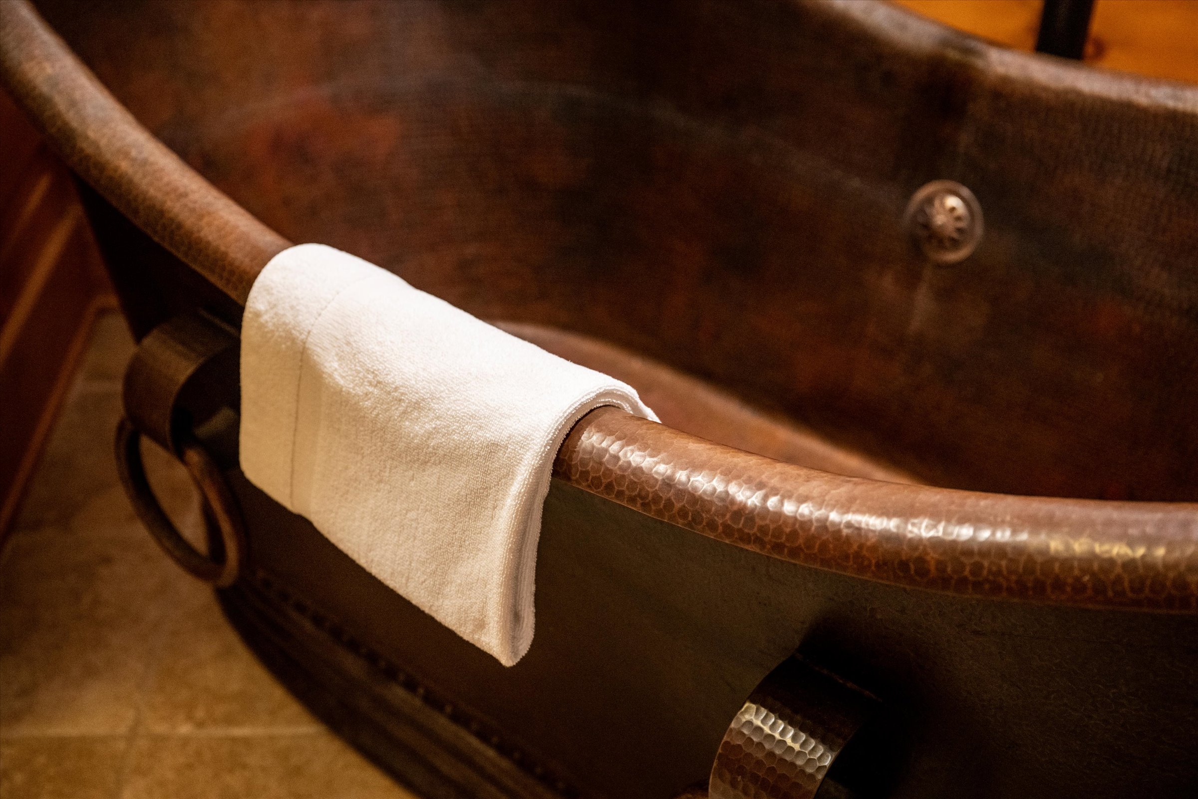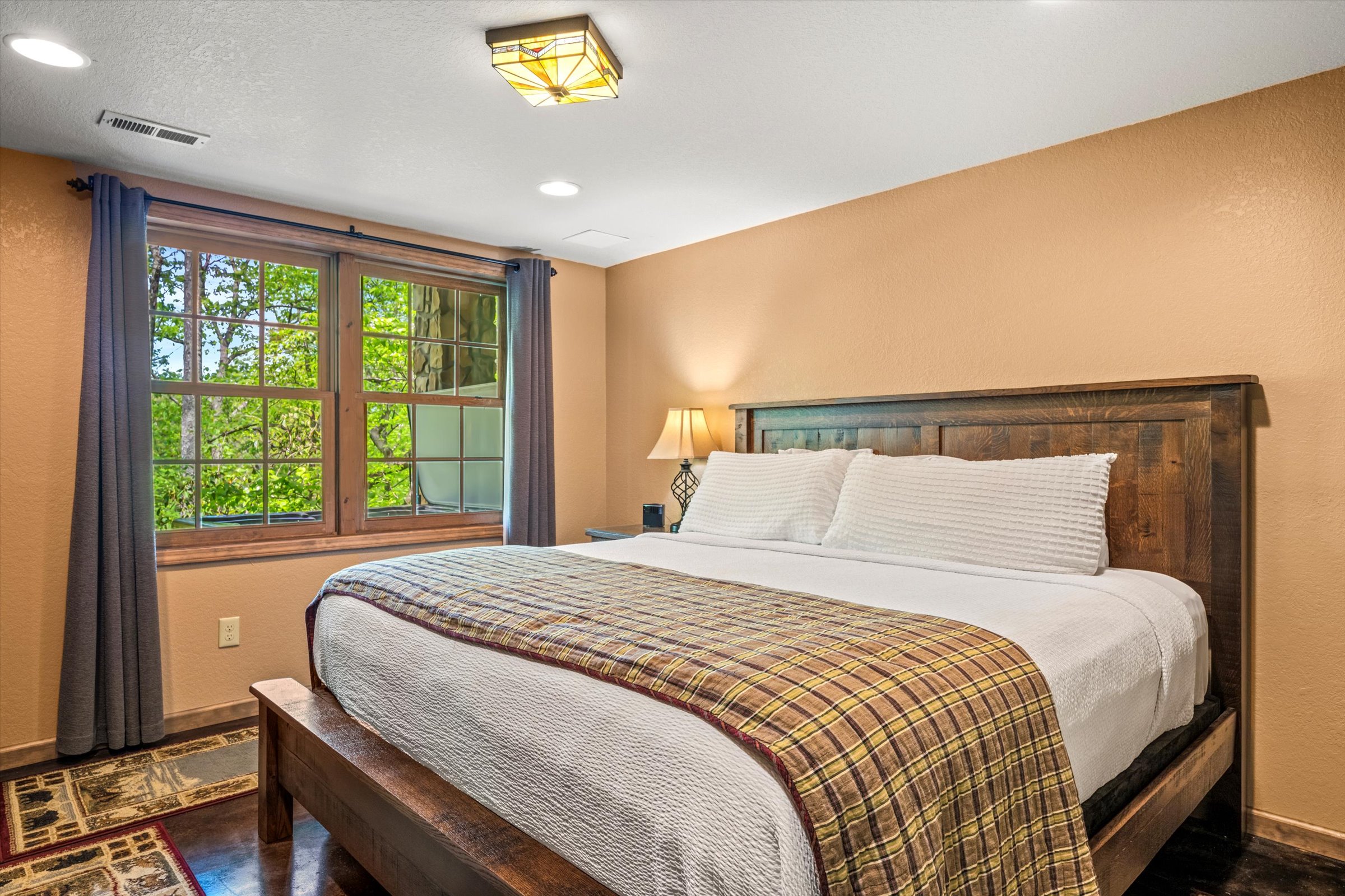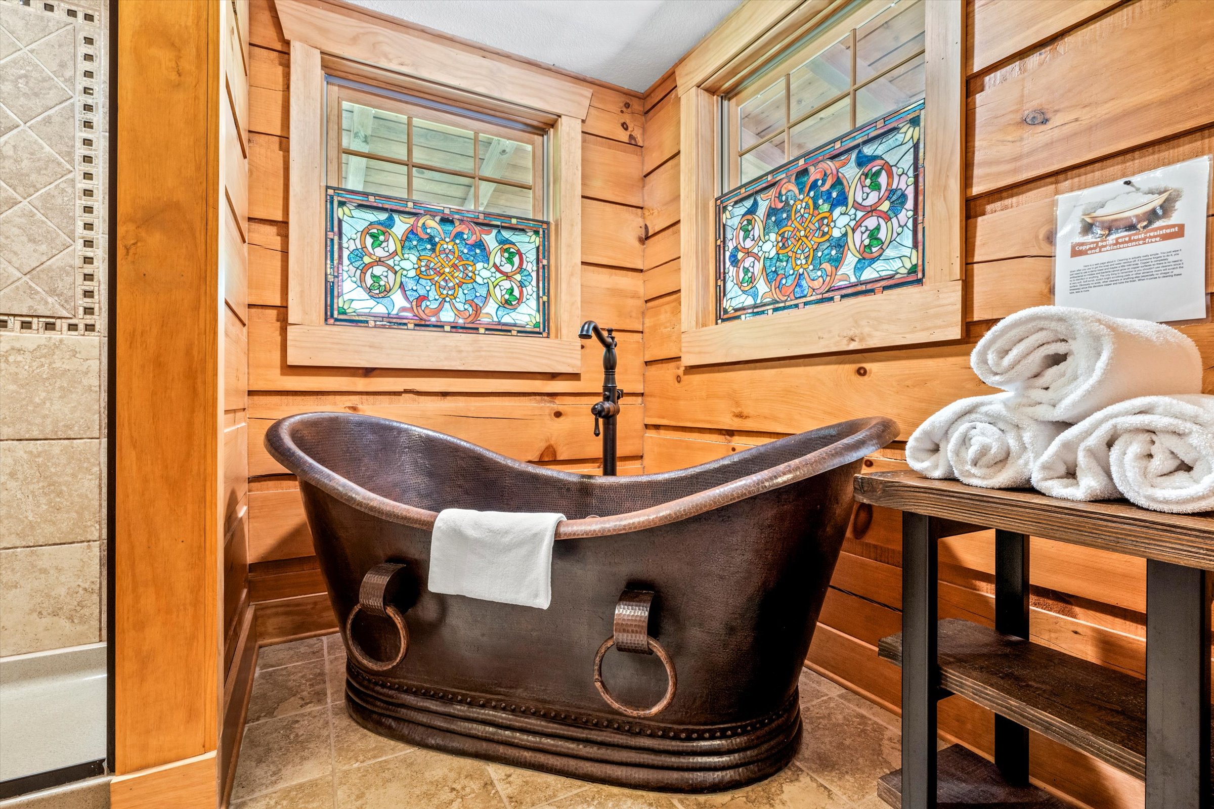 Just around the corner, a king bedroom suite offers a plush bed, dresser, and flat-screen TV. The ensuite bathroom is both spacious and refined, featuring a copper soaking tub and a walk-in shower.