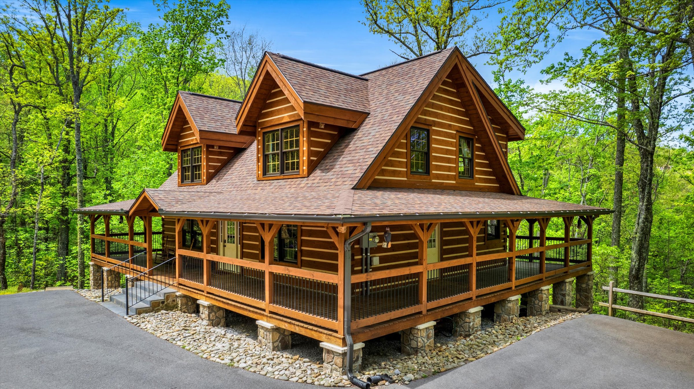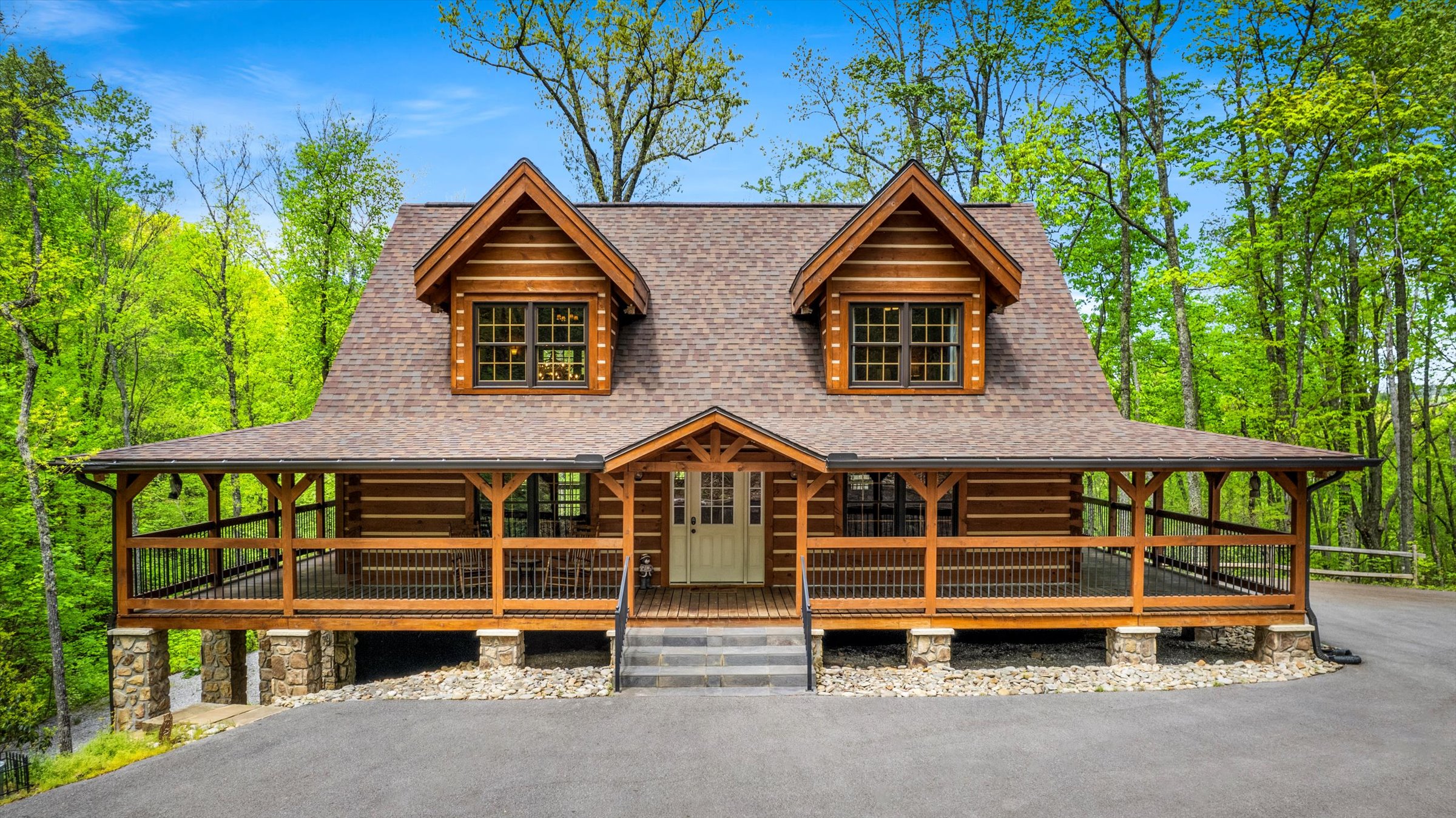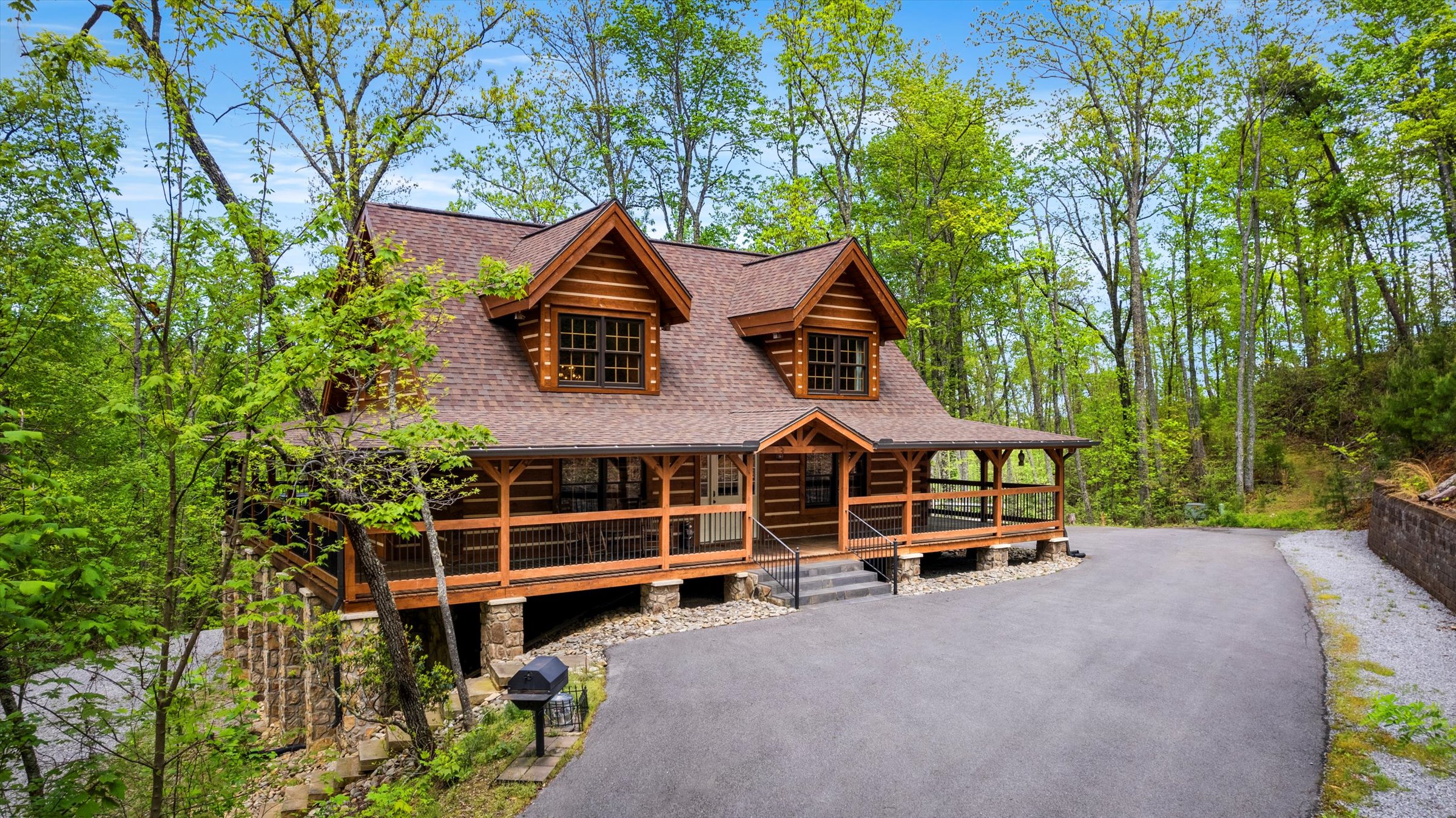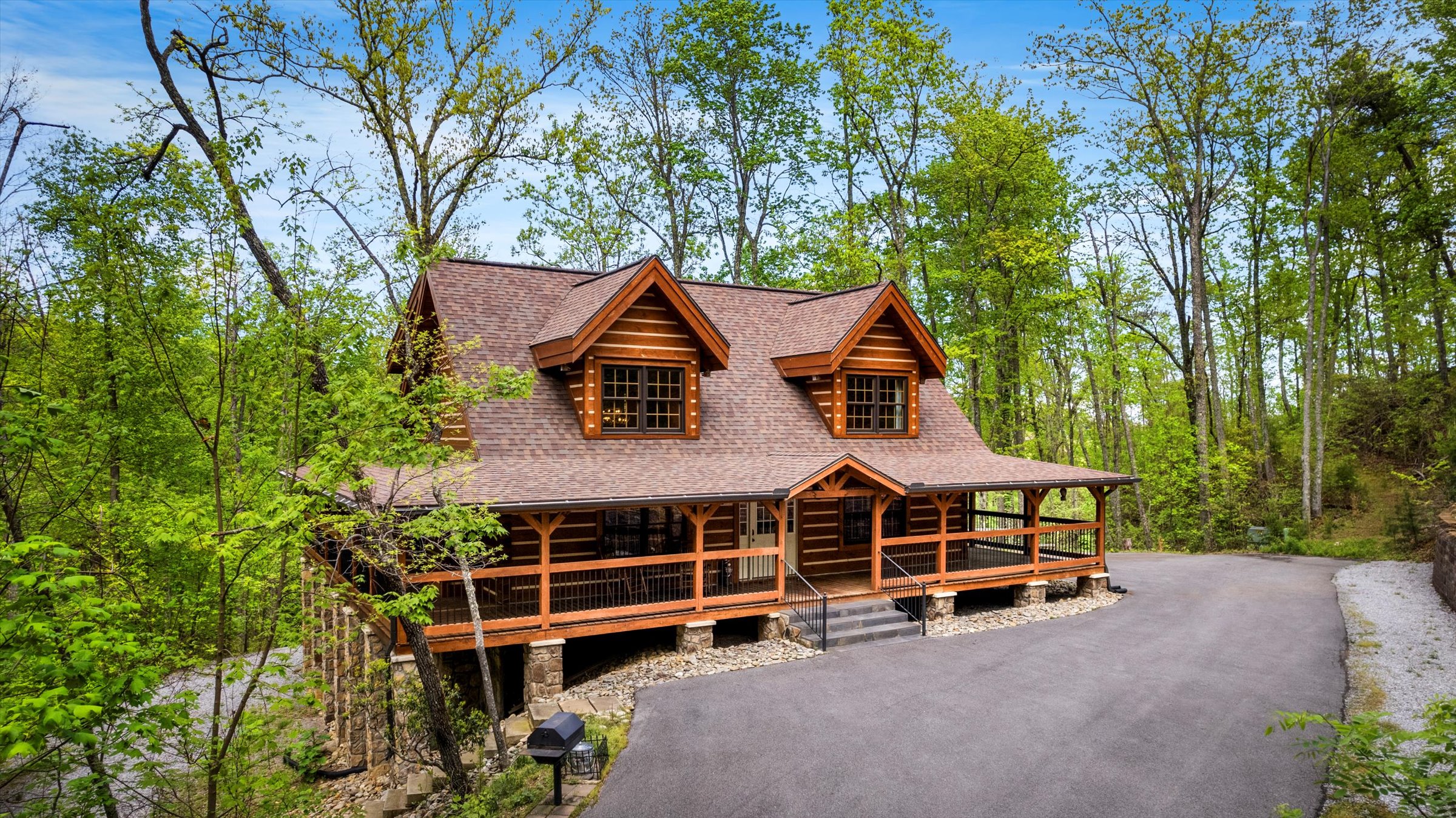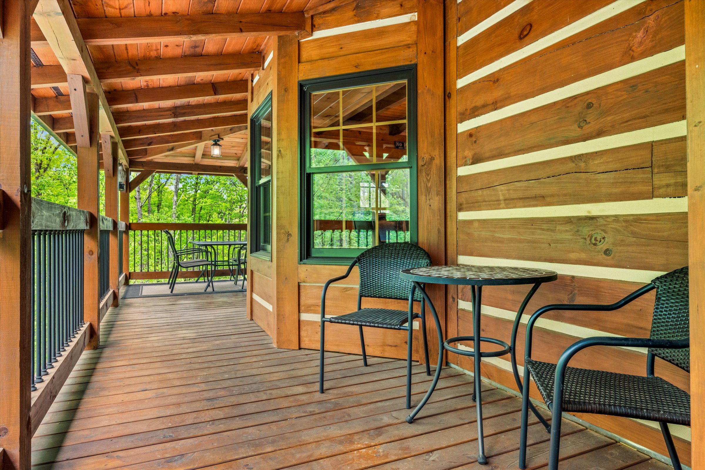 Upon arrival, guests are welcomed by a tranquil sense of privacy. The private drive, less than a mile from downtown Gatlinburg, winds you through the acreage with opportunities for private hiking and exploring.. The flat, paved parking area provides generous space for multiple vehicles, ensuring easy unloading. A park-style grill is available for outdoor cooking—just remember to bring charcoal for your barbeque enthusiast. Ascend four steps to the expansive, covered front porch, which gracefully wraps around the entire main level.