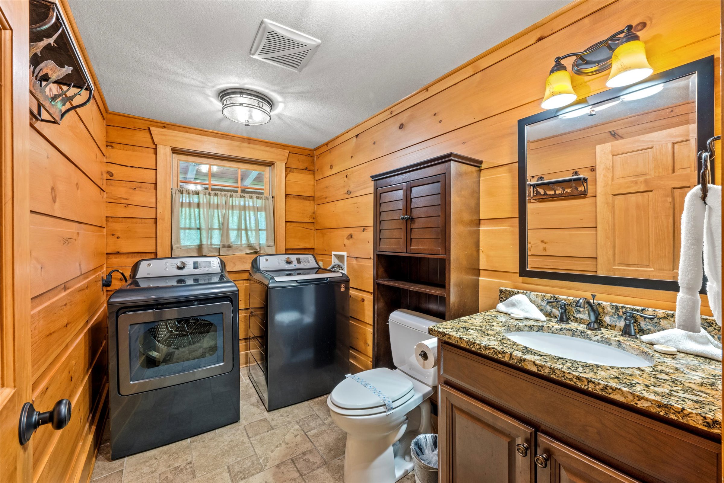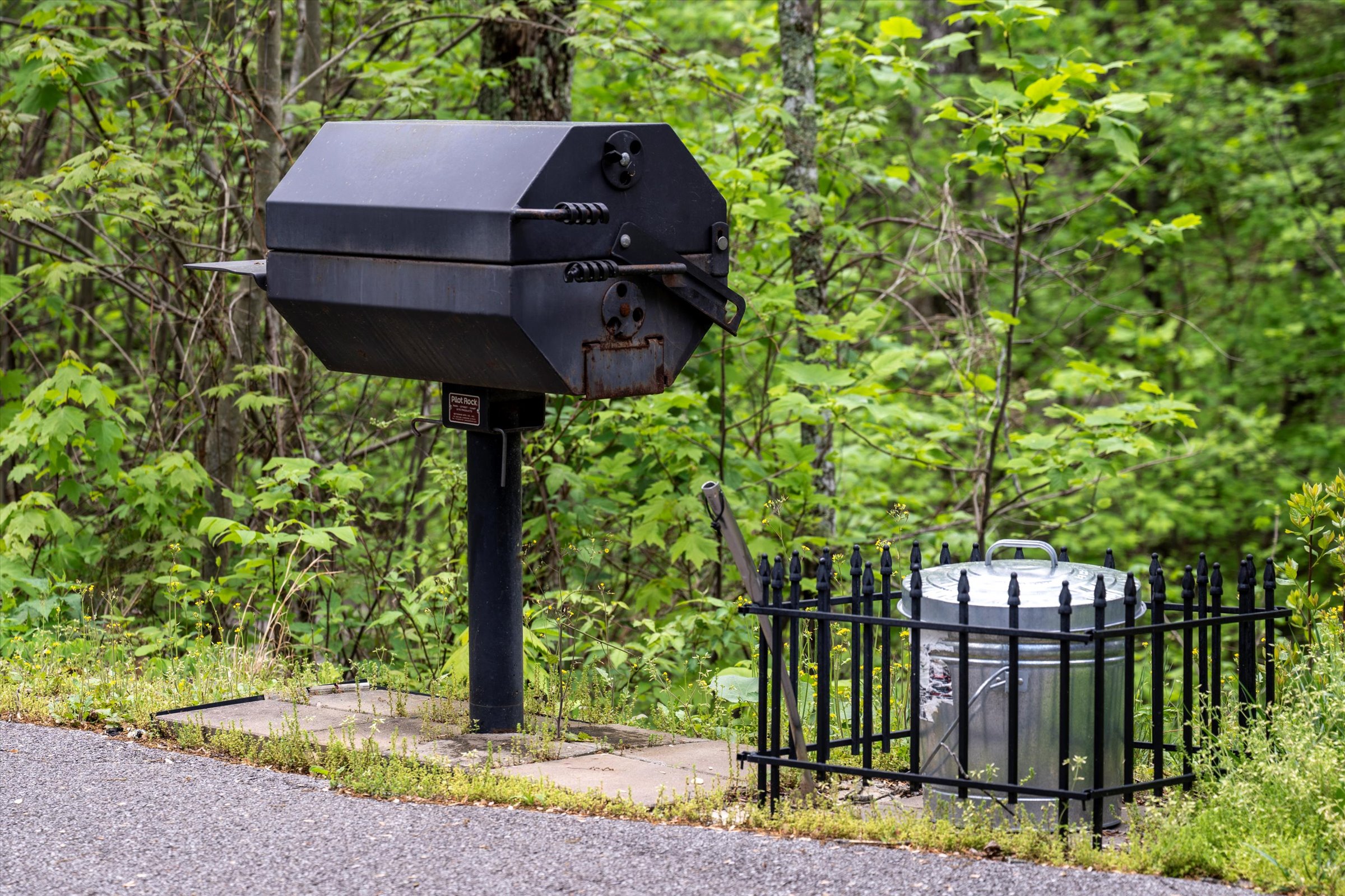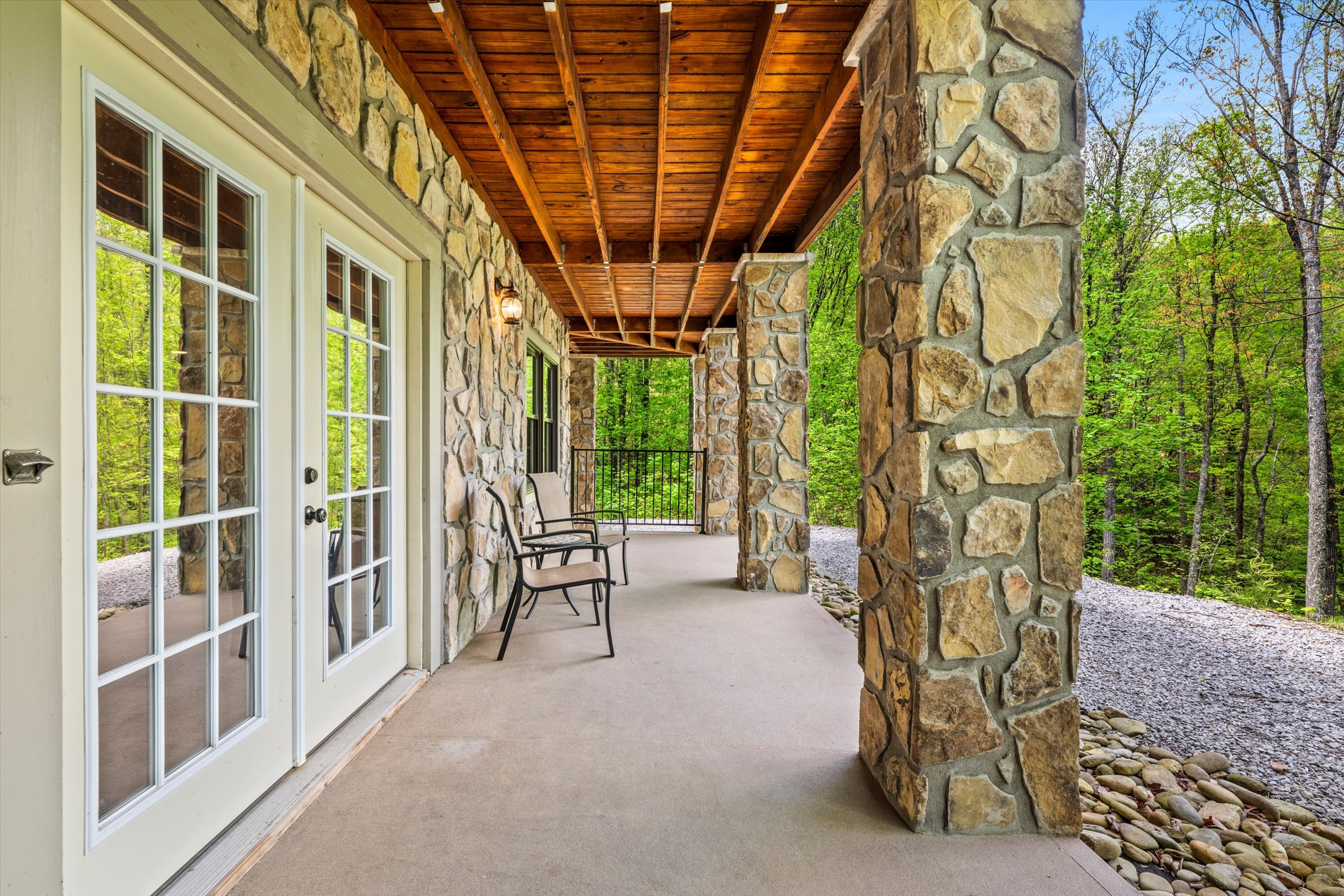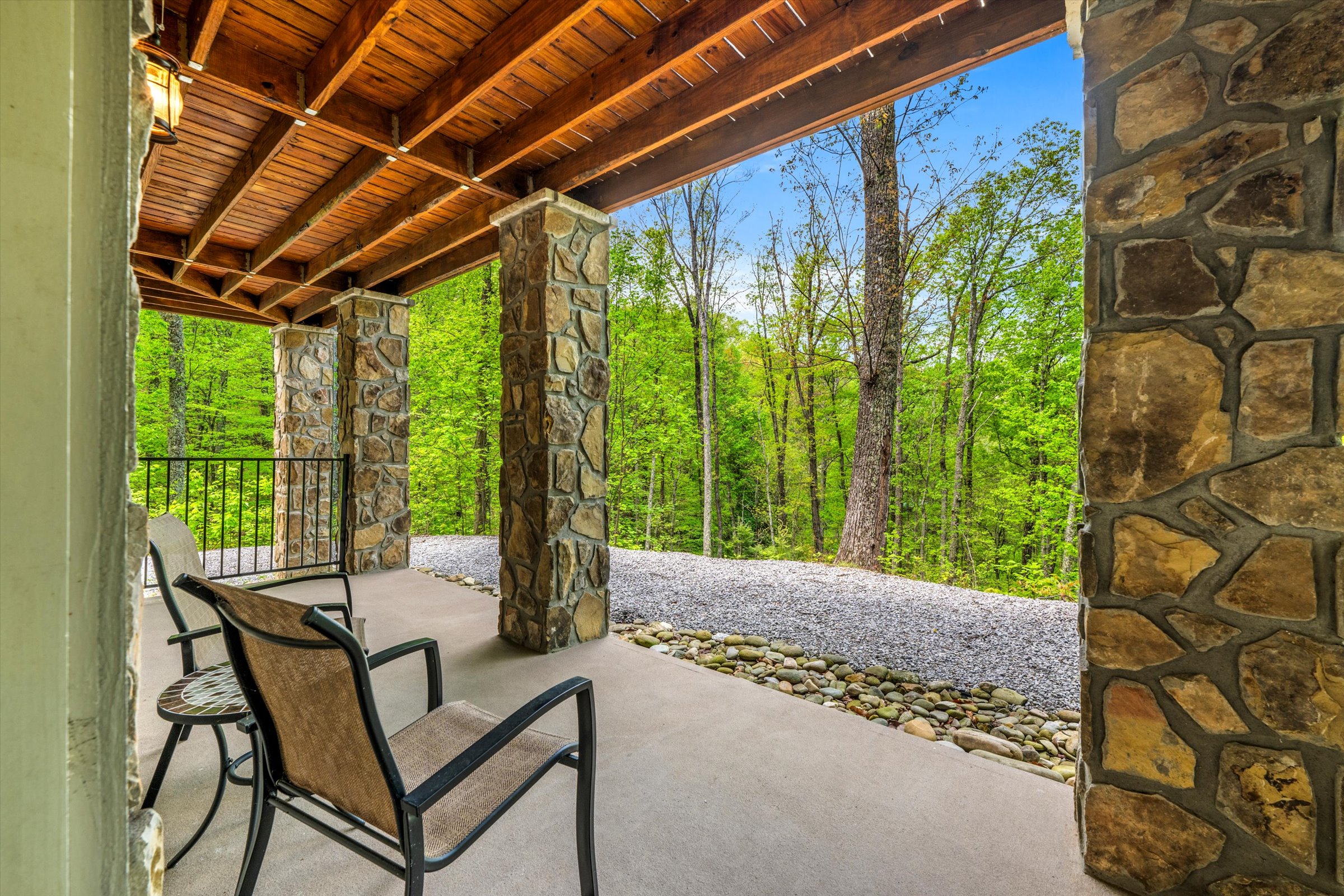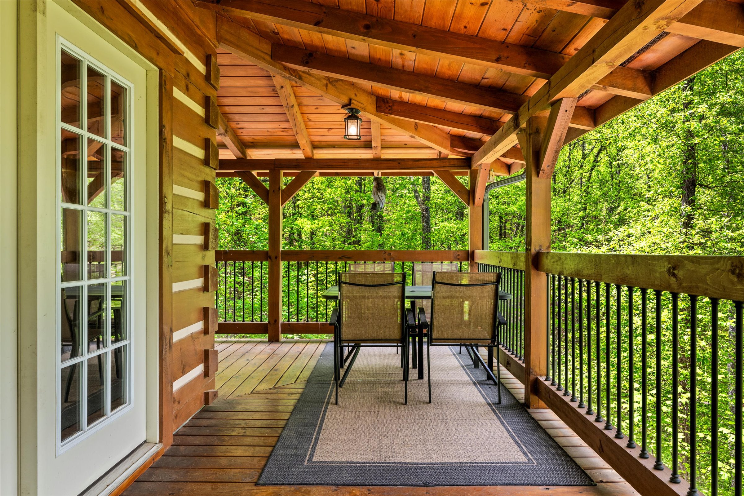 Upon arrival, guests are welcomed by a tranquil sense of privacy. The private drive, less than a mile from downtown Gatlinburg, winds you through the acreage with opportunities for private hiking and exploring.. The flat, paved parking area provides generous space for multiple vehicles, ensuring easy unloading. A park-style grill is available for outdoor cooking—just remember to bring charcoal for your barbeque enthusiast. Ascend four steps to the expansive, covered front porch, which gracefully wraps around the entire main level.