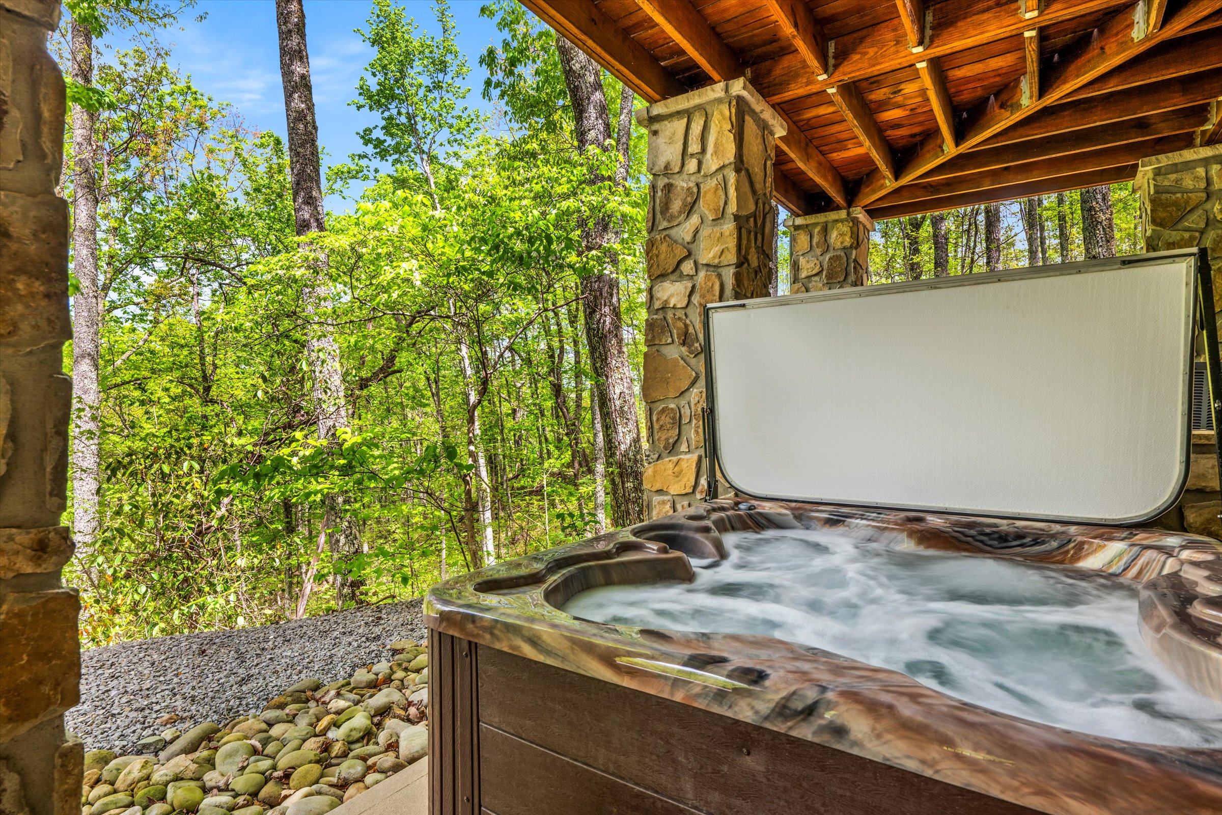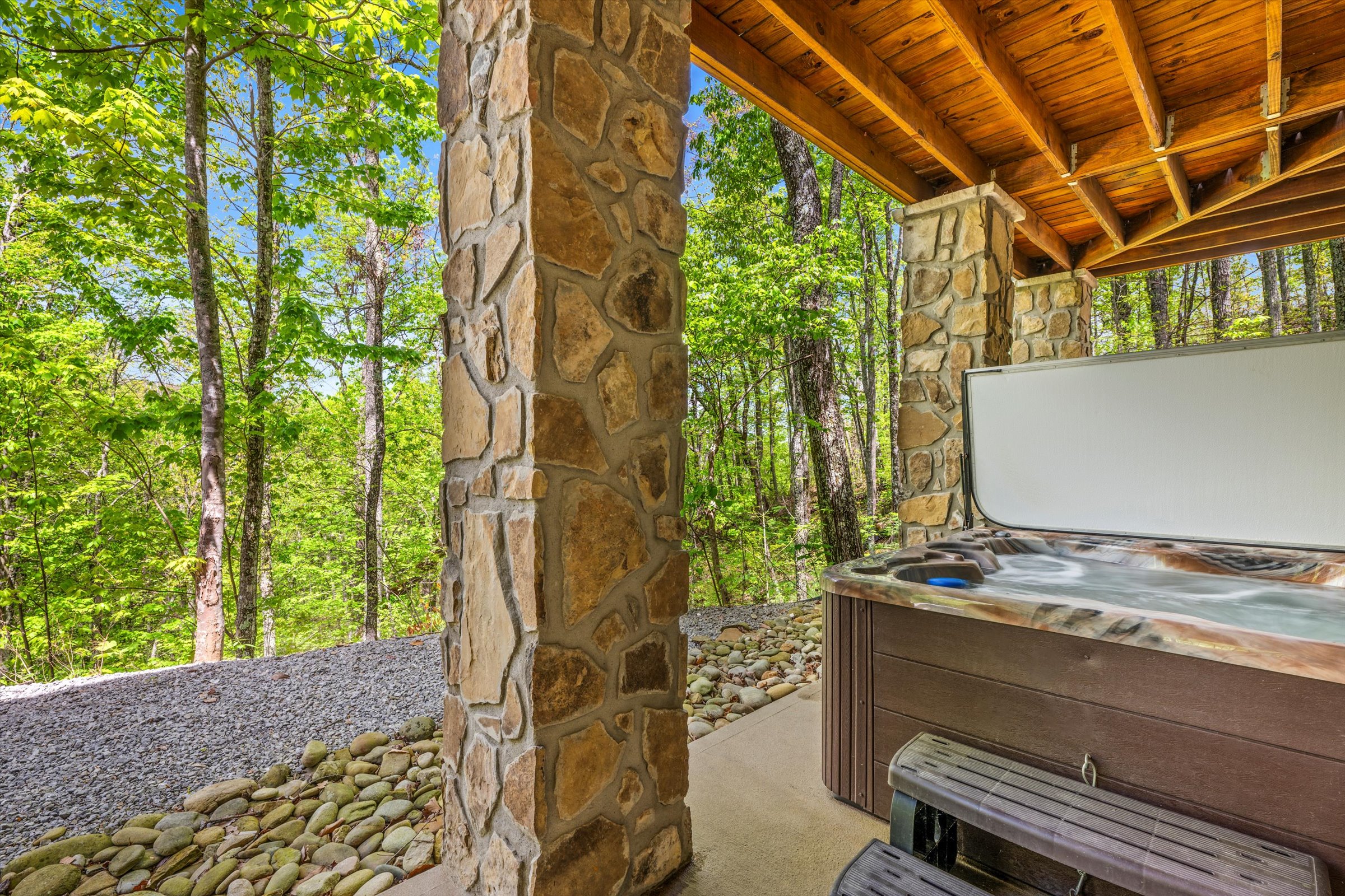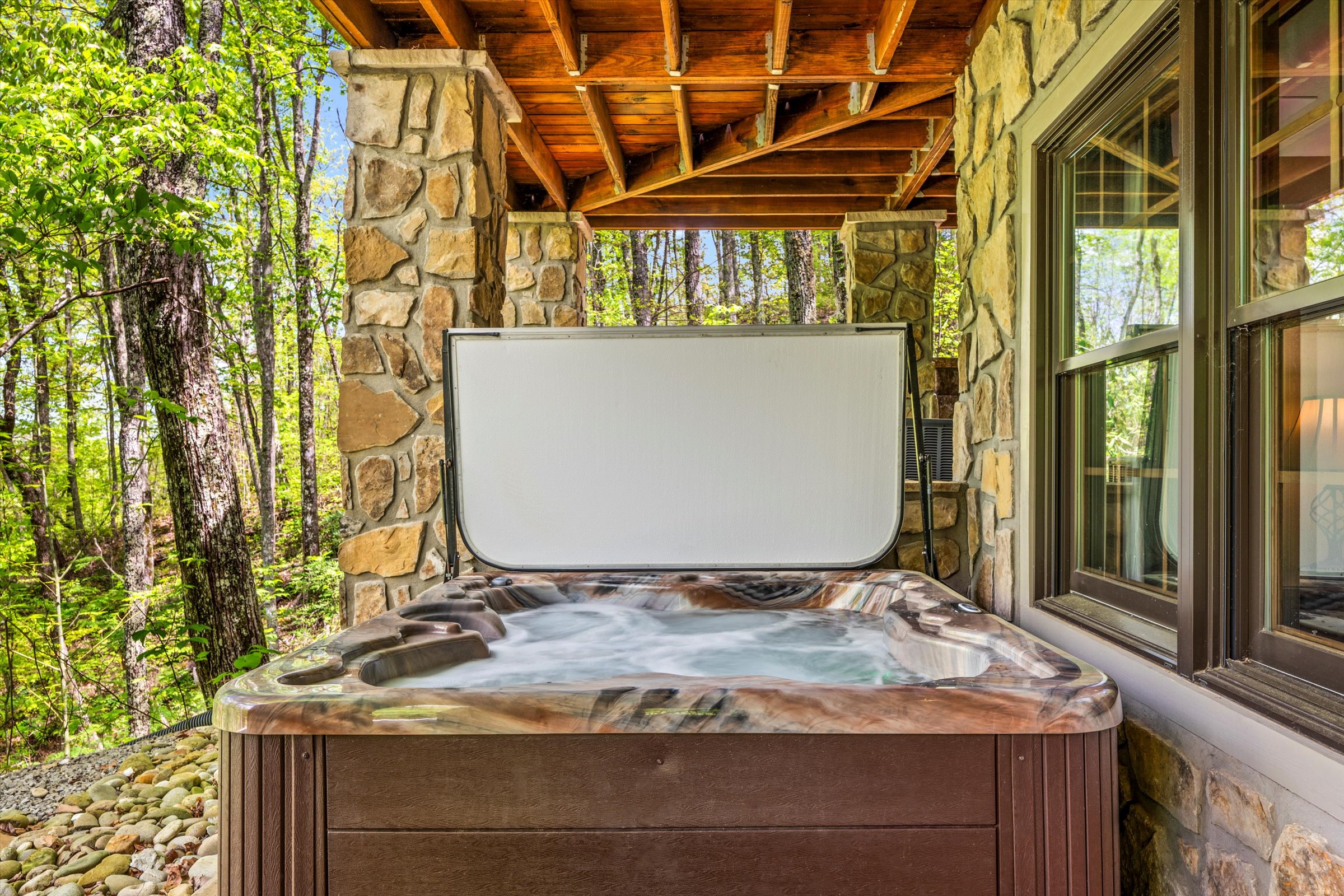 Step outside through the lower level’s exterior door to discover a bubbling hot tub, perfect for unwinding beneath the Smoky Mountain sky.