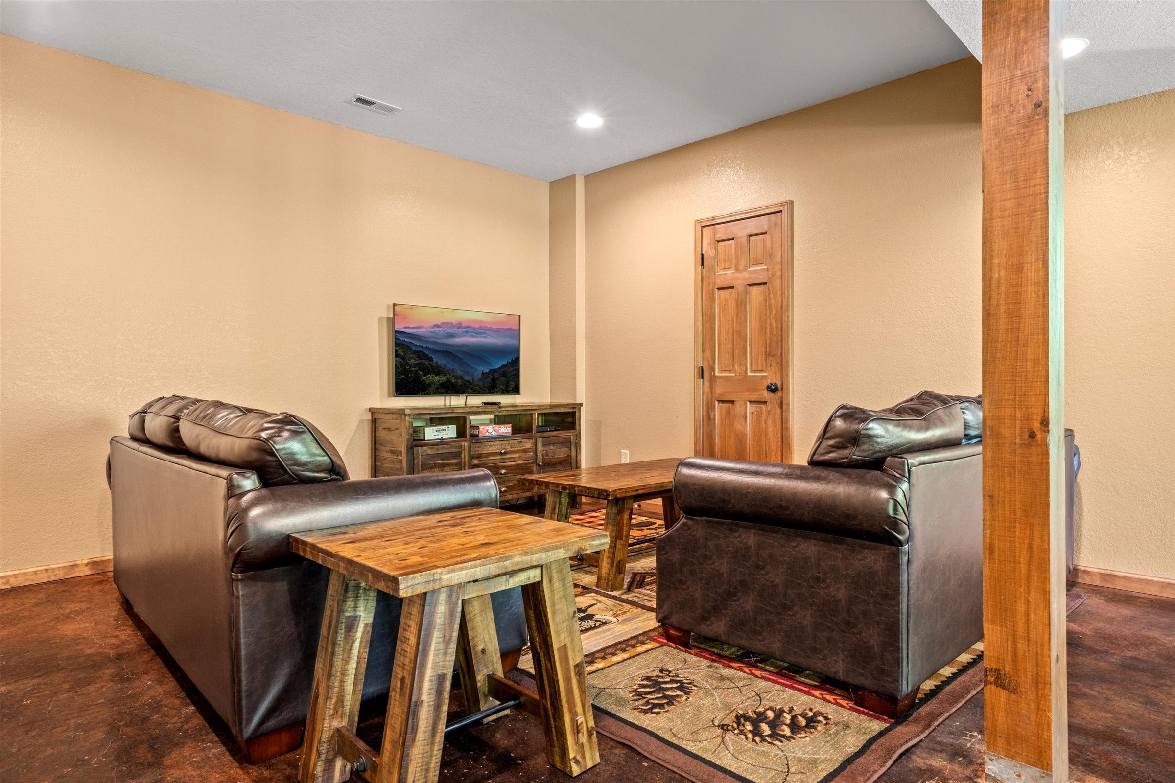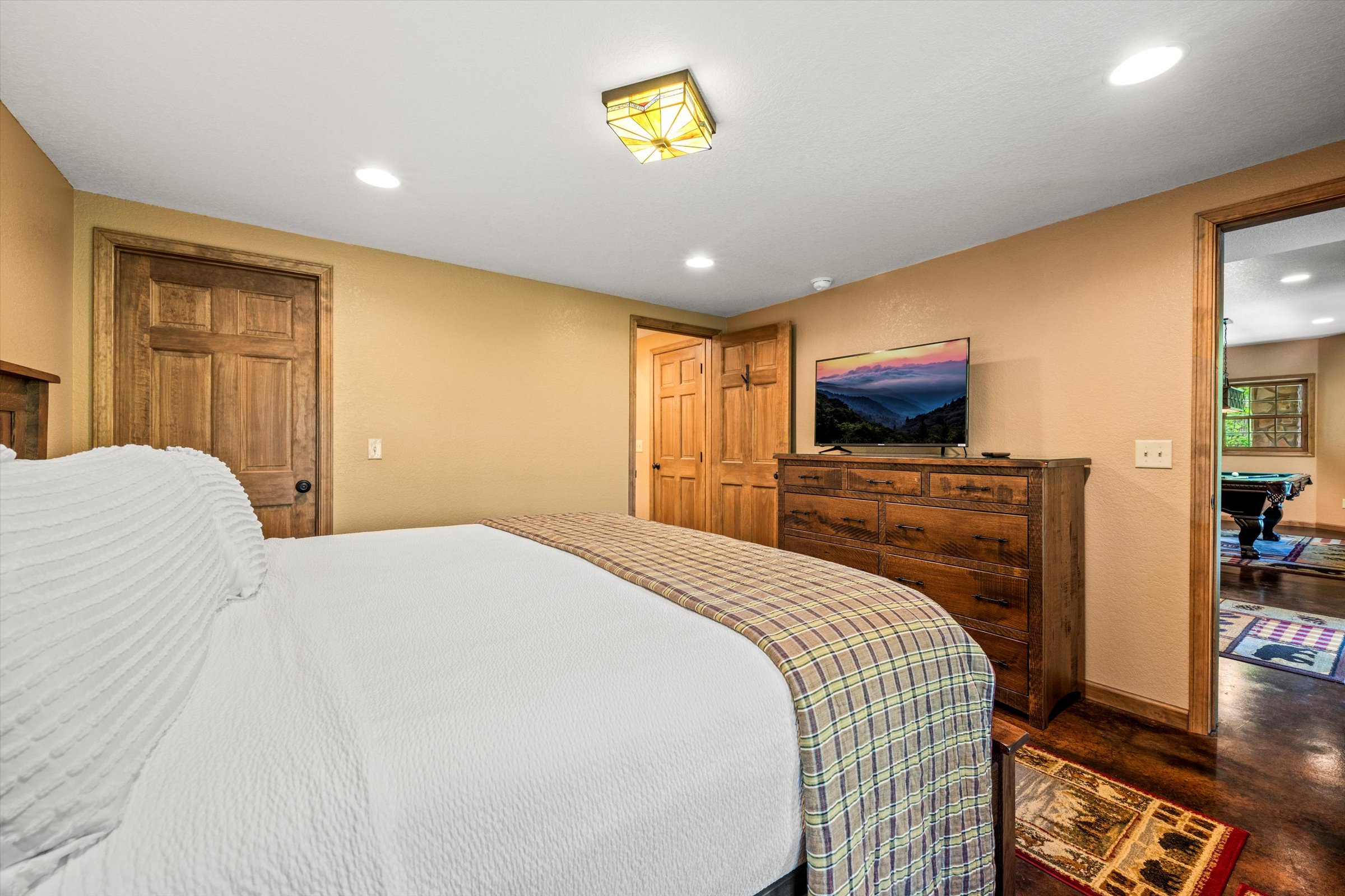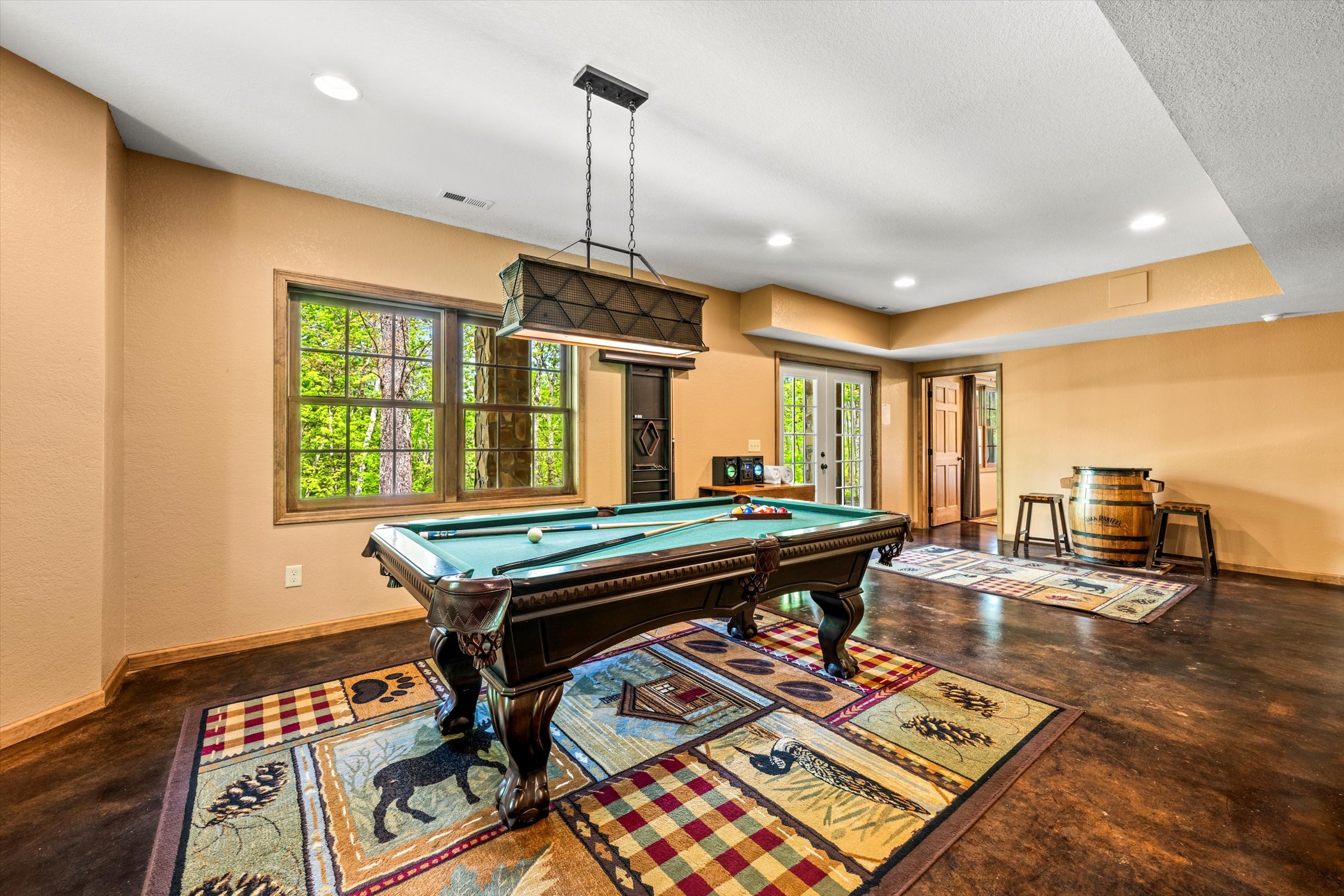 On the lower level, a king bedroom with a dresser and flat-screen TV offers further comfort. This floor also features a bonus recreation room equipped with two sofas, a TV (with DVD/Blu-ray player), a pool table, and a barrel-style arcade game, ensuring entertainment for all ages.
