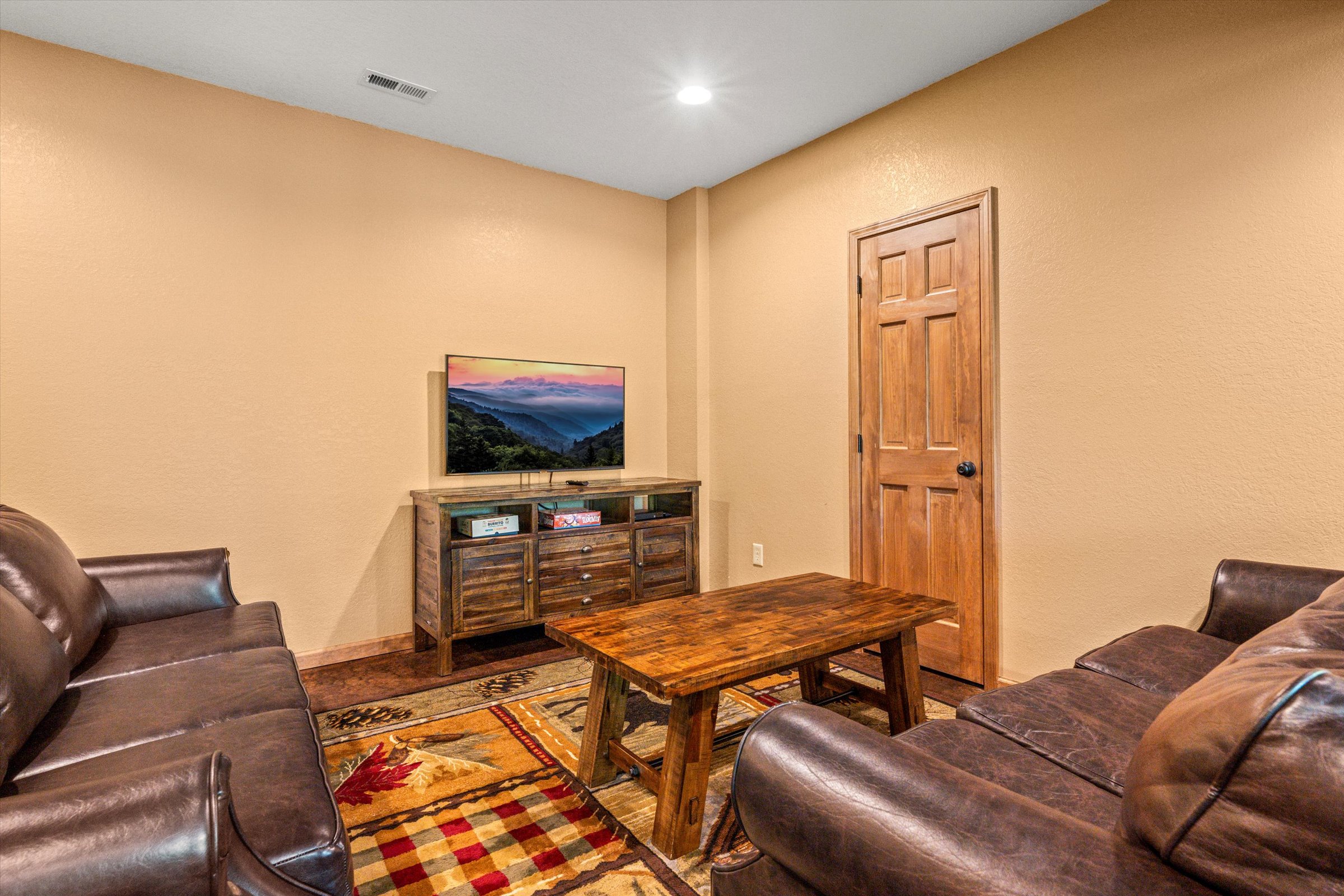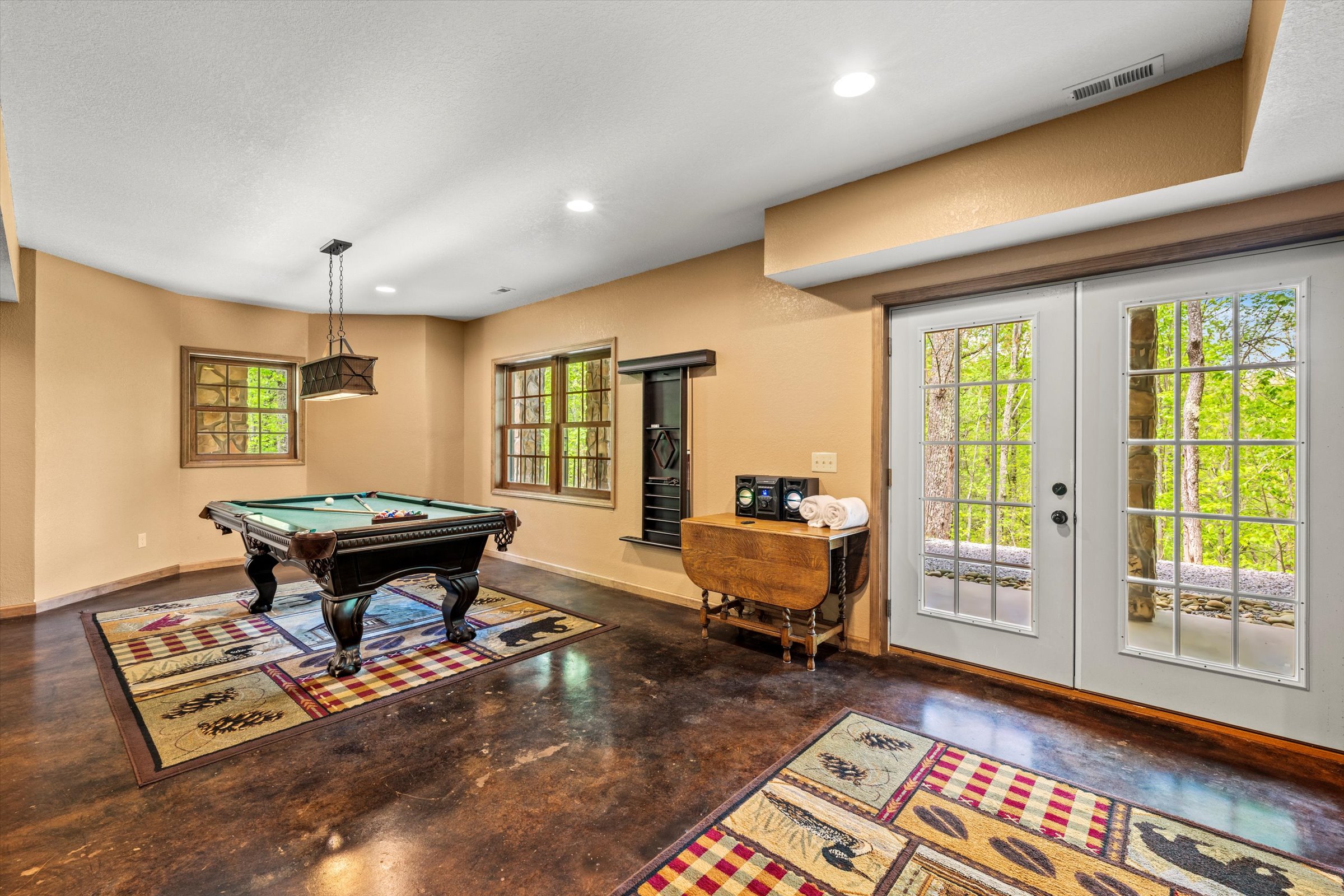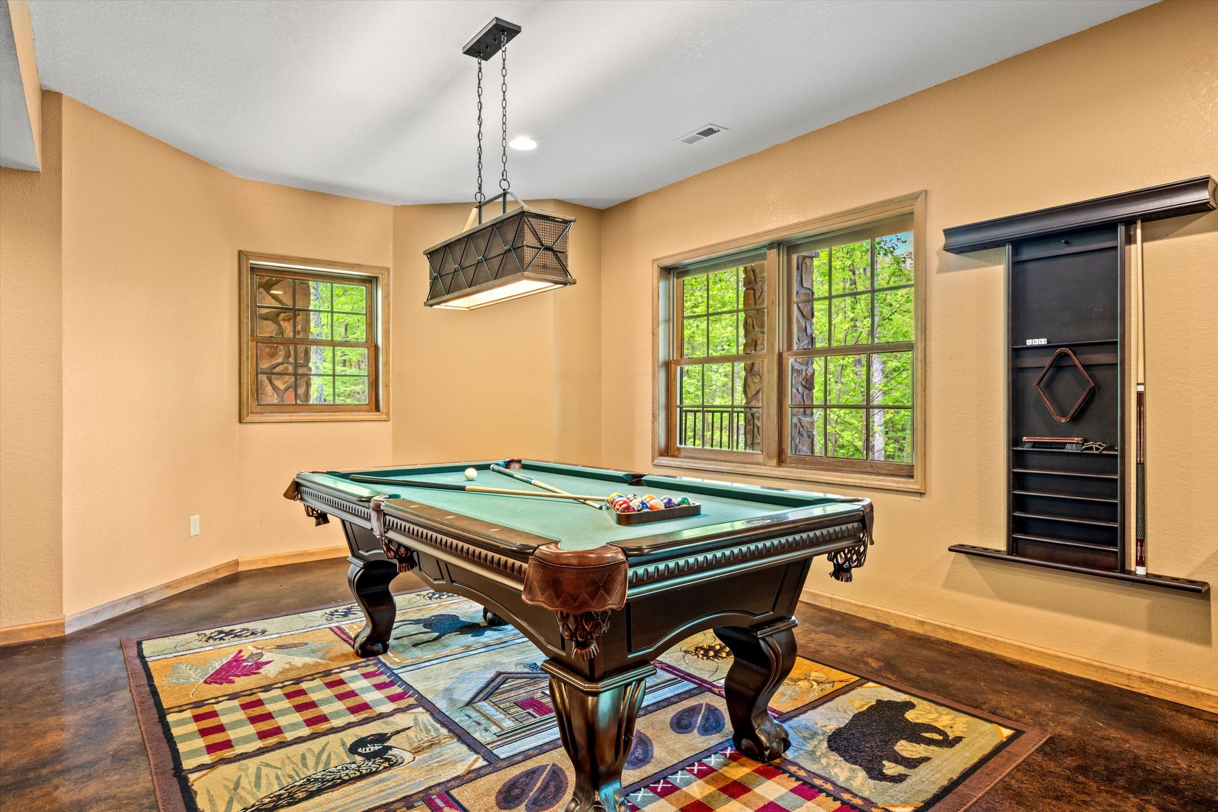 On the lower level, a king bedroom with a dresser and flat-screen TV offers further comfort. This floor also features a bonus recreation room equipped with two sofas, a TV (with DVD/Blu-ray player), a pool table, and a barrel-style arcade game, ensuring entertainment for all ages.