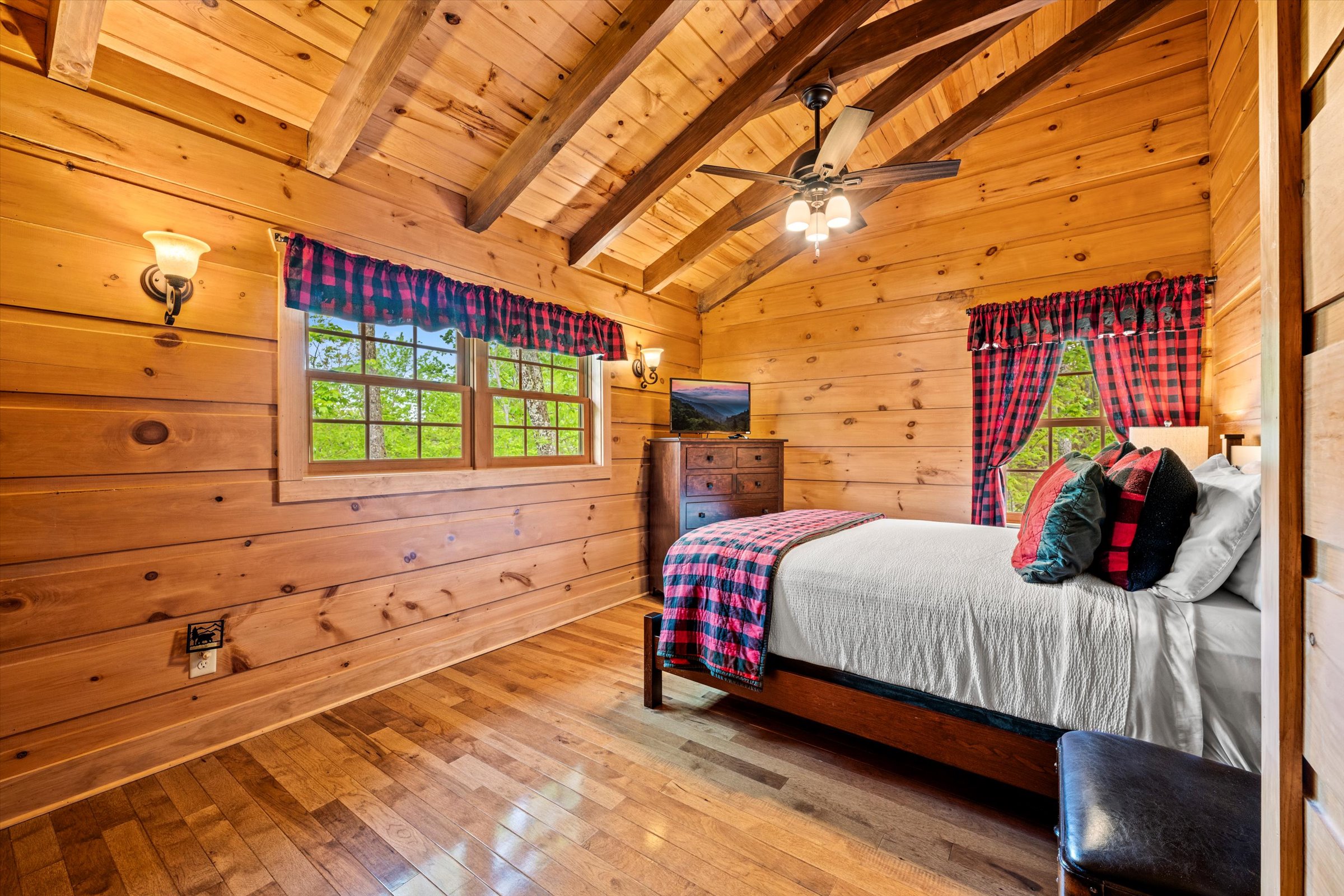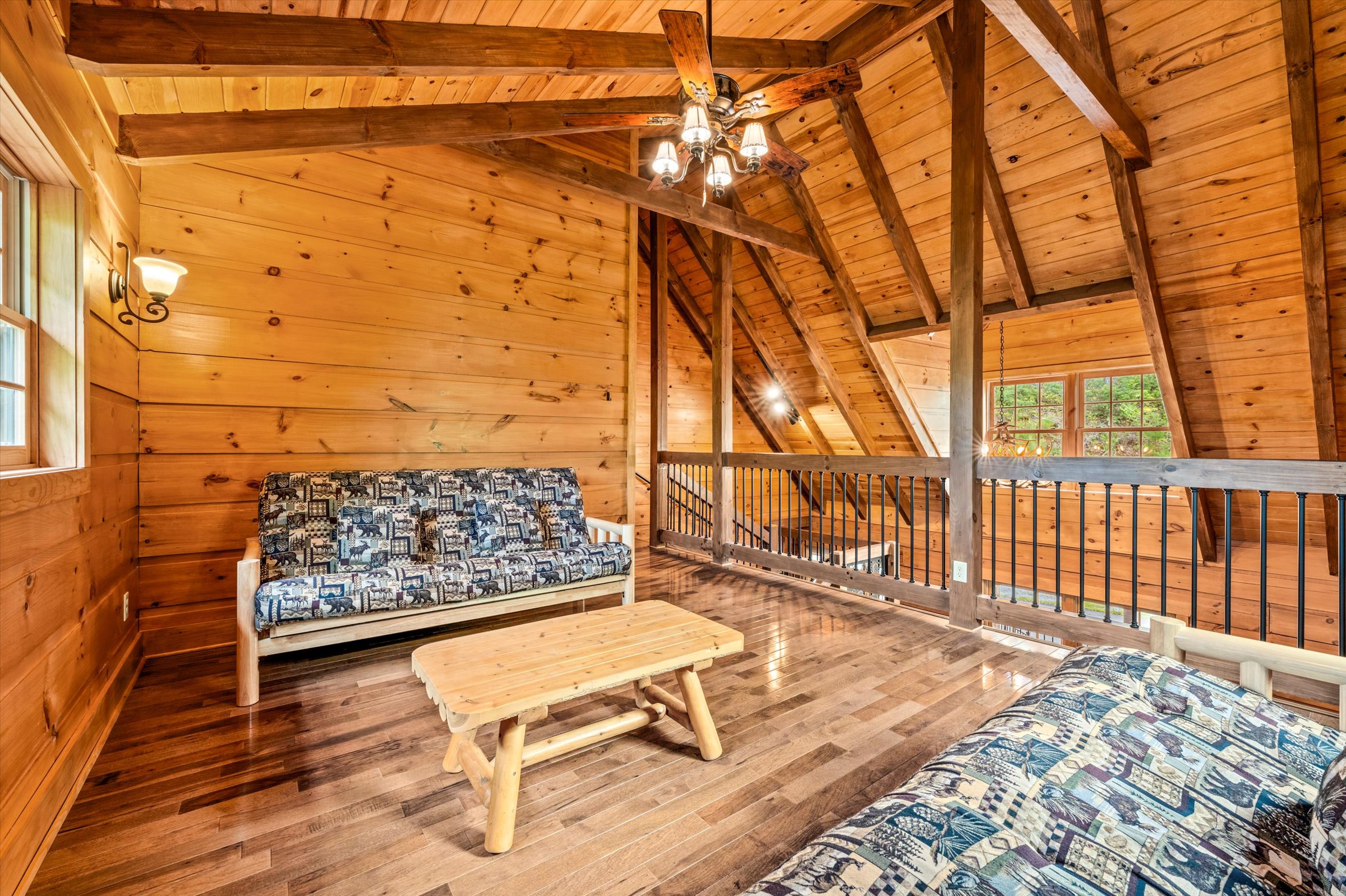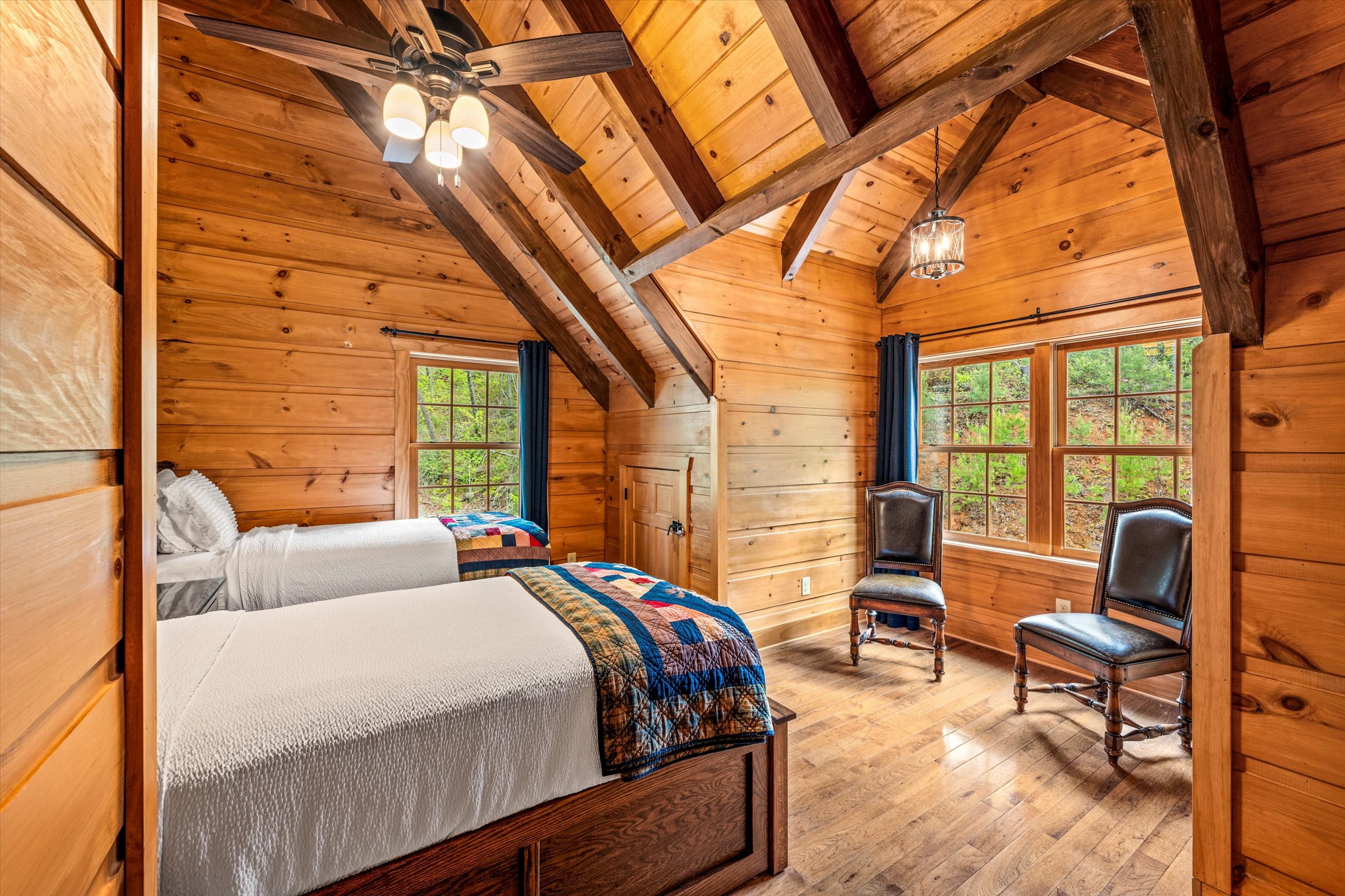 Upstairs, a cozy loft with a sitting area provides a quiet nook for reading or private conversation. Two additional bedrooms are located on this level—one with a queen bed and another with two twin beds. Each room includes a chest of drawers and a flat-screen TV for added convenience.