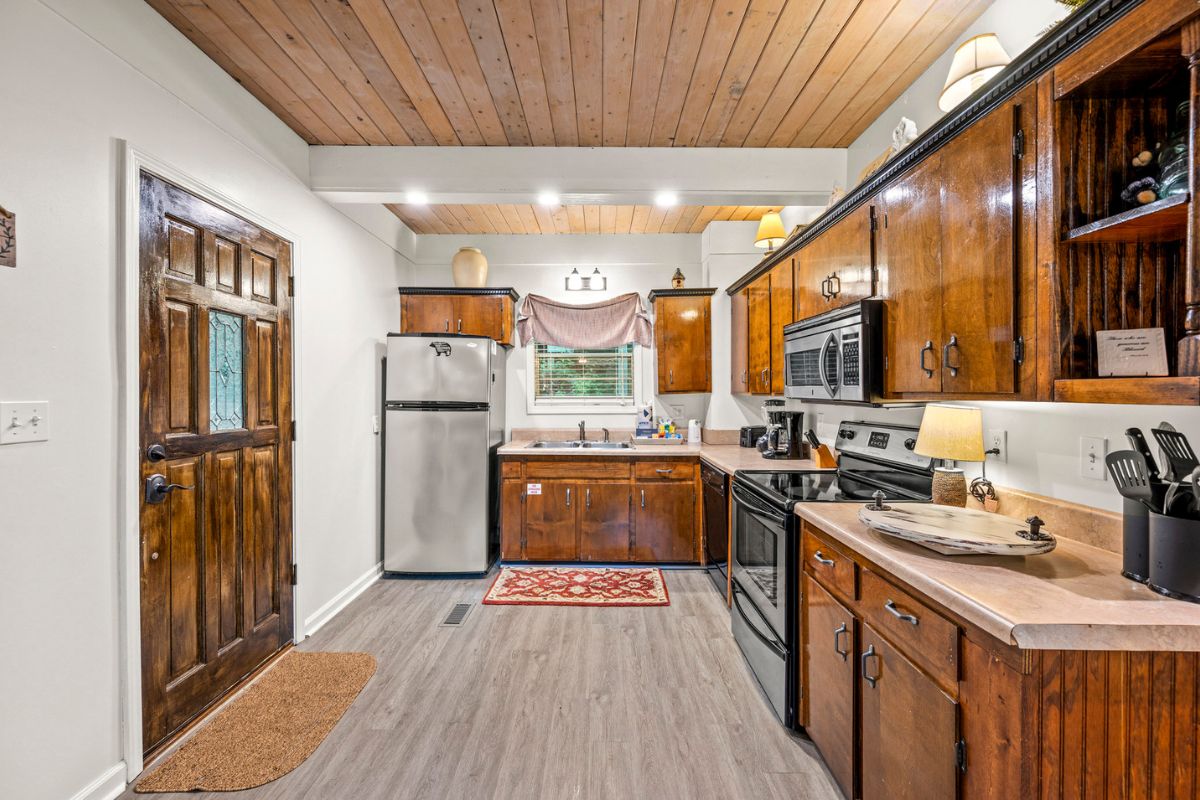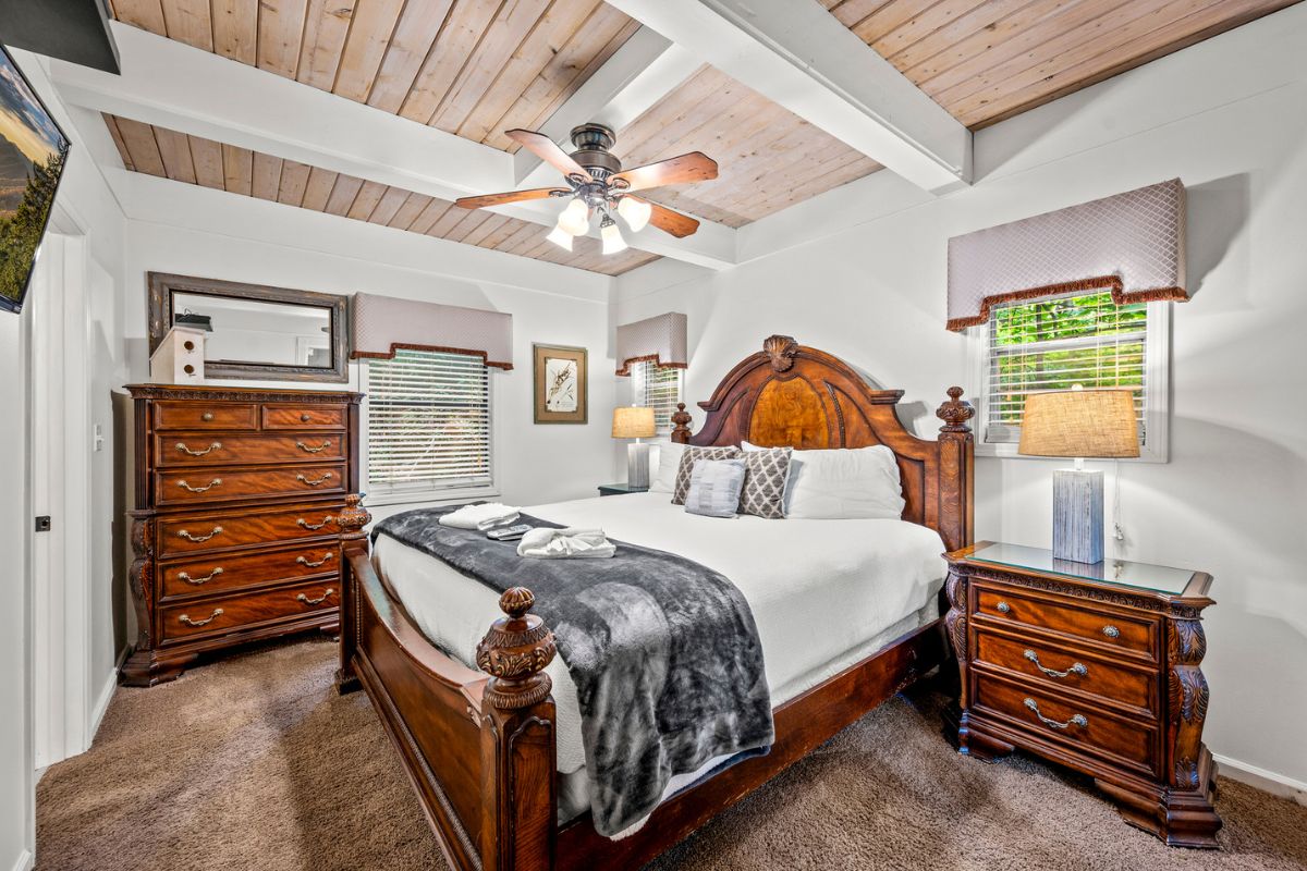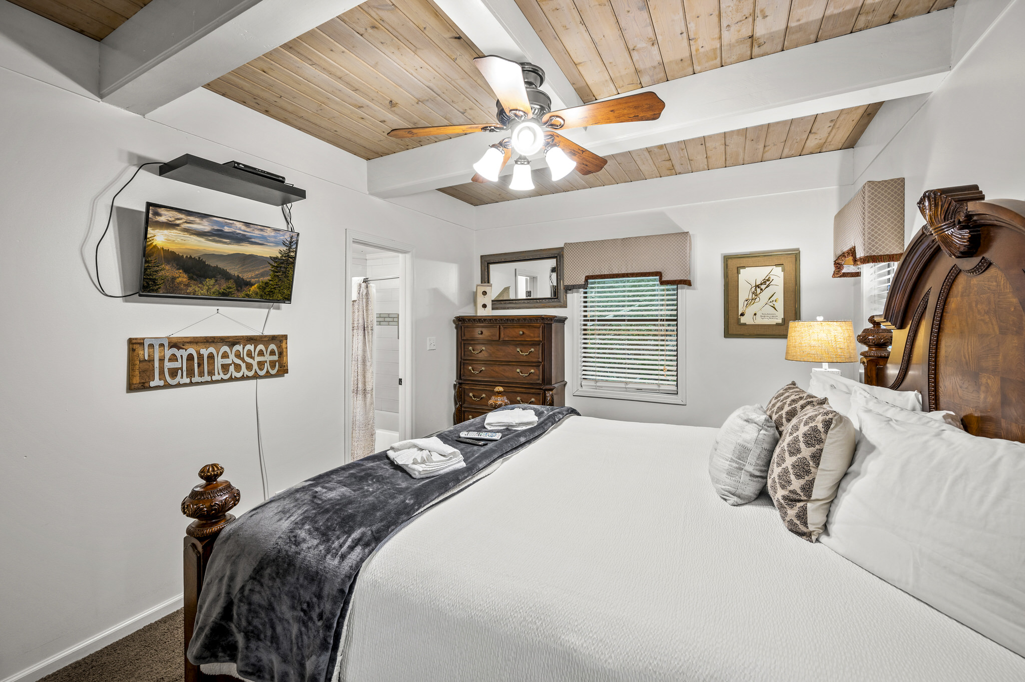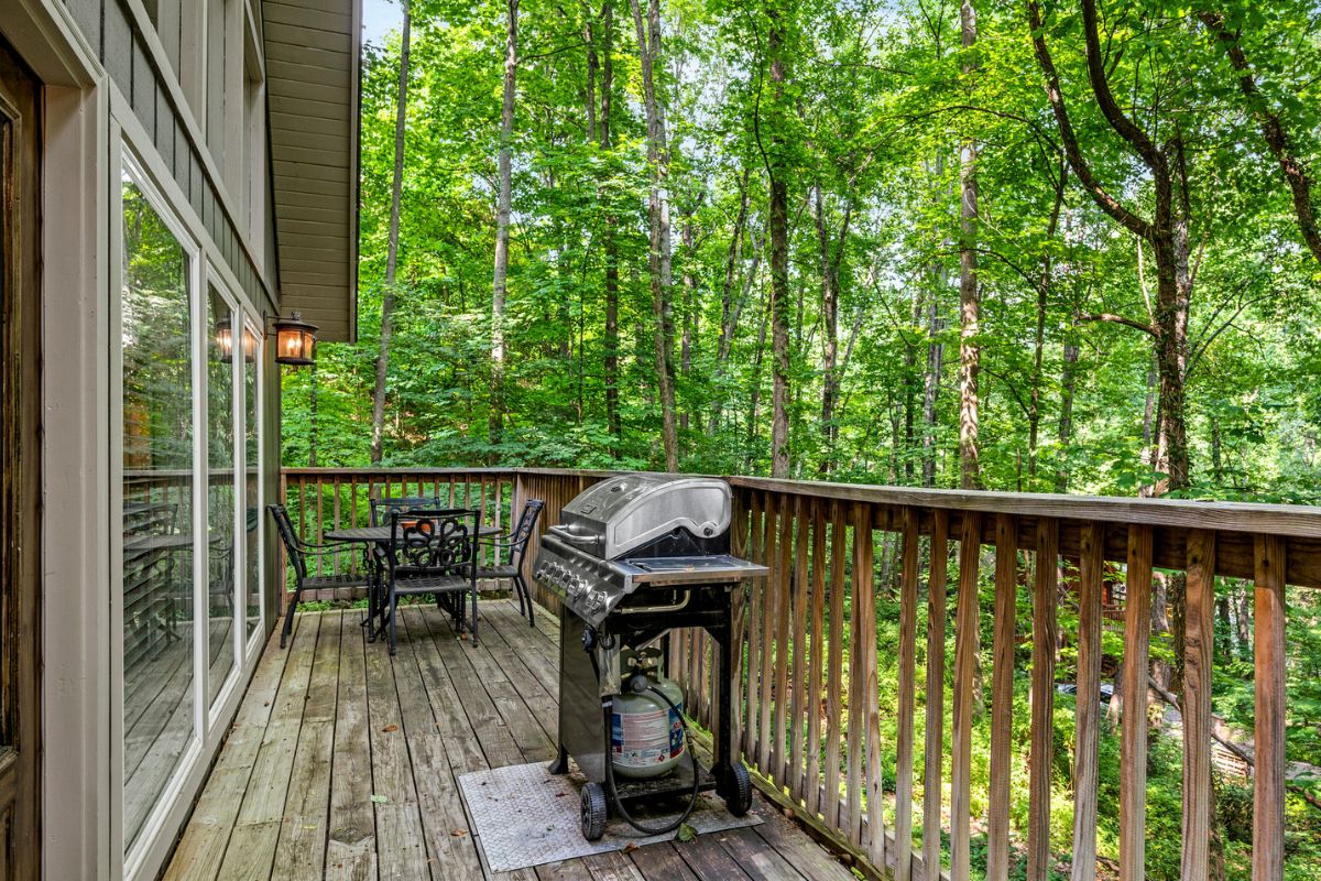 Just beyond the living area, you’ll find a large king bedroom, complete with a full ensuite bathroom featuring a shower/tub combo. The main level also offers a deck for moments when guests want to enjoy the serenity of the Smokies.