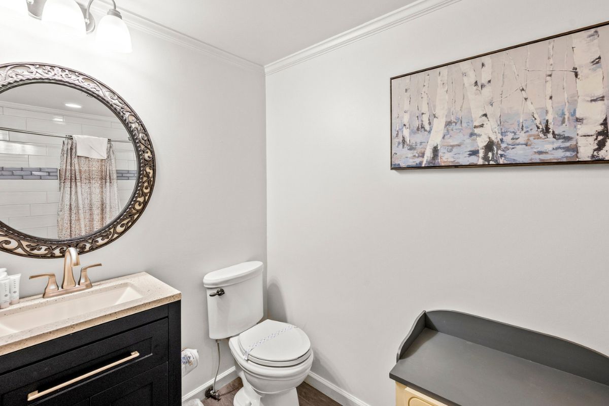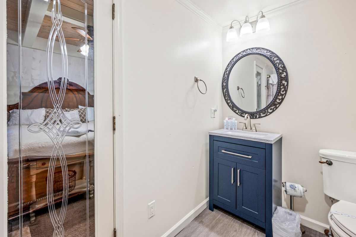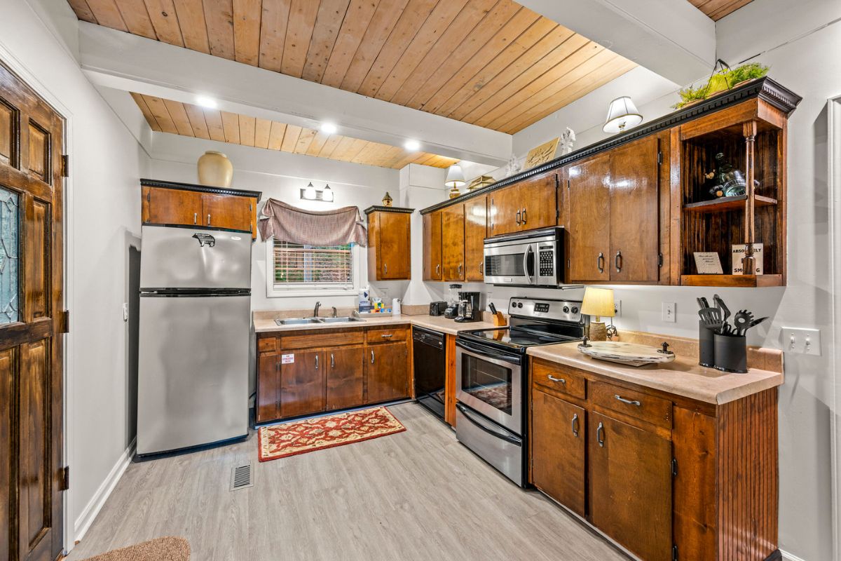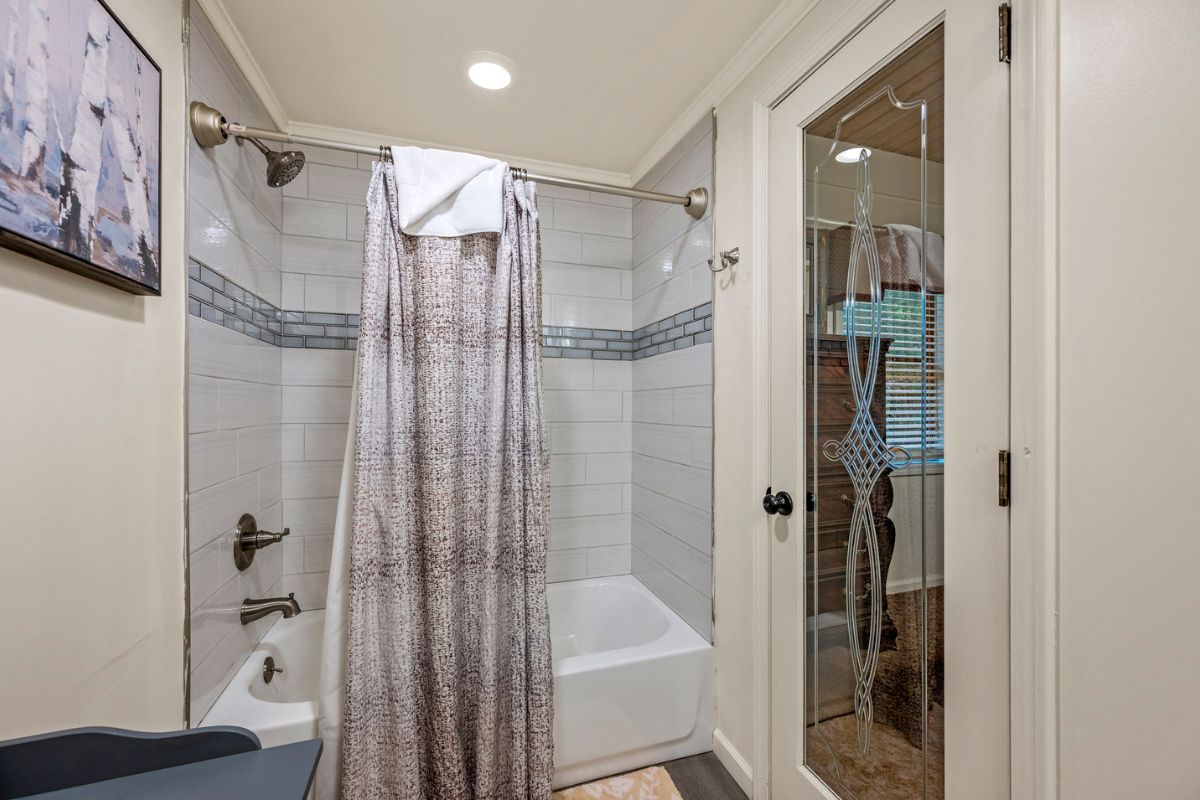 Just beyond the living area, you’ll find a large king bedroom, complete with a full ensuite bathroom featuring a shower/tub combo. The main level also offers a deck for moments when guests want to enjoy the serenity of the Smokies.