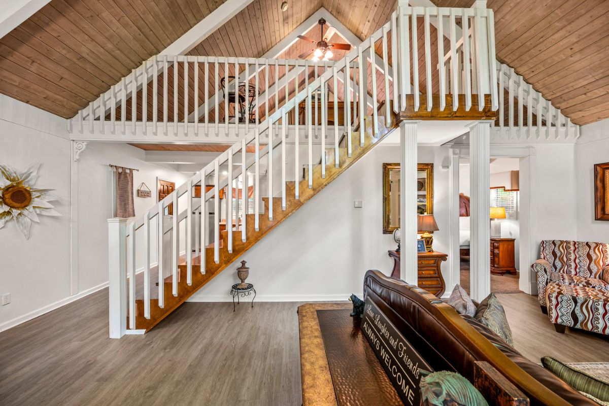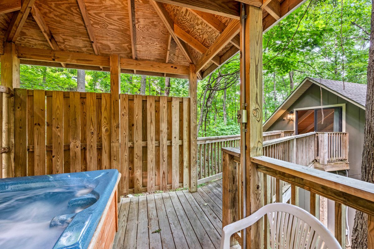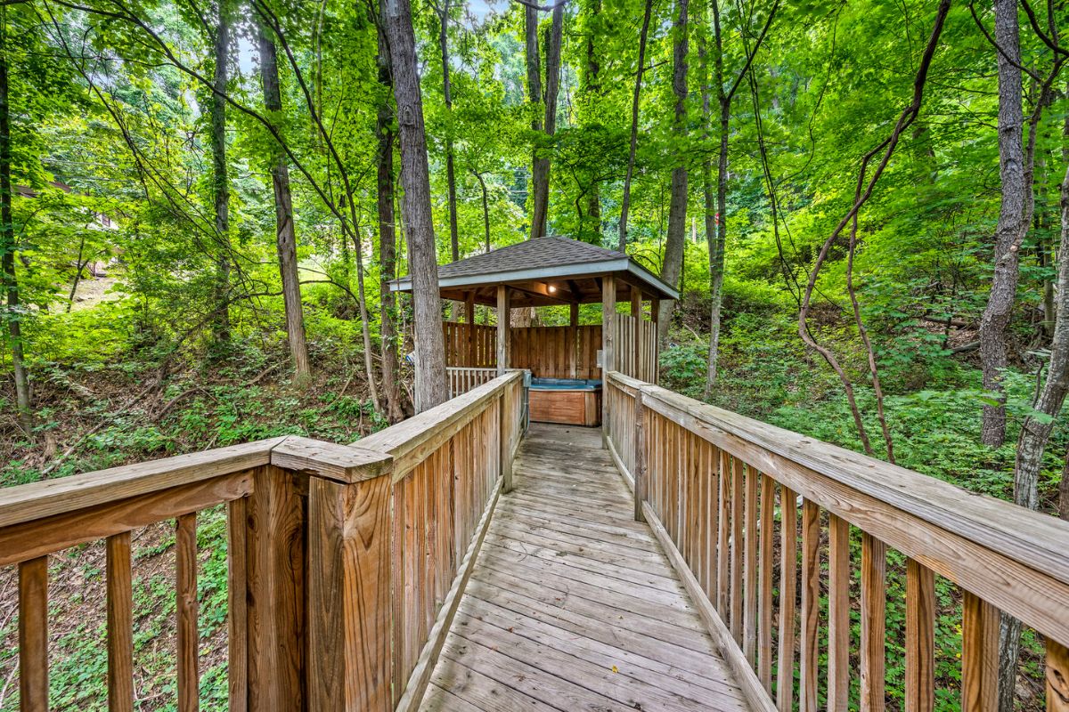 Through the loft's sliding glass door, a wooden walkway leads to a covered hot tub pavilion – your private oasis to soak away stress surrounded by nature's beauty.