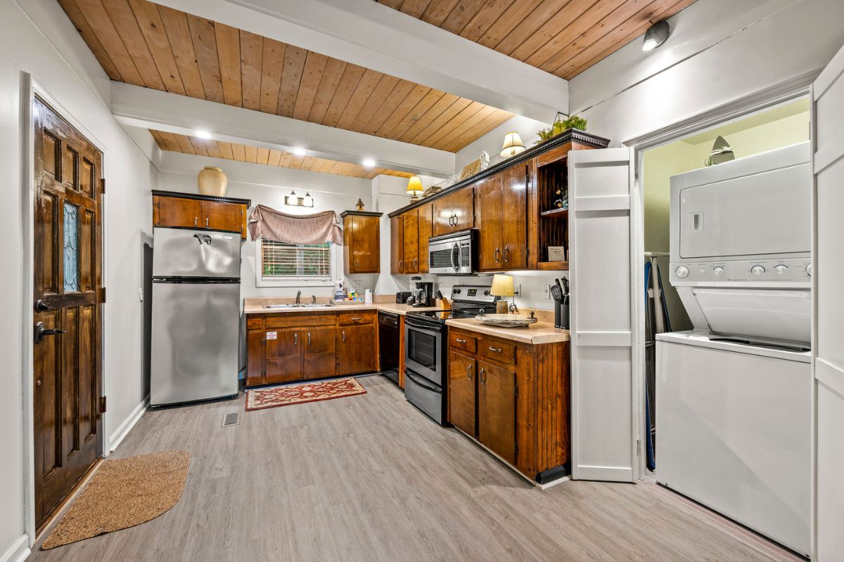 Step inside, and you'll be welcomed by an inviting open-concept living area. Sink into the large sofa and oversized chair around a stone (gas) fireplace, with entertainment at your fingertips courtesy of a TV (complete with cable and a BluRay player). The dining area beckons for shared meals and friendly game nights, while the fully-equipped kitchen simplifies home-cooked delights – just bring your groceries! And don't miss the convenience of a laundry closet with a stackable washer and dryer.