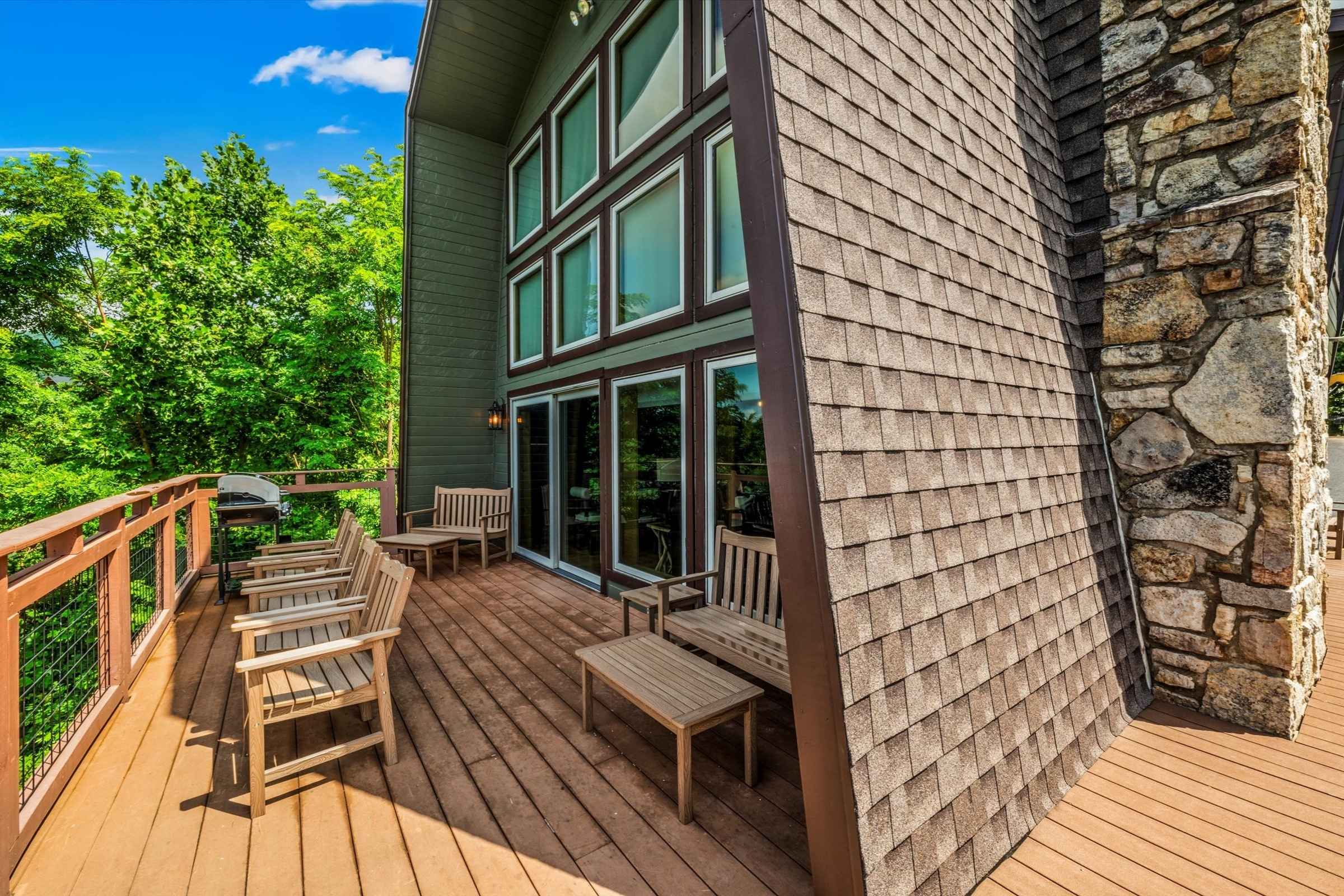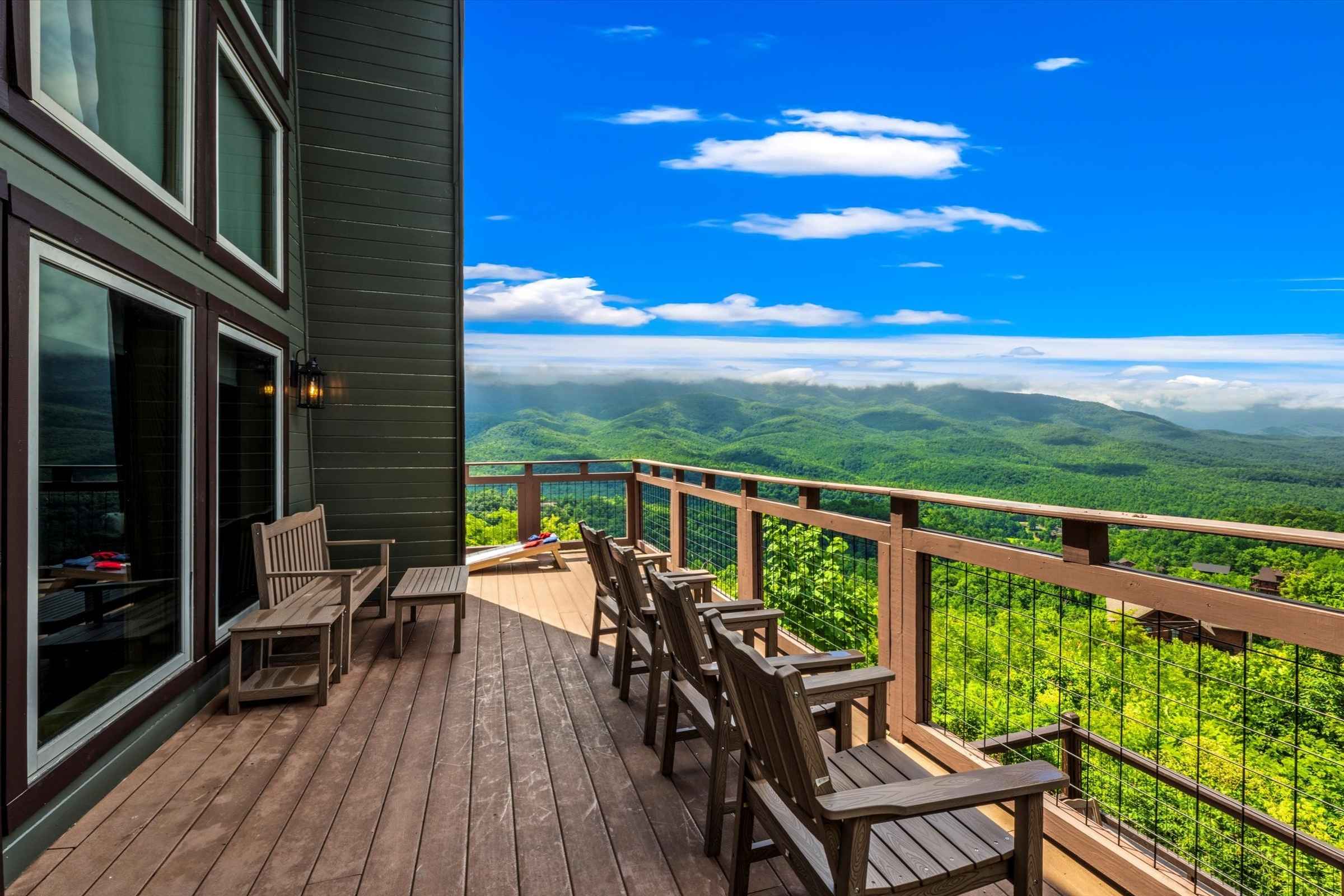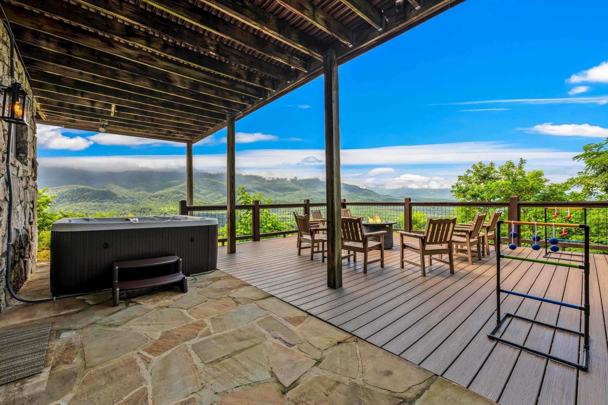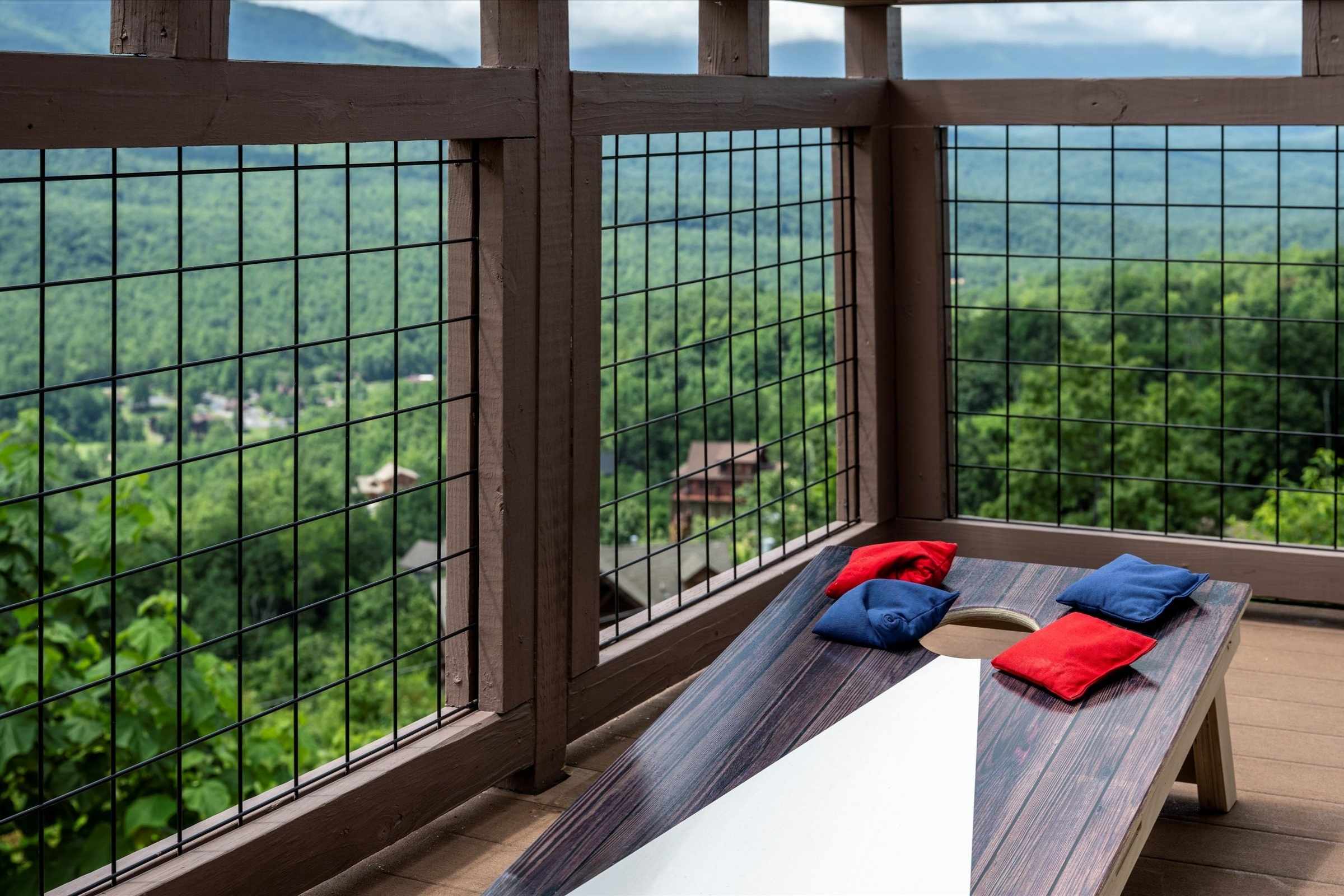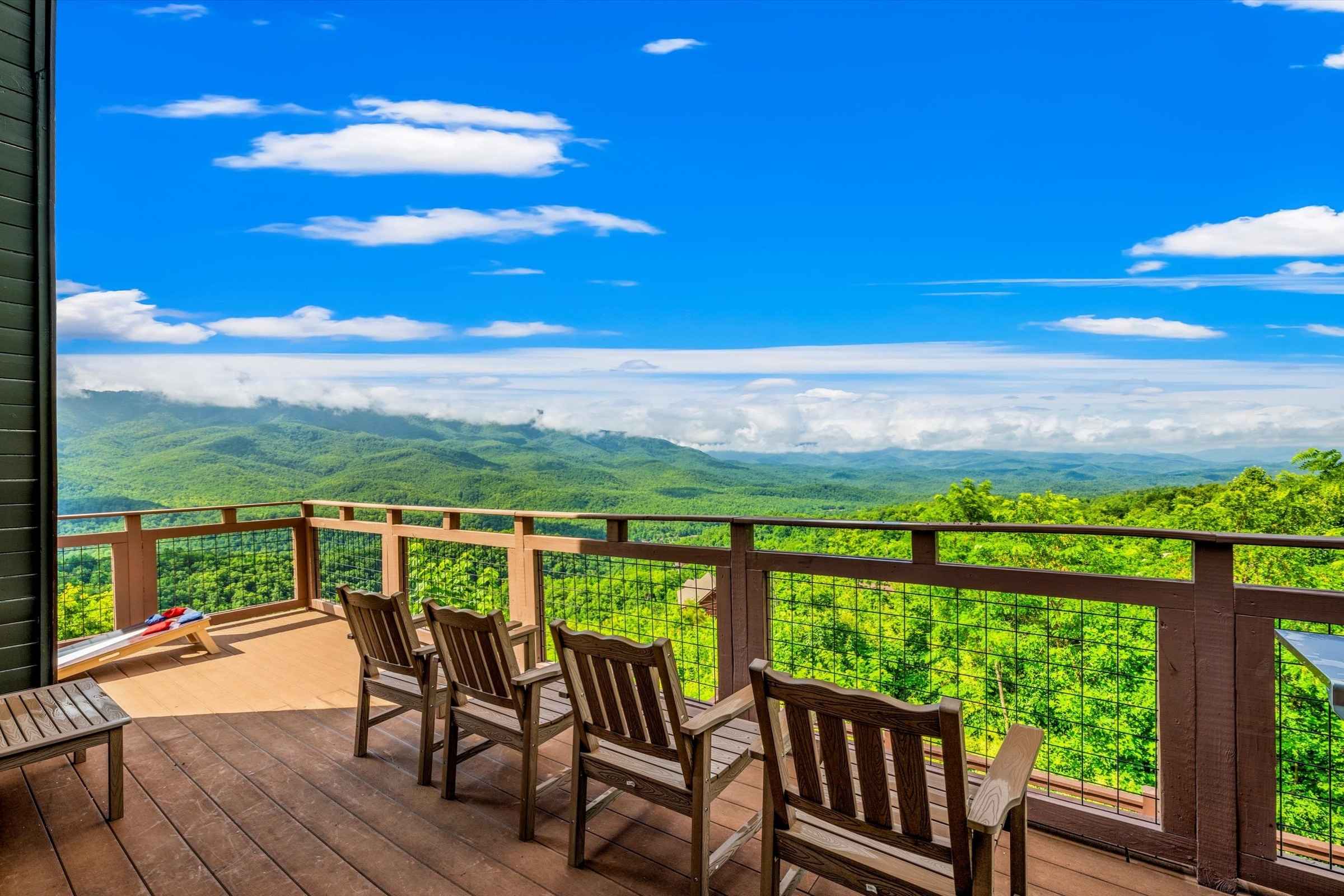 The main level deck offers even more seating and mountain views, plus a large gas grill ideal for barbecuing with family and friends. A set of cornhole boards is also available, perfect for a little friendly competition.