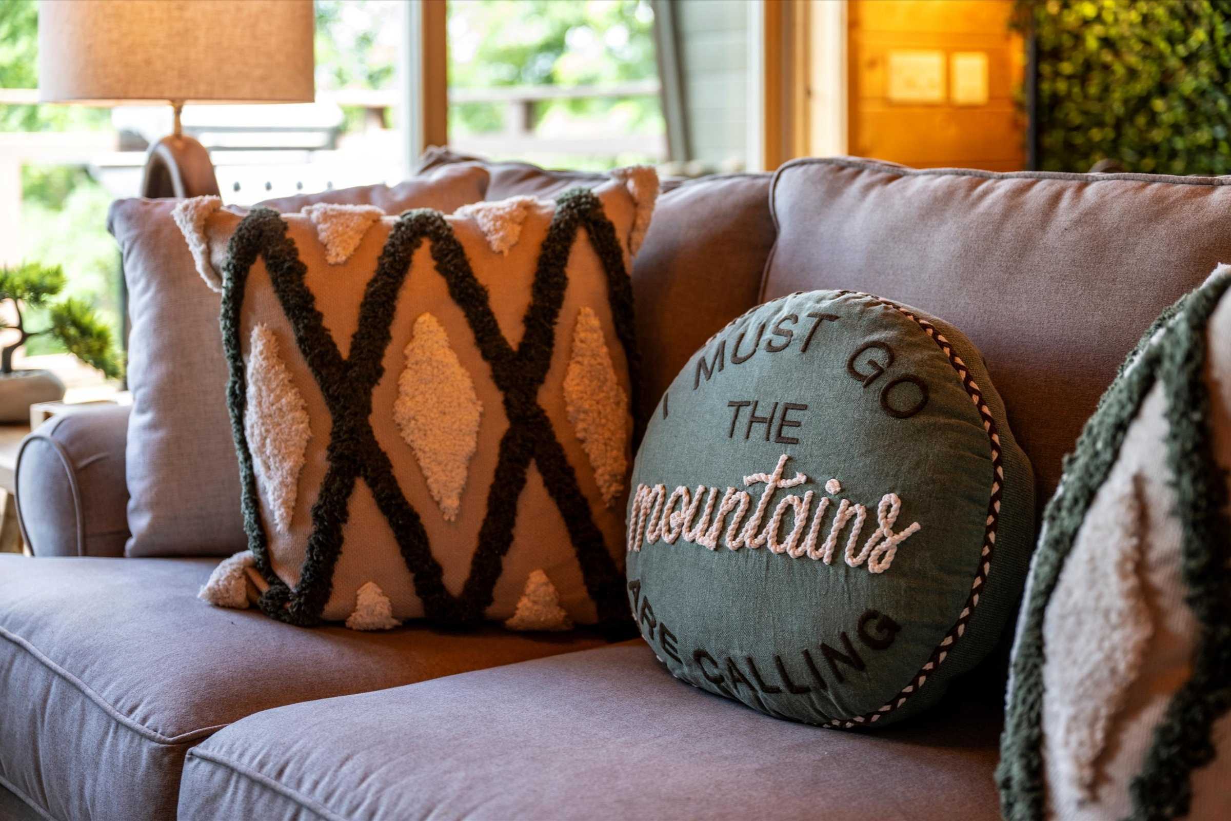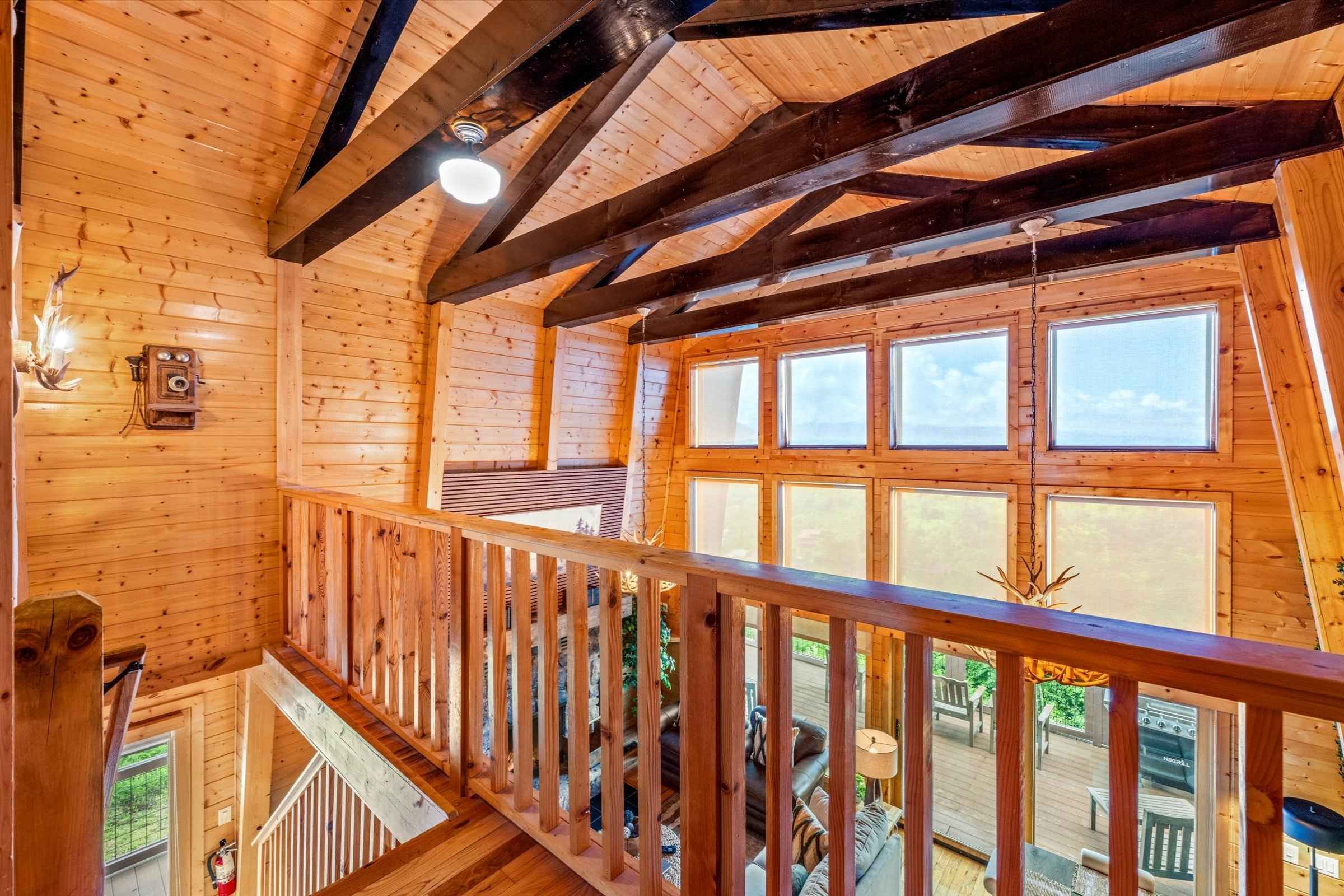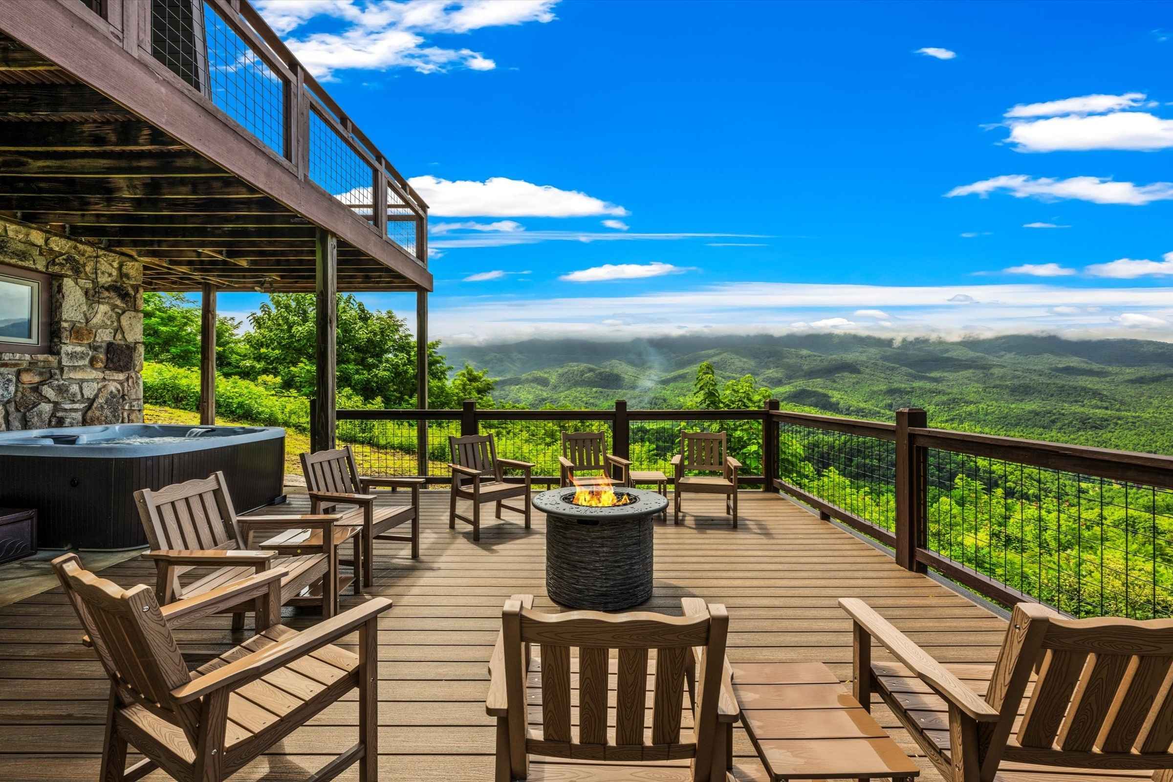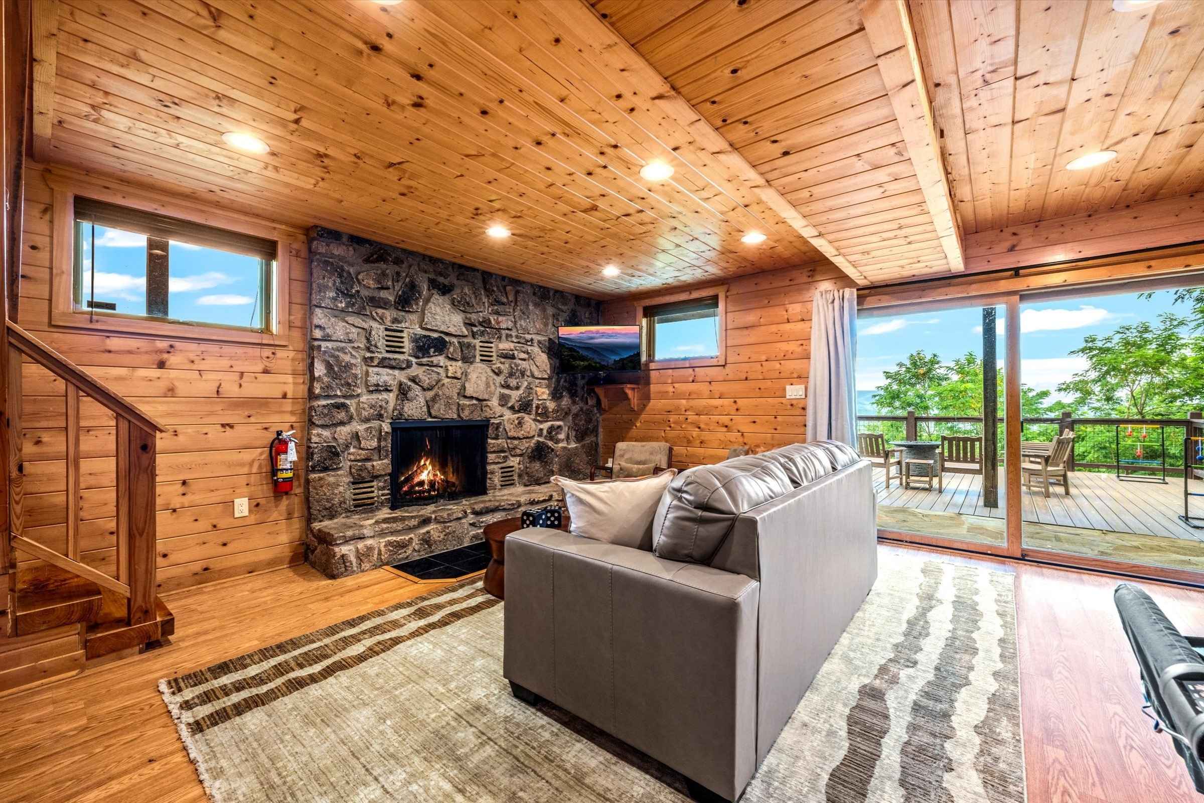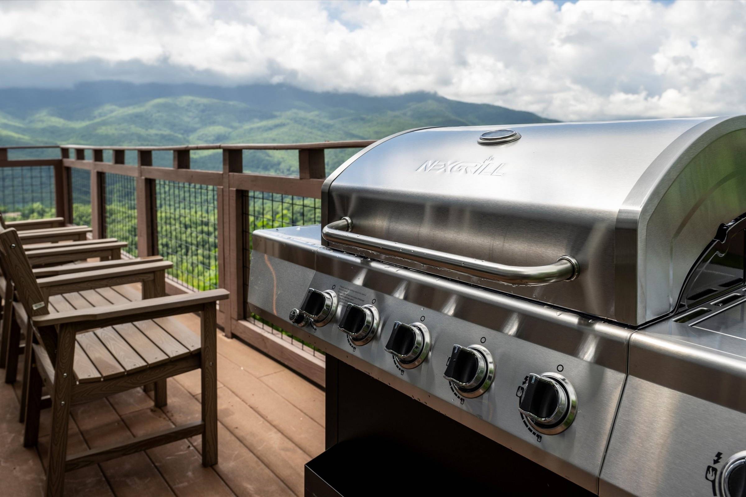 The main level deck offers even more seating and mountain views, plus a large gas grill ideal for barbecuing with family and friends. A set of cornhole boards is also available, perfect for a little friendly competition.