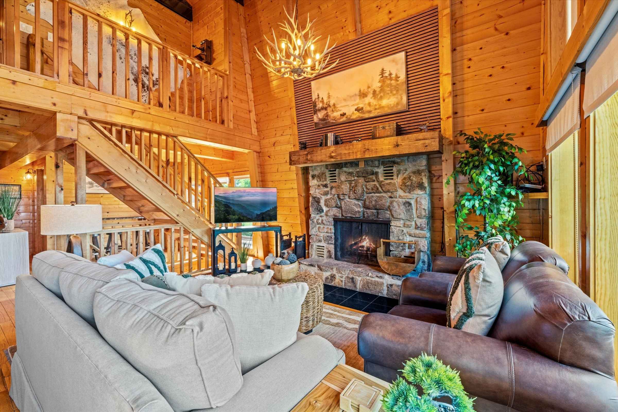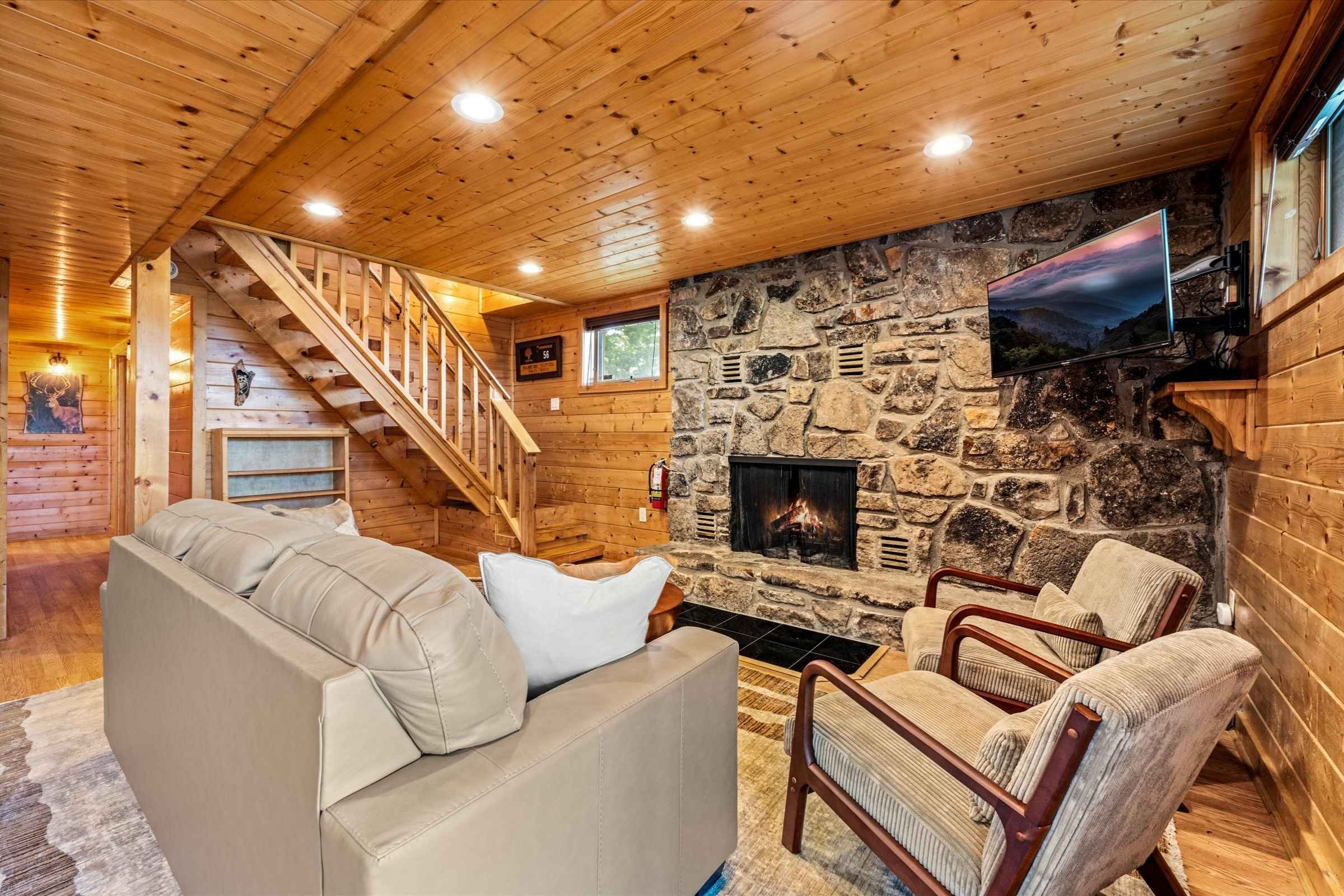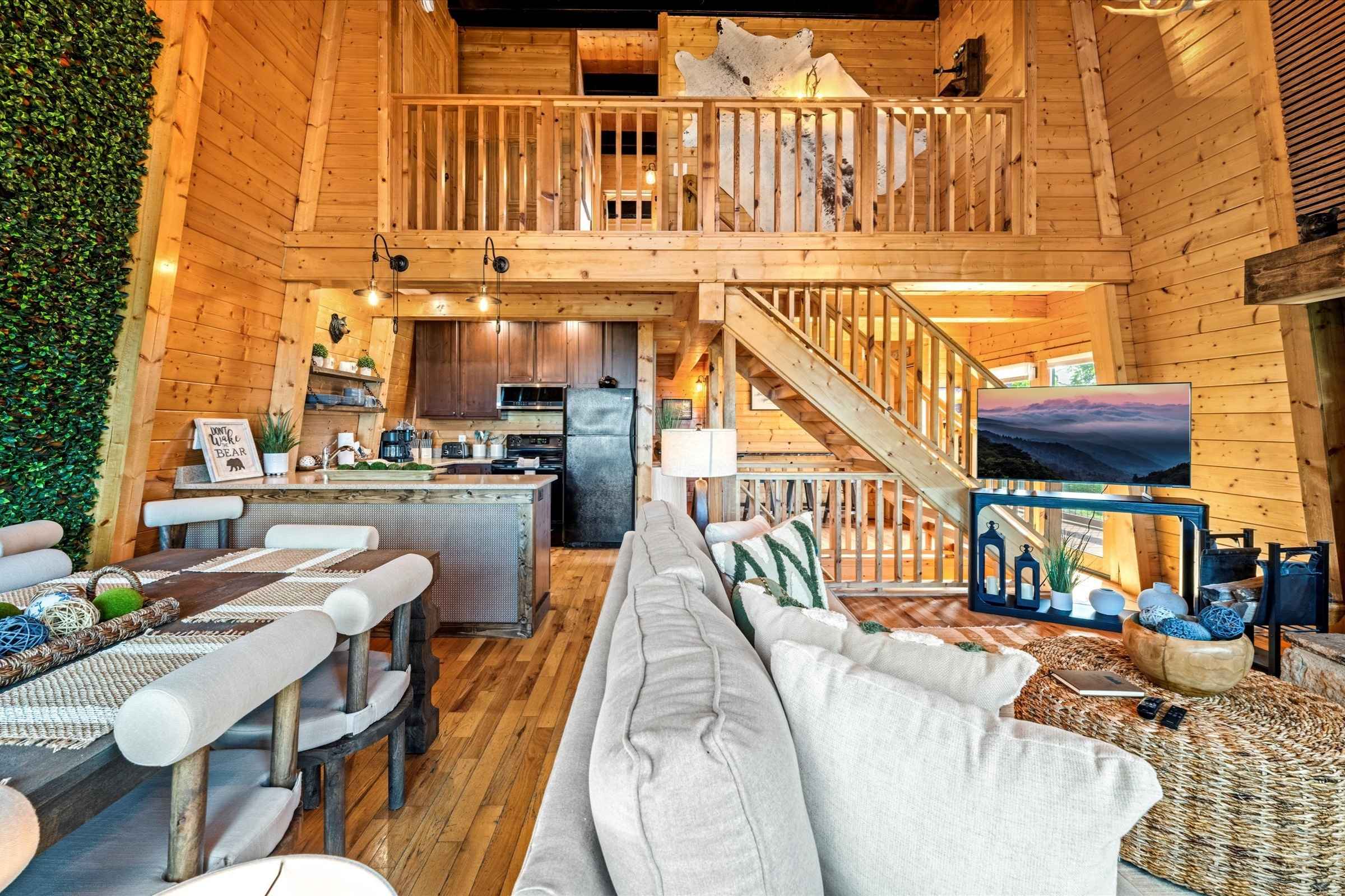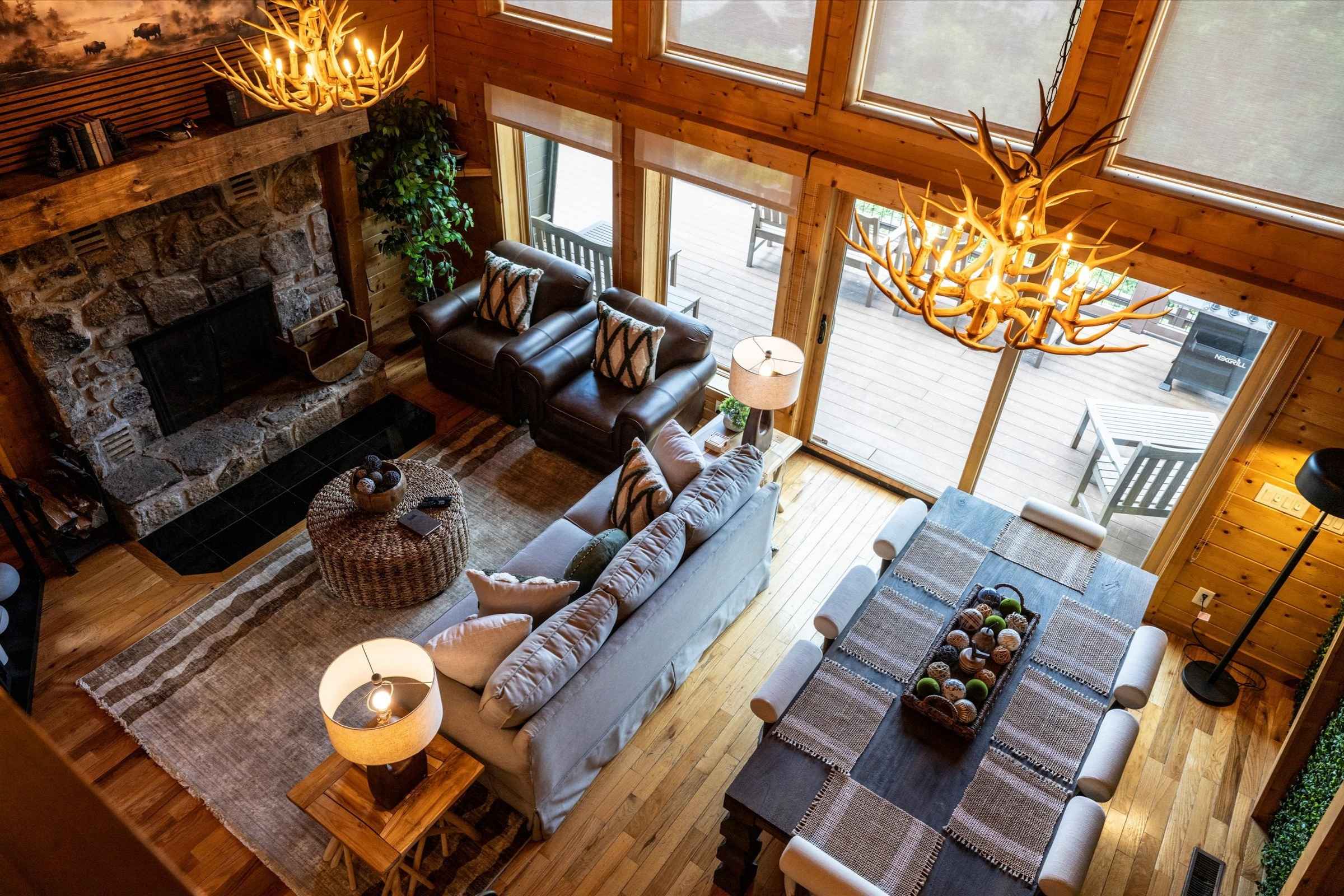 As you enter the home, deep, warm wood tones and high-end finishes set the tone for a memorable stay. The bright open-concept living area is designed for gathering and relaxation, featuring plush new furnishings, a large stone fireplace, and a flat-screen SmartTV—perfect for streaming shows or watching the big game.
