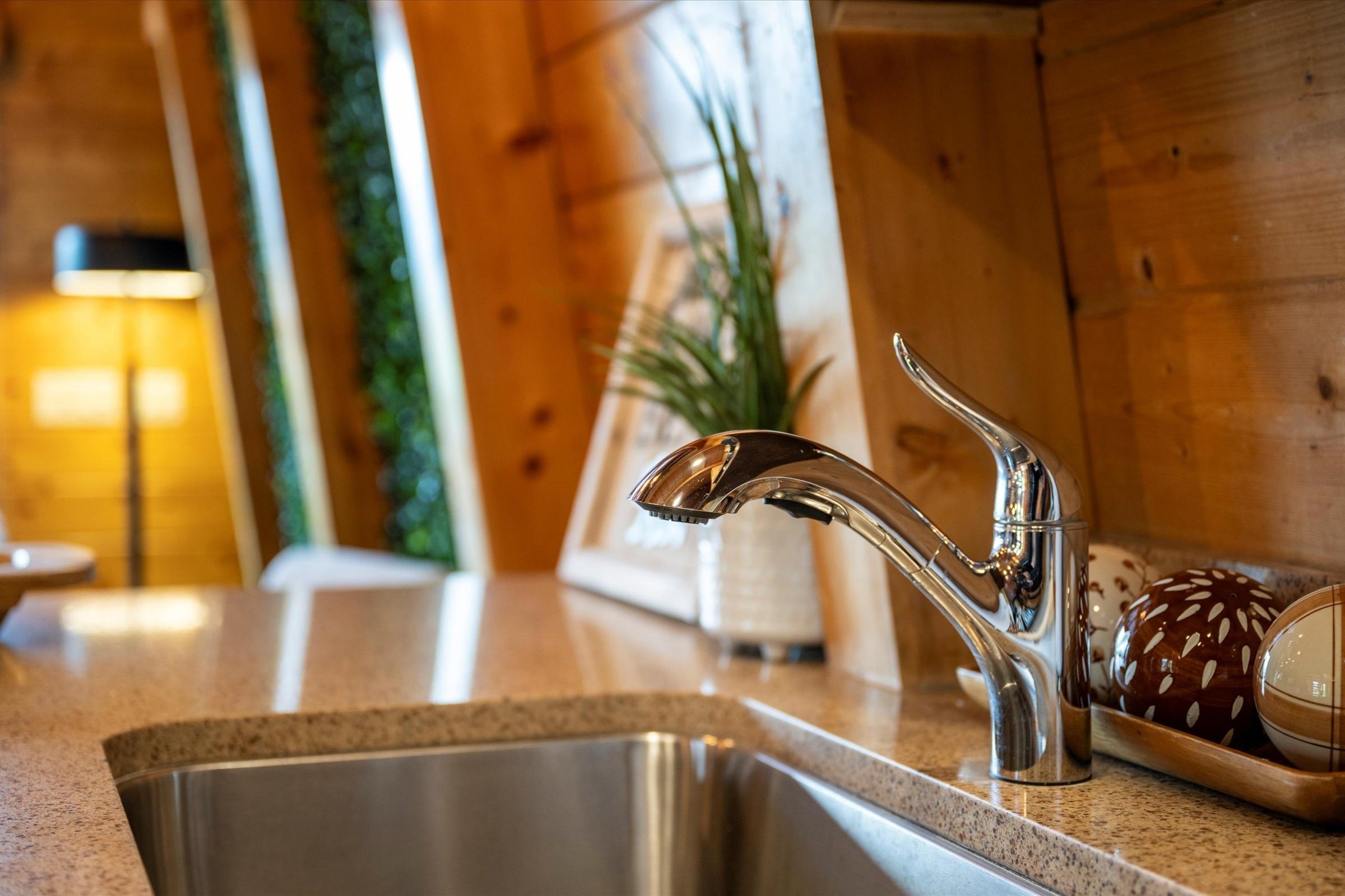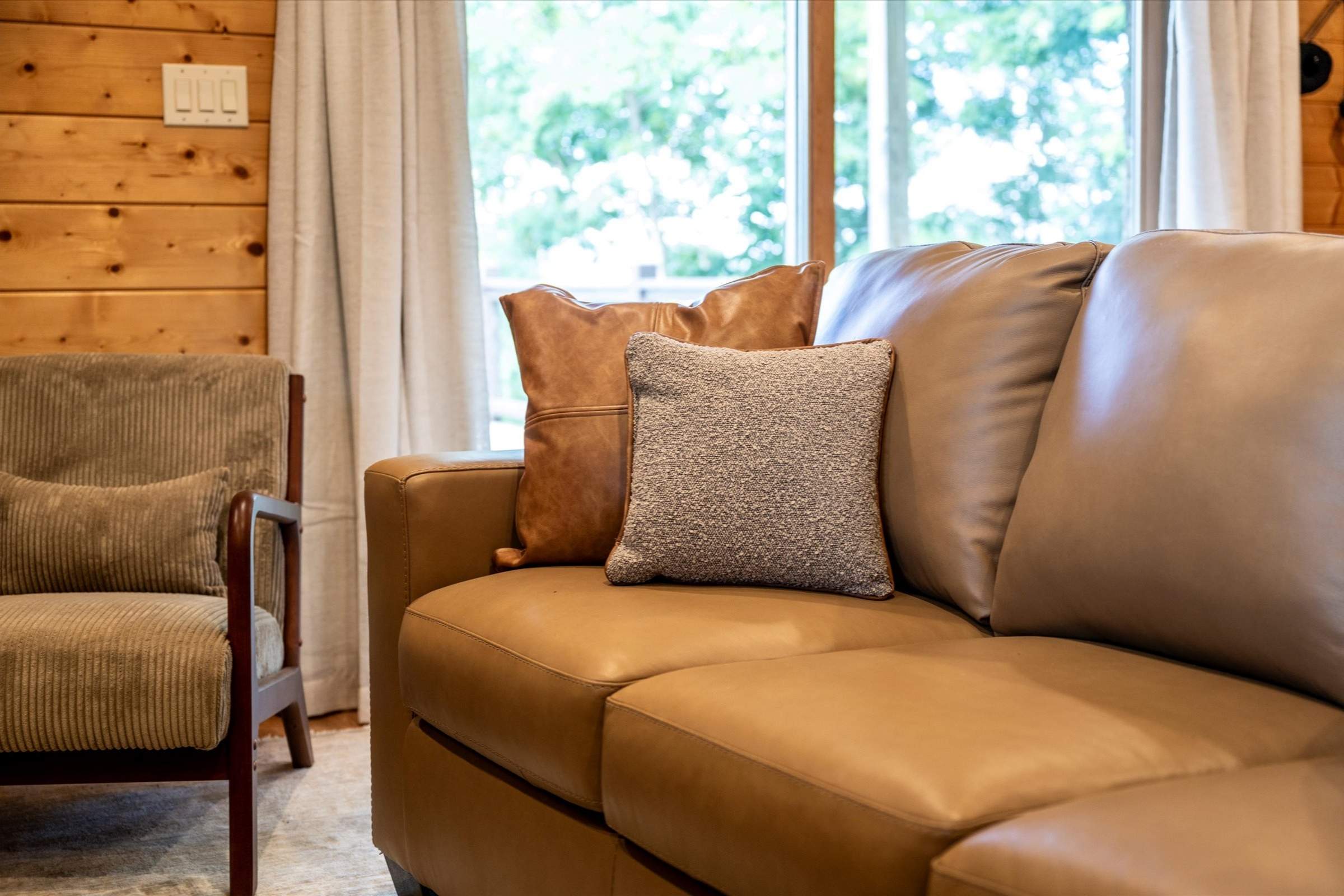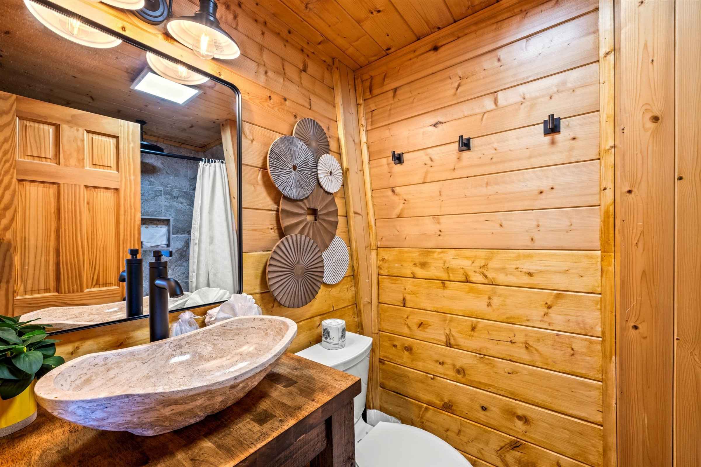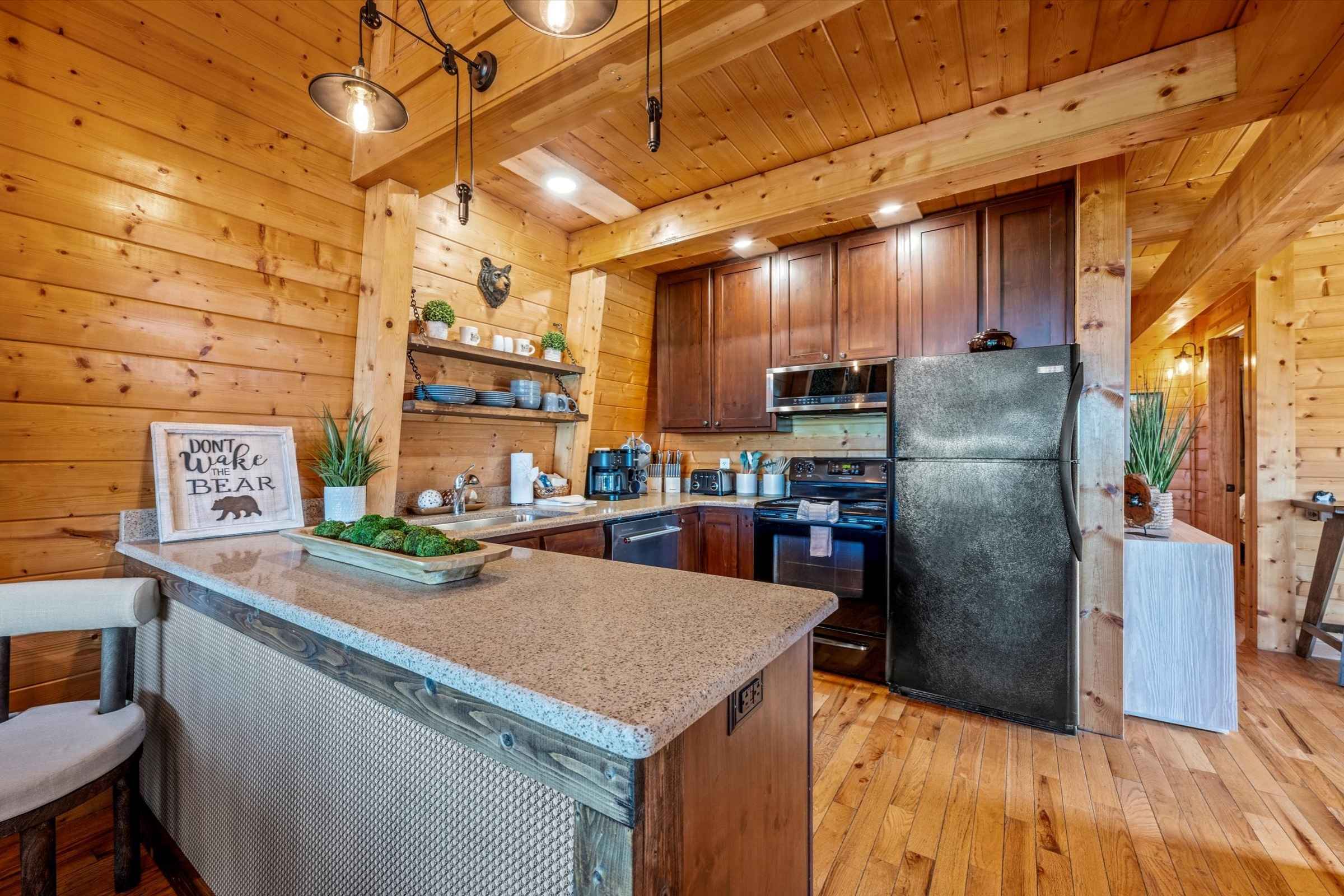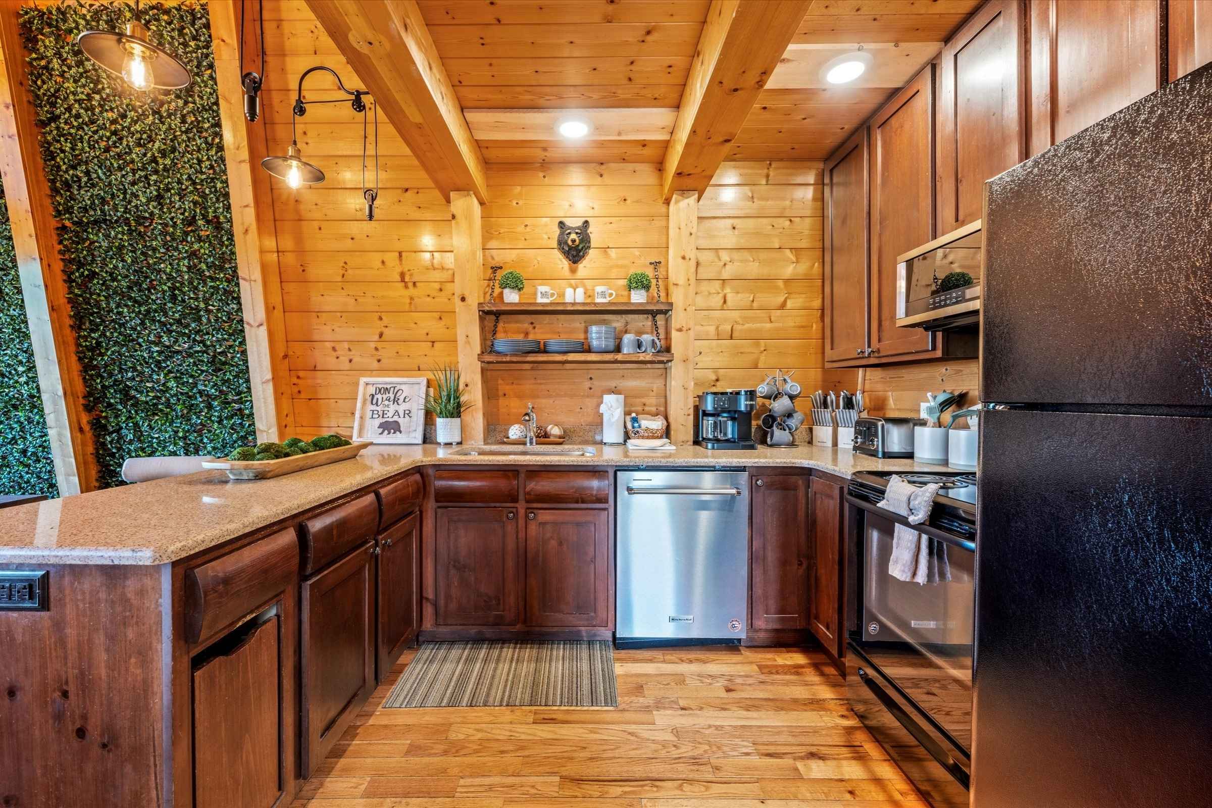 As you enter the home, deep, warm wood tones and high-end finishes set the tone for a memorable stay. The bright open-concept living area is designed for gathering and relaxation, featuring plush new furnishings, a large stone fireplace, and a flat-screen SmartTV—perfect for streaming shows or watching the big game.